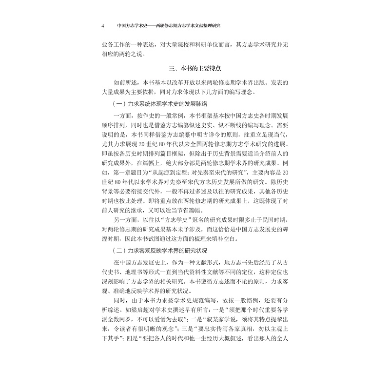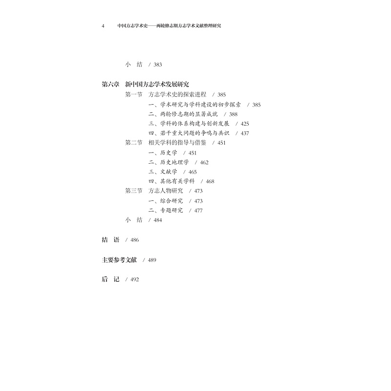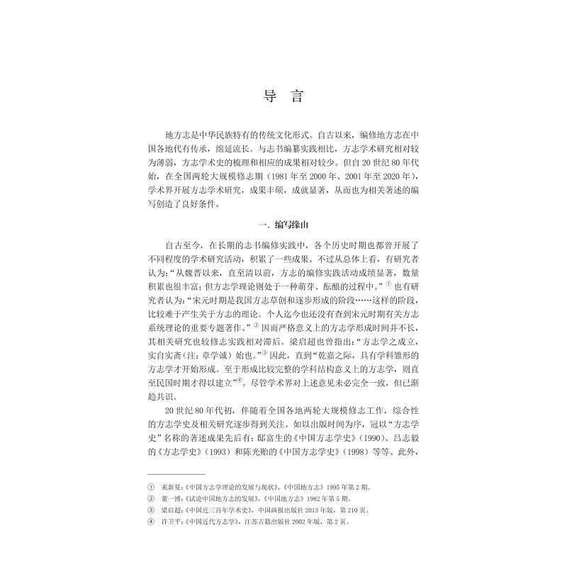 改革开放以来全国两轮大规模“盛世修志”(1981—2000;2001—2020)并延续至今的发展历程,无疑是方志史上最为辉煌也是研究成果最为丰硕的时期。为此本书在“两轮修志期方志学术文献整理研究”基础上,以大量成果为依据,共分为六章,前三章纵向考察了从先秦直至民国时期方志学术史的发展过程。后三章则借鉴方志“明古详今”的编纂理念,以大量篇幅重点梳理了新中国成立以来方志事业的发展过程,并通过总结经验、提炼规律,借以构架学术史的整体框架。