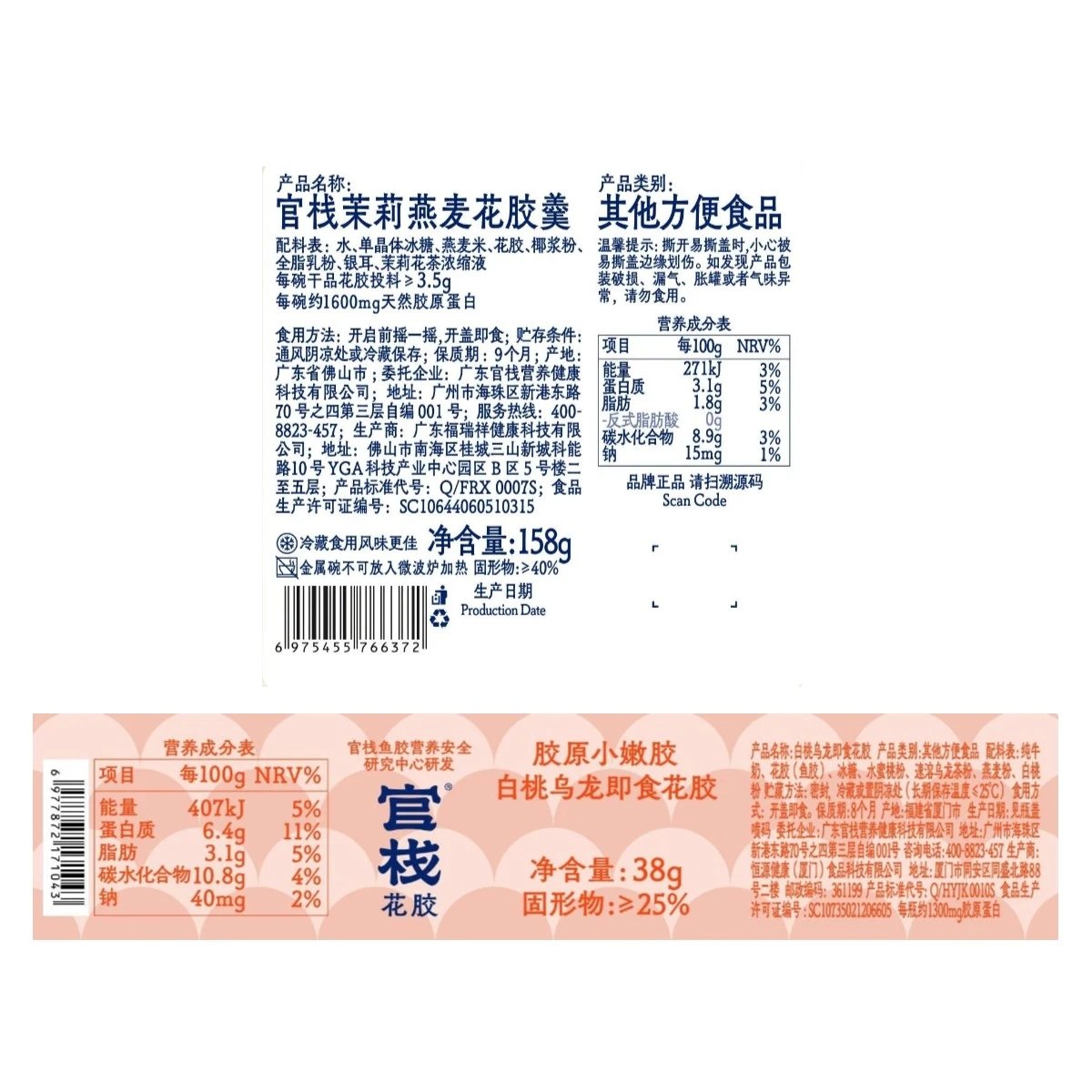买花胶还是要认准大品牌 ✅在花胶界里,官栈妥妥的大佬,年年稳坐销量榜的冠军宝座,在TM、JD和抖音排名都非常靠前! ✅不管是用户口碑、产品品质还是滋补效用,都可以放一百个心 ✅ 行业第一,连续五年全国销售额领先,好评率99% ✅ 京东/天猫/抖音三平台花胶类目霸榜TOP1 【品牌】官栈 【品名】 官栈花胶胶原大满贯套餐18件 【规格】16瓶+多送1瓶*白桃乌龙小嫩胶38g+1碗*花胶羹158g【送】礼袋1个 【产地】广东/福建/上海 【发货时效】72小时 【生产日期】 小嫩胶38g:2025年4月及以后; 花胶羹:2025年4月及以后 【保质期】小嫩胶38g:8个月;花胶羹:9个月 【发货地】广东/江苏 【发货快递】三通一达,随机发货,不可指定 【加运区域】新疆、西藏,青海、宁夏、甘肃+10元/组 【不发区域】港澳台不发货 【食用方法】1、开盖即食;2、冰镇冷藏;3、水浴加热 【禁忌人群】经期,感冒发烧,对乳制品及麦麸果仁类食物过敏的人群。 【储藏方法】通风阴凉处