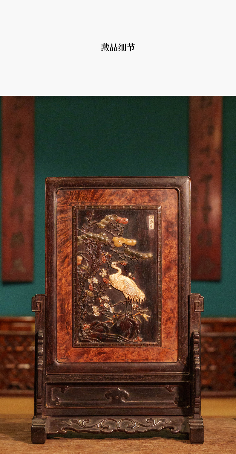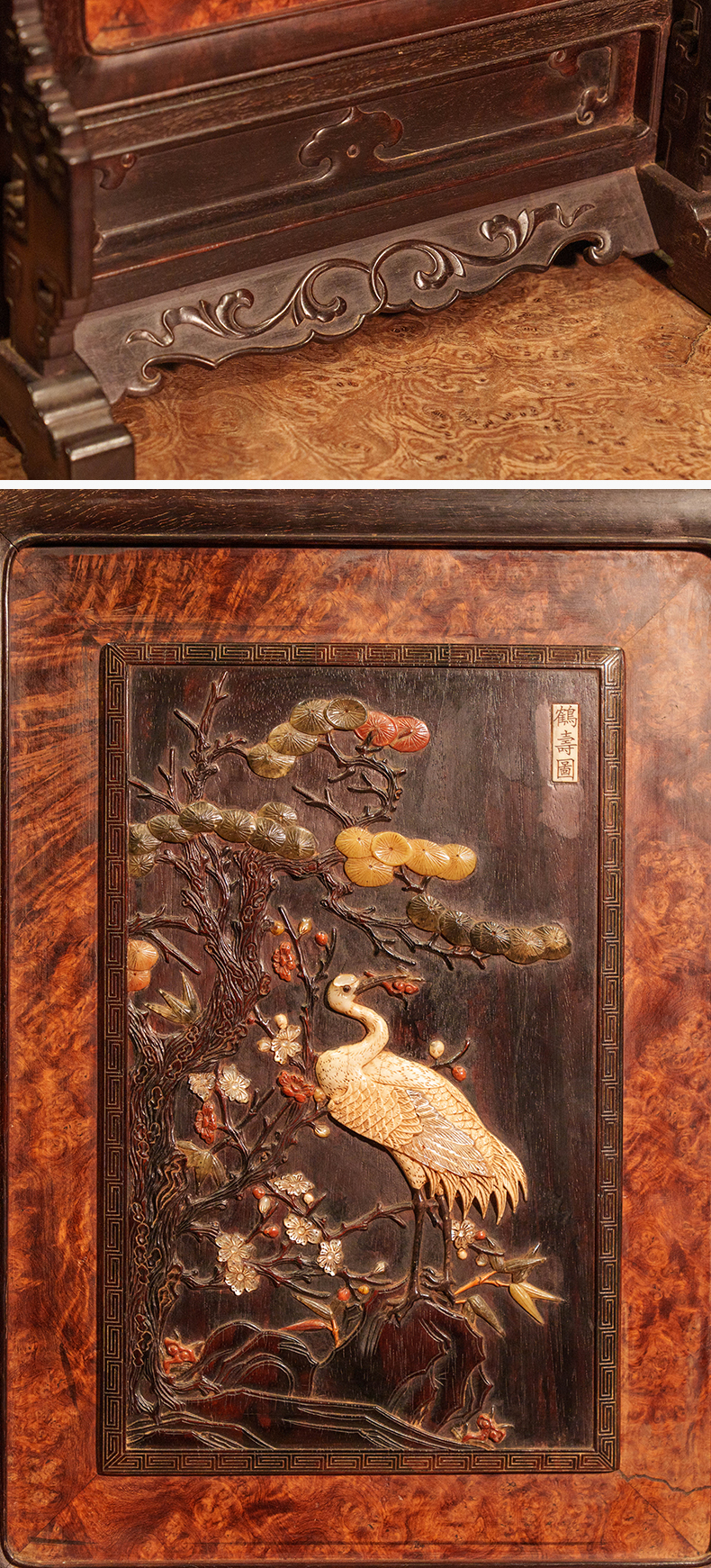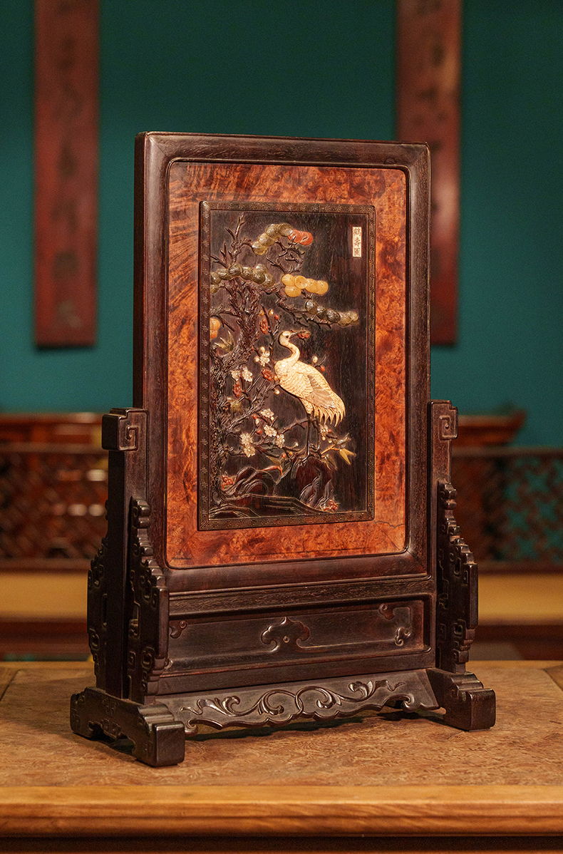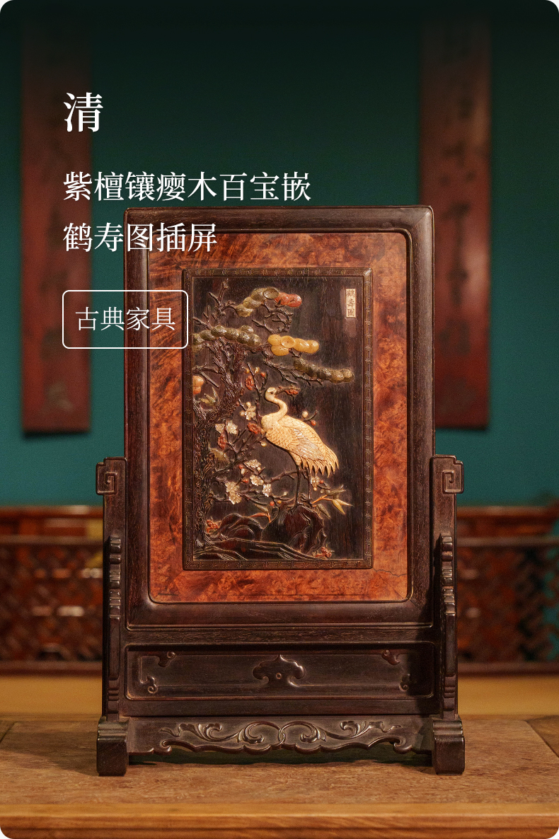清 紫檀镶瘿木百宝嵌鹤寿图插屏