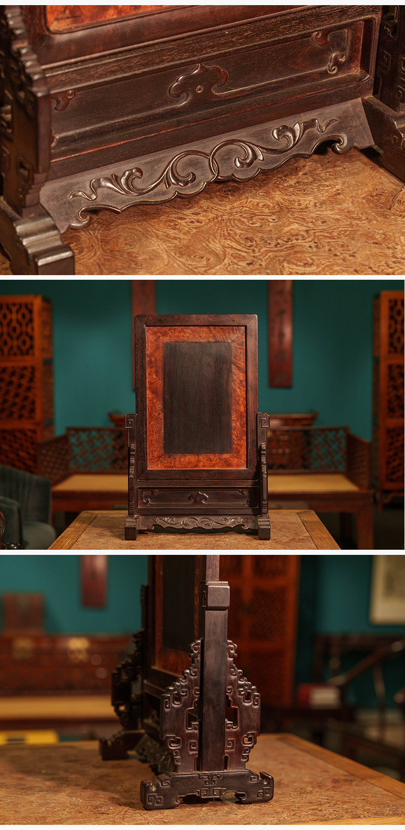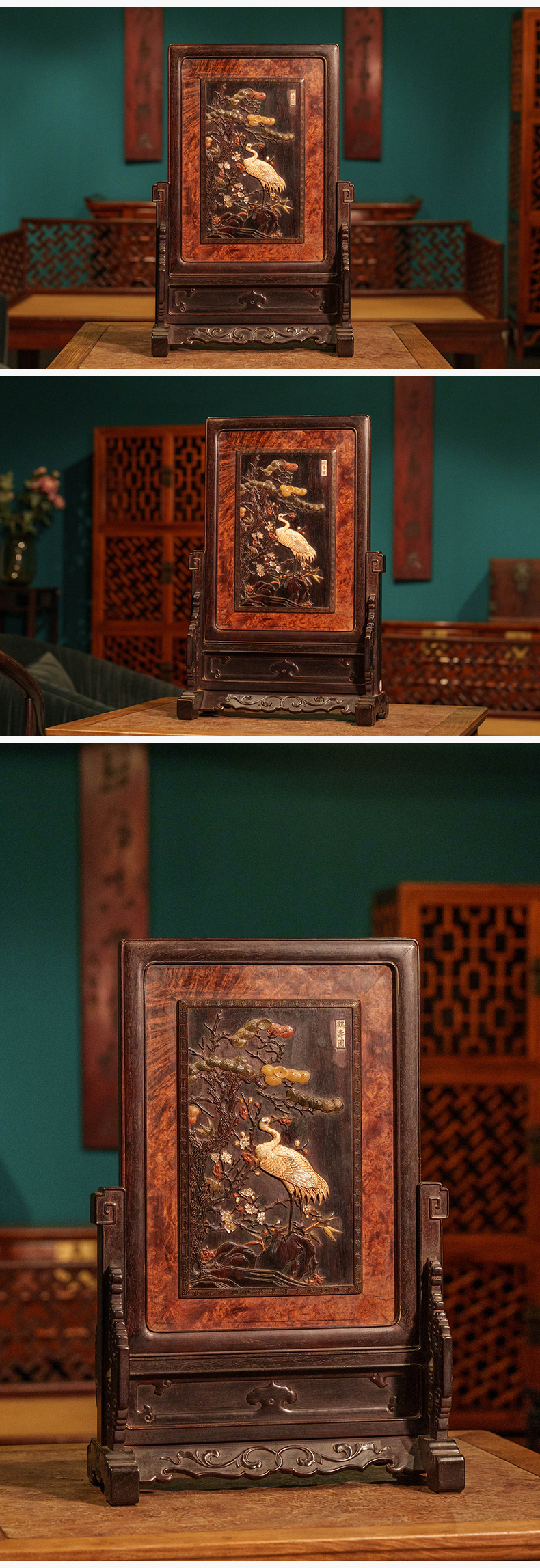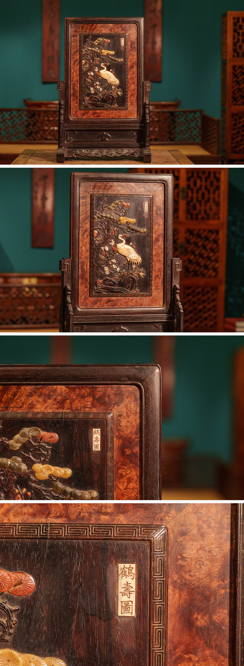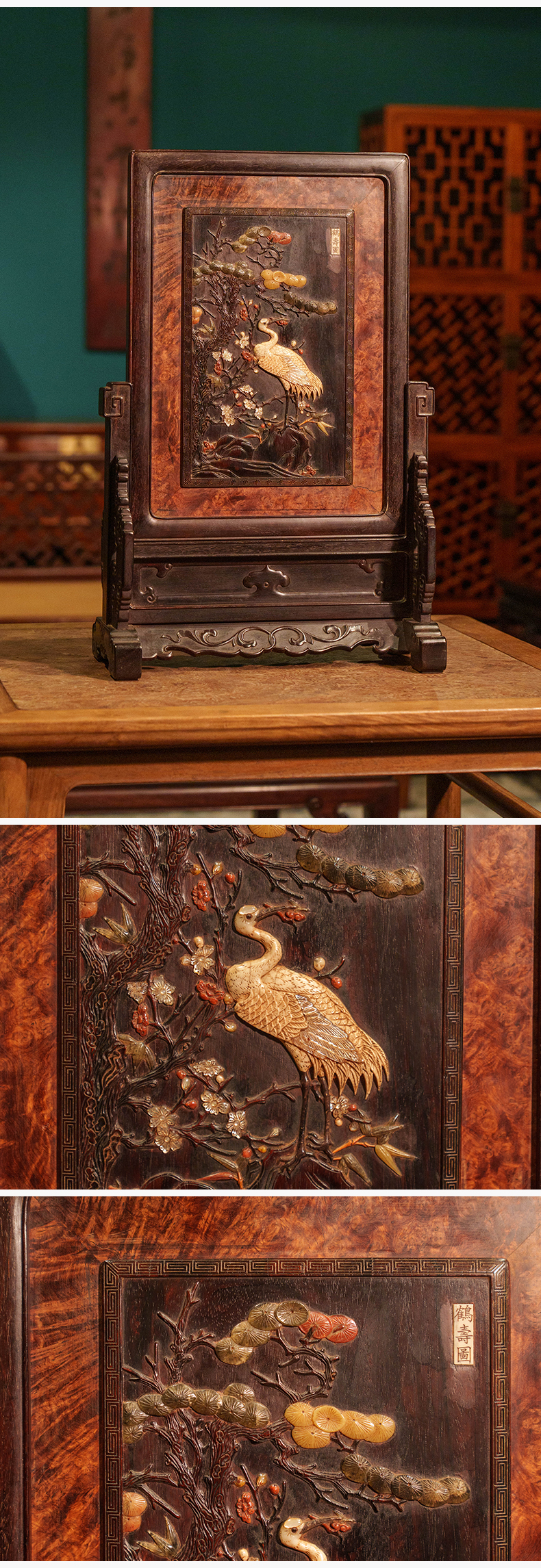 清 紫檀镶瘿木百宝嵌鹤寿图插屏