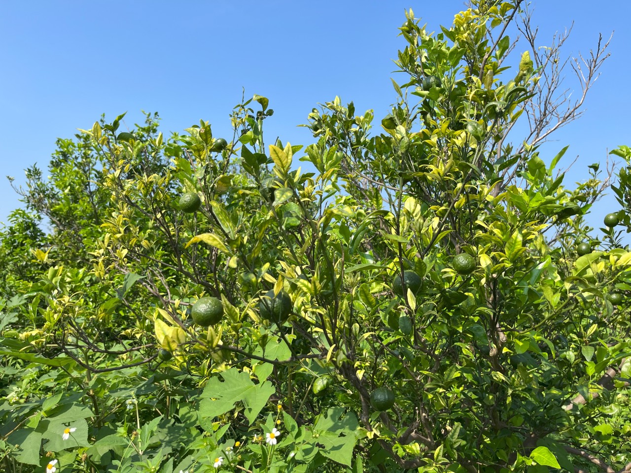 由于2020年开始转换生态种植的时候不使用化学农药,导致柑橘木虱无法得到有效控制,2022年开始出现较大面积的黄龙病感染,2023年感染面几乎百分之百,整个果园基本绝收,即使面对如此严峻的减产损失,唐大哥也决不打农药。