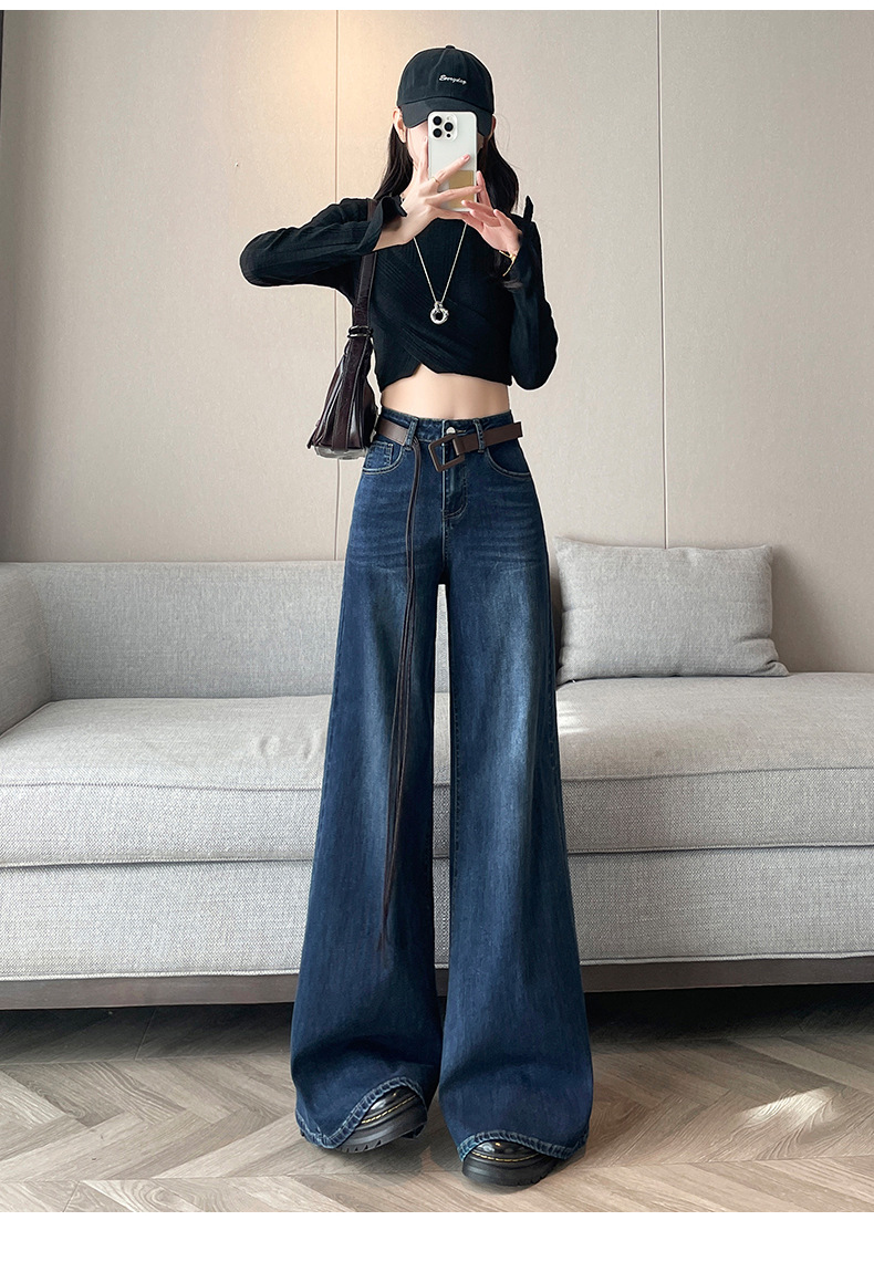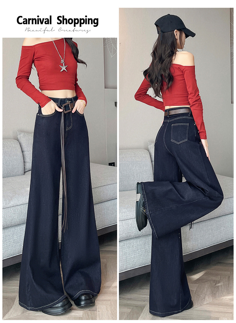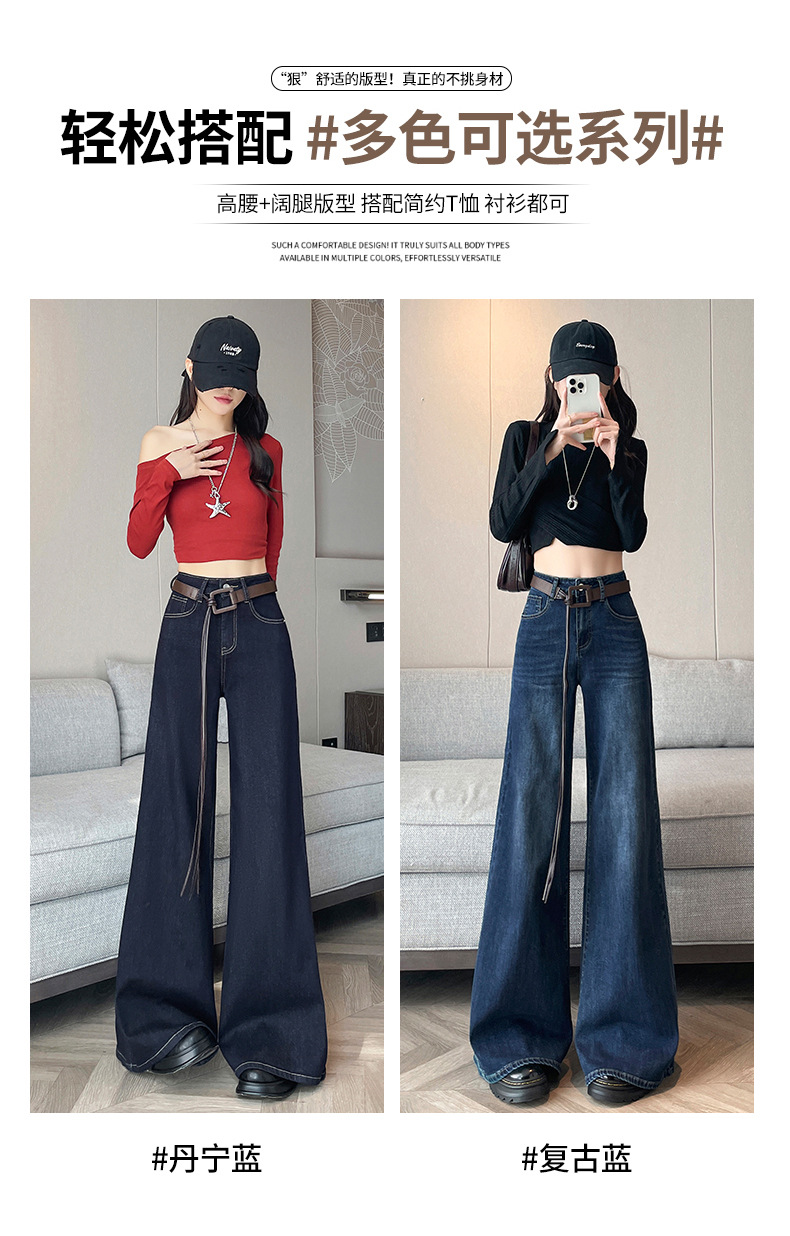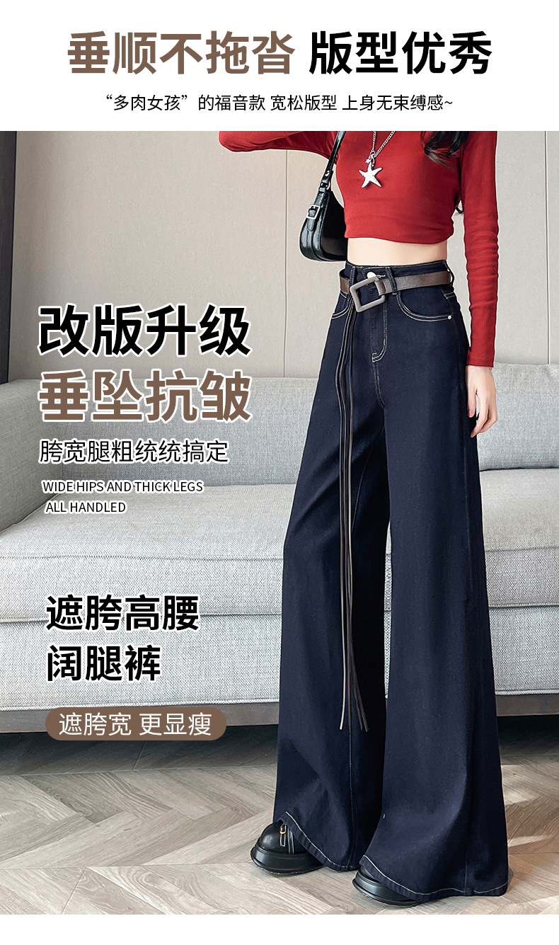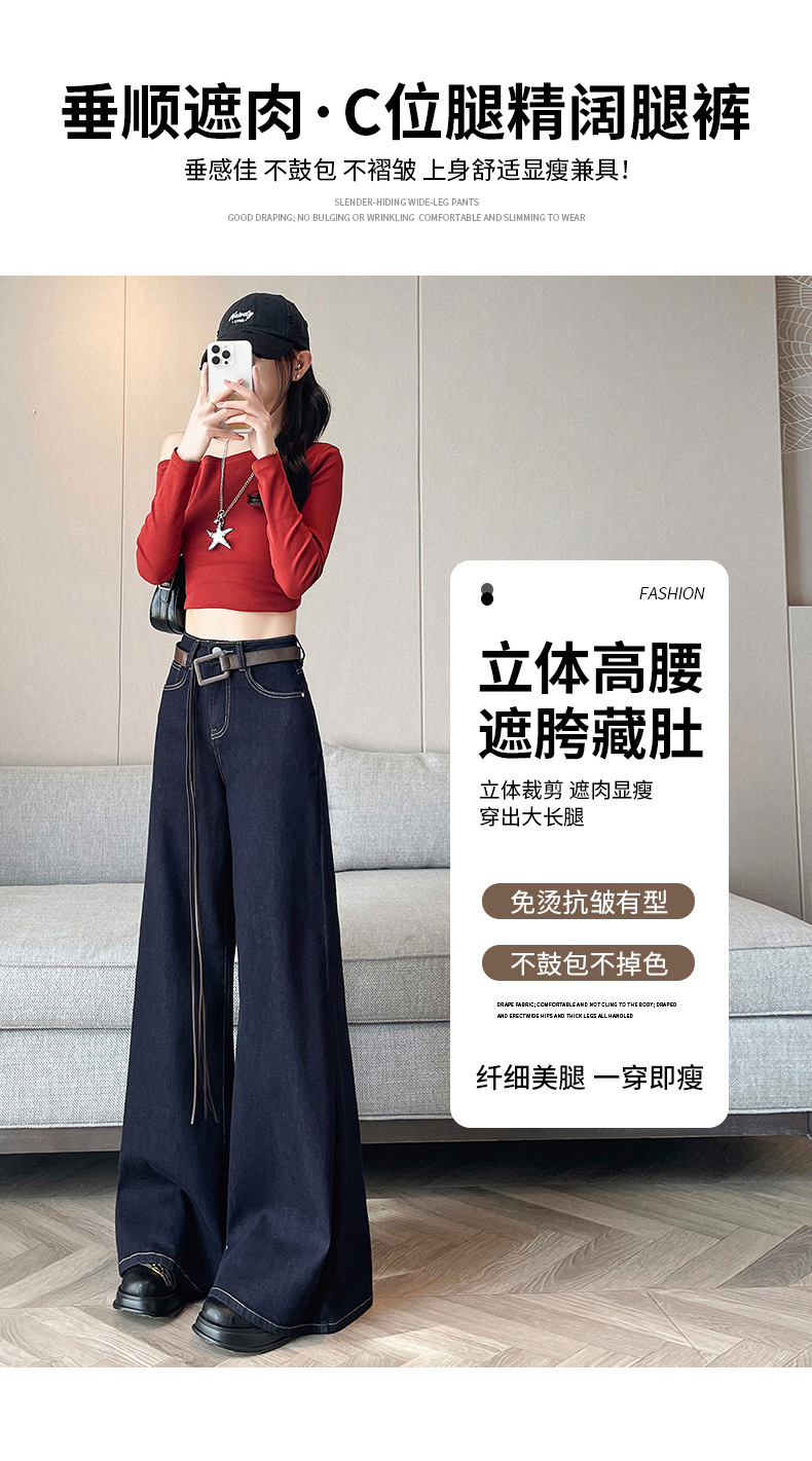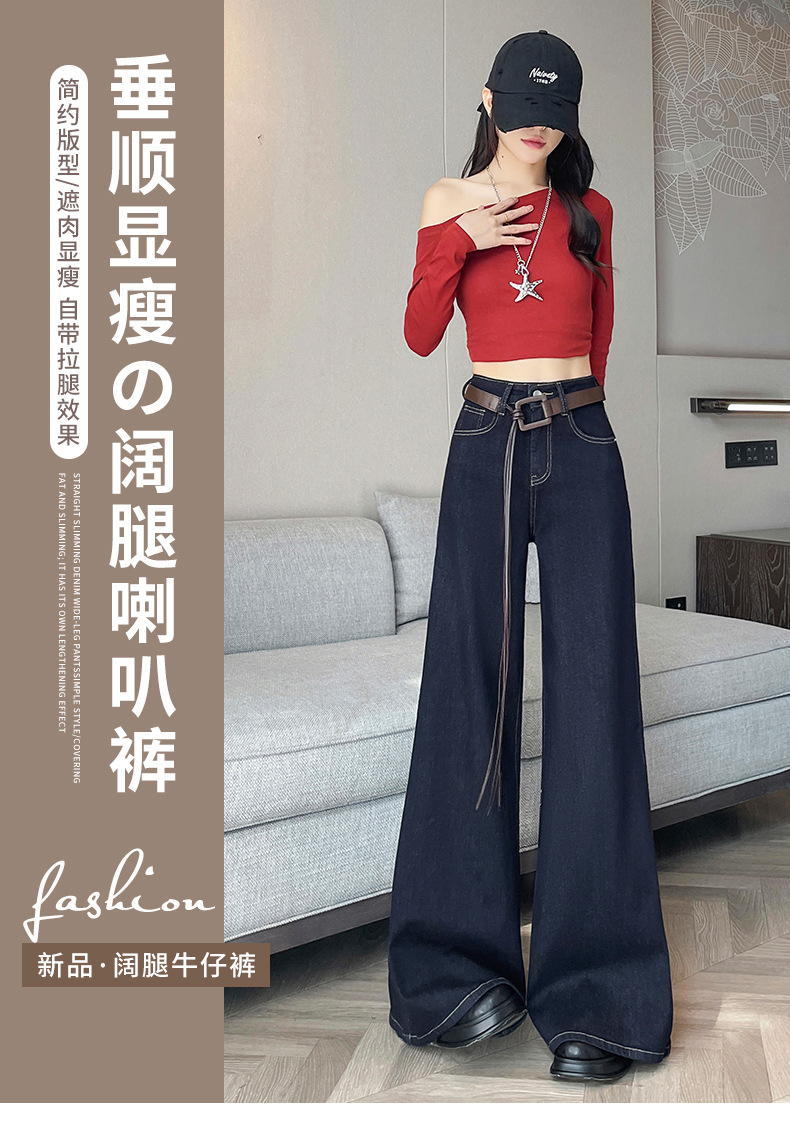 雀说黑金蓝阔腿牛仔裤女高腰宽松高级感慵懒风腰带喇叭裤AL8096