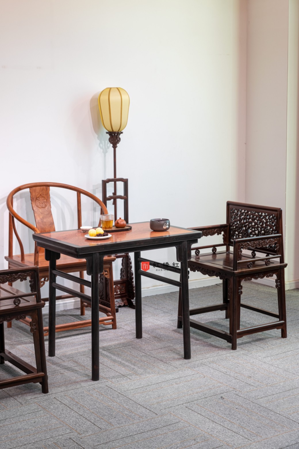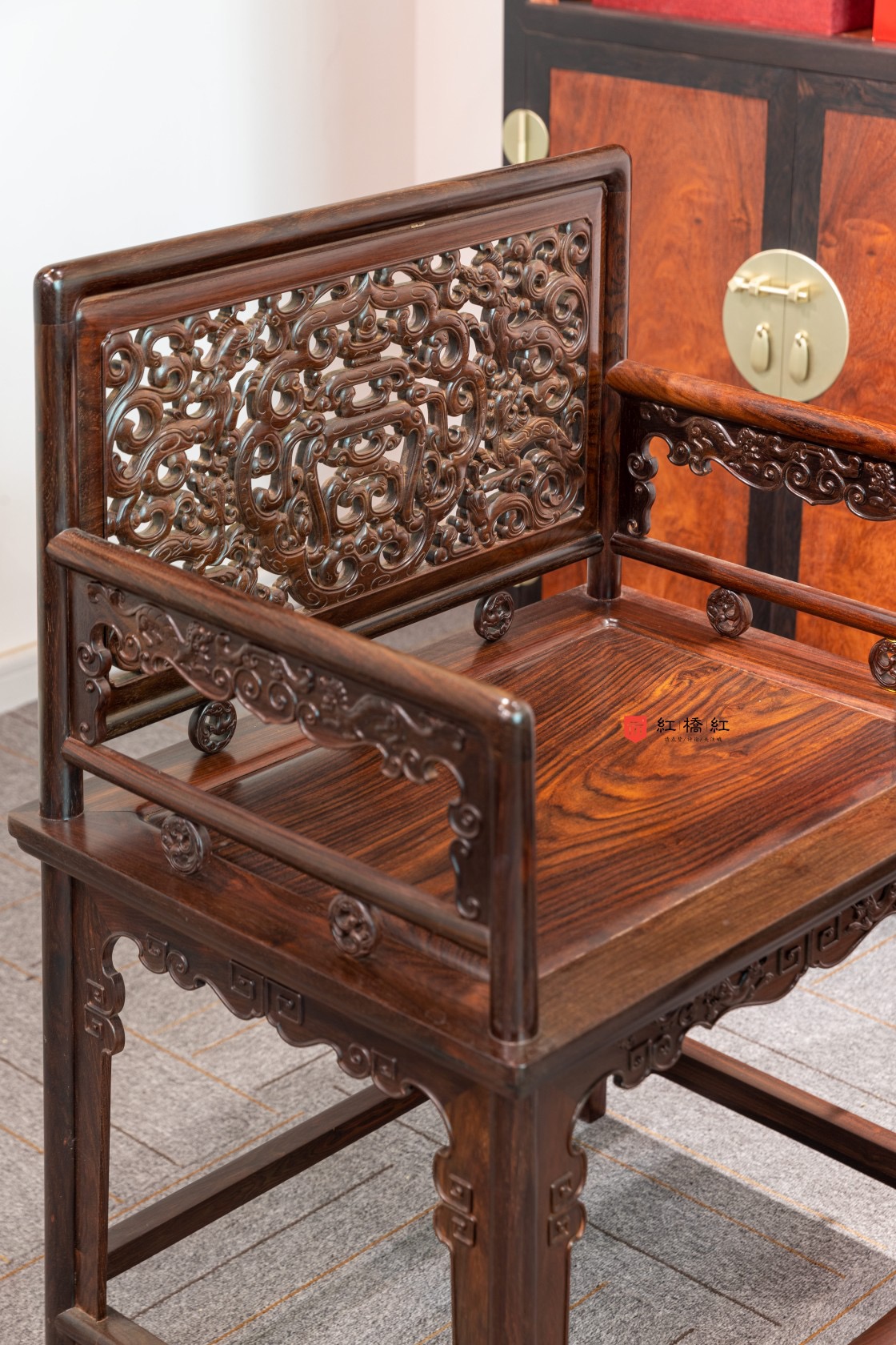 大红酸枝玫瑰椅:玫瑰椅上承宋制,辨识度极高,矮靠背、直扶手、小座面,短其倚衡,构件细小,文雅娟秀,框架简至几无再减可能,可以轻松挪动,其名取美若瑰玉之意。