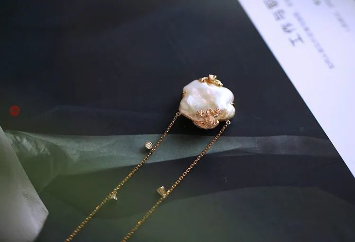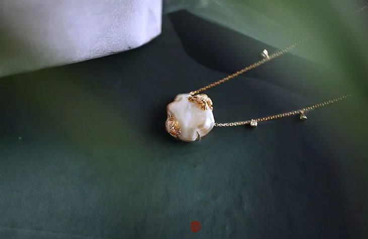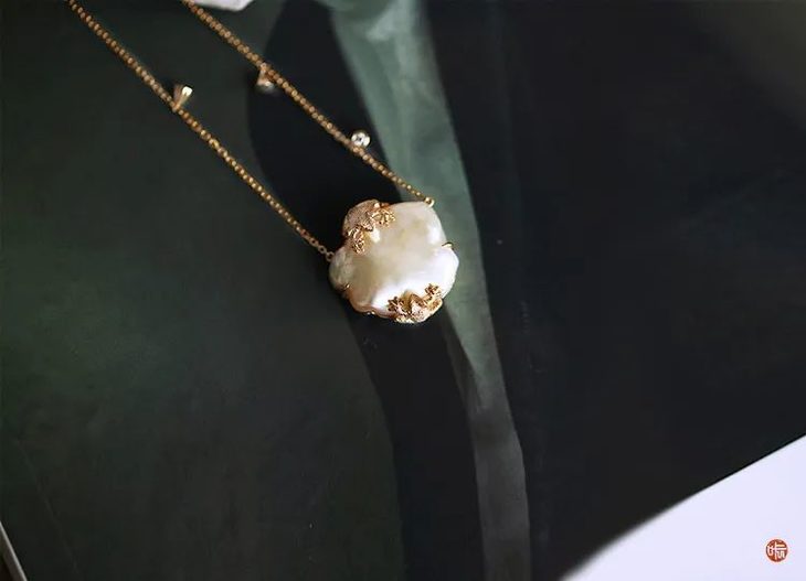 珍珠个头恰到好处,形态象极了荷叶的异形珍珠,珠光绚丽而美妙。