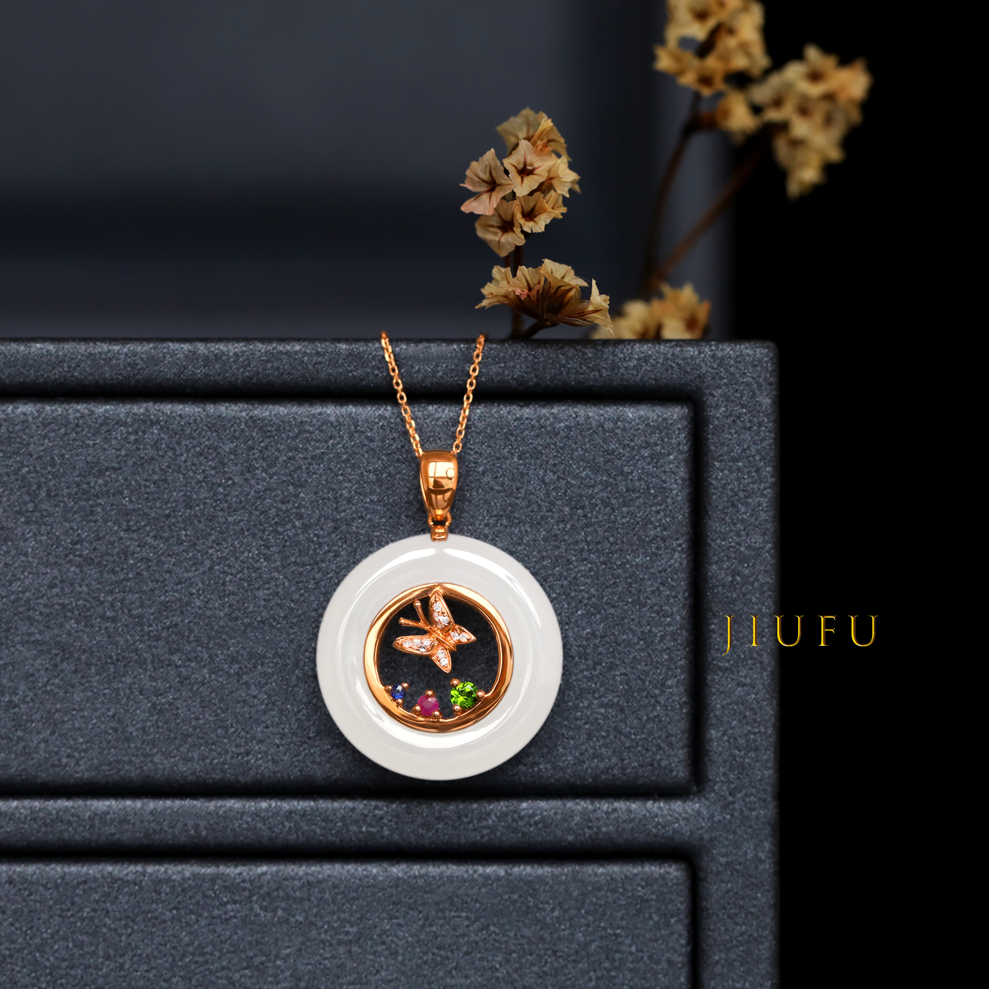 18k玫瑰金和田玉(白玉)吊坠