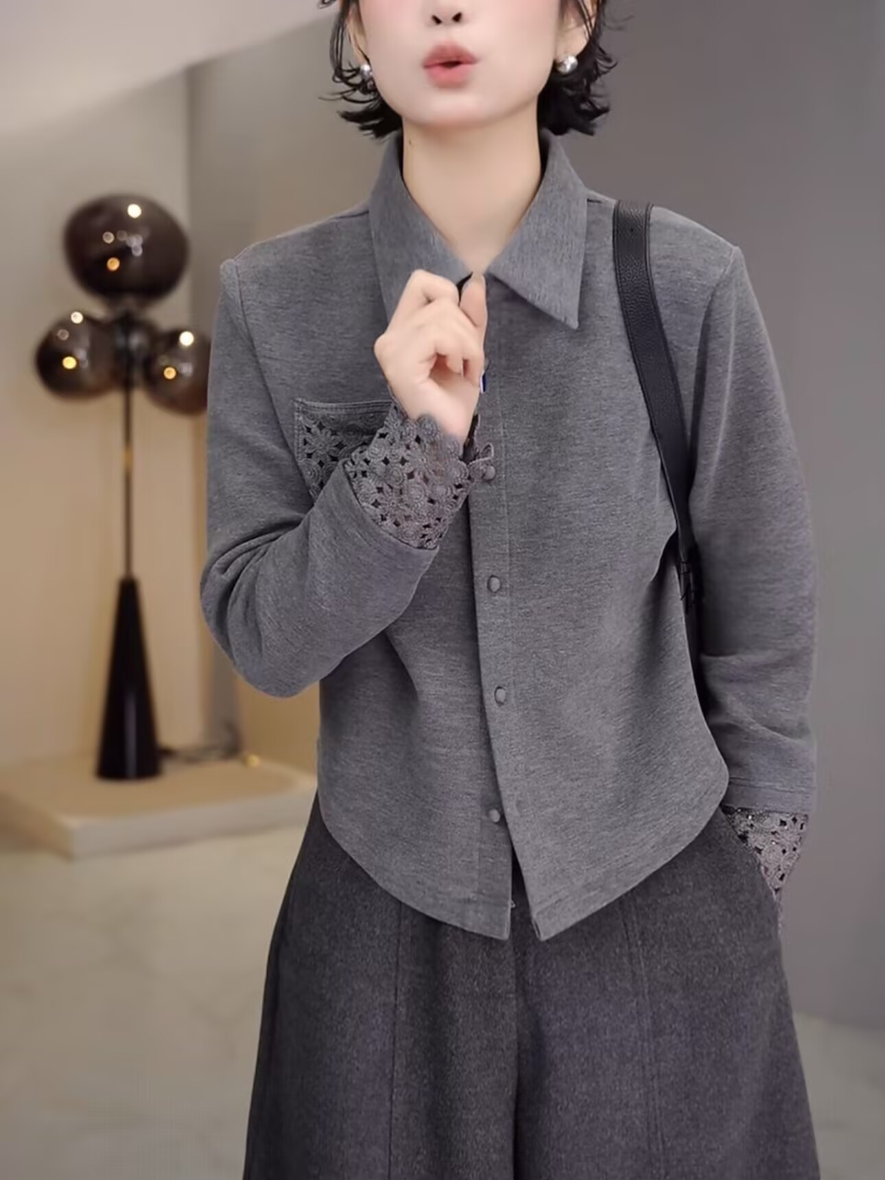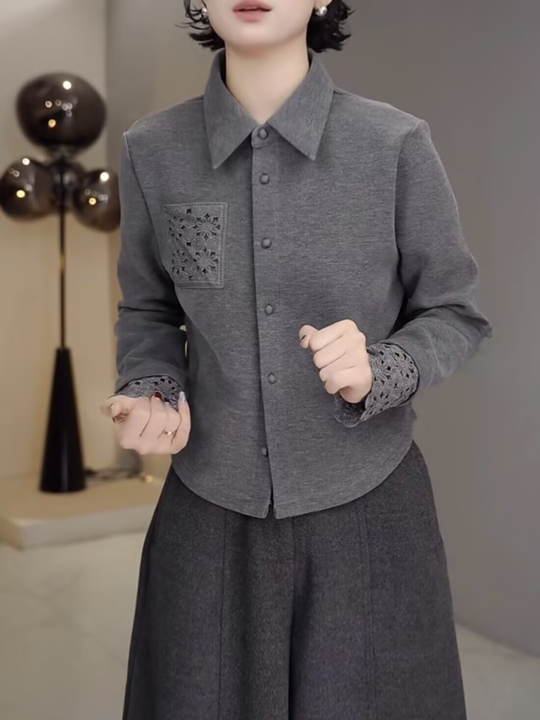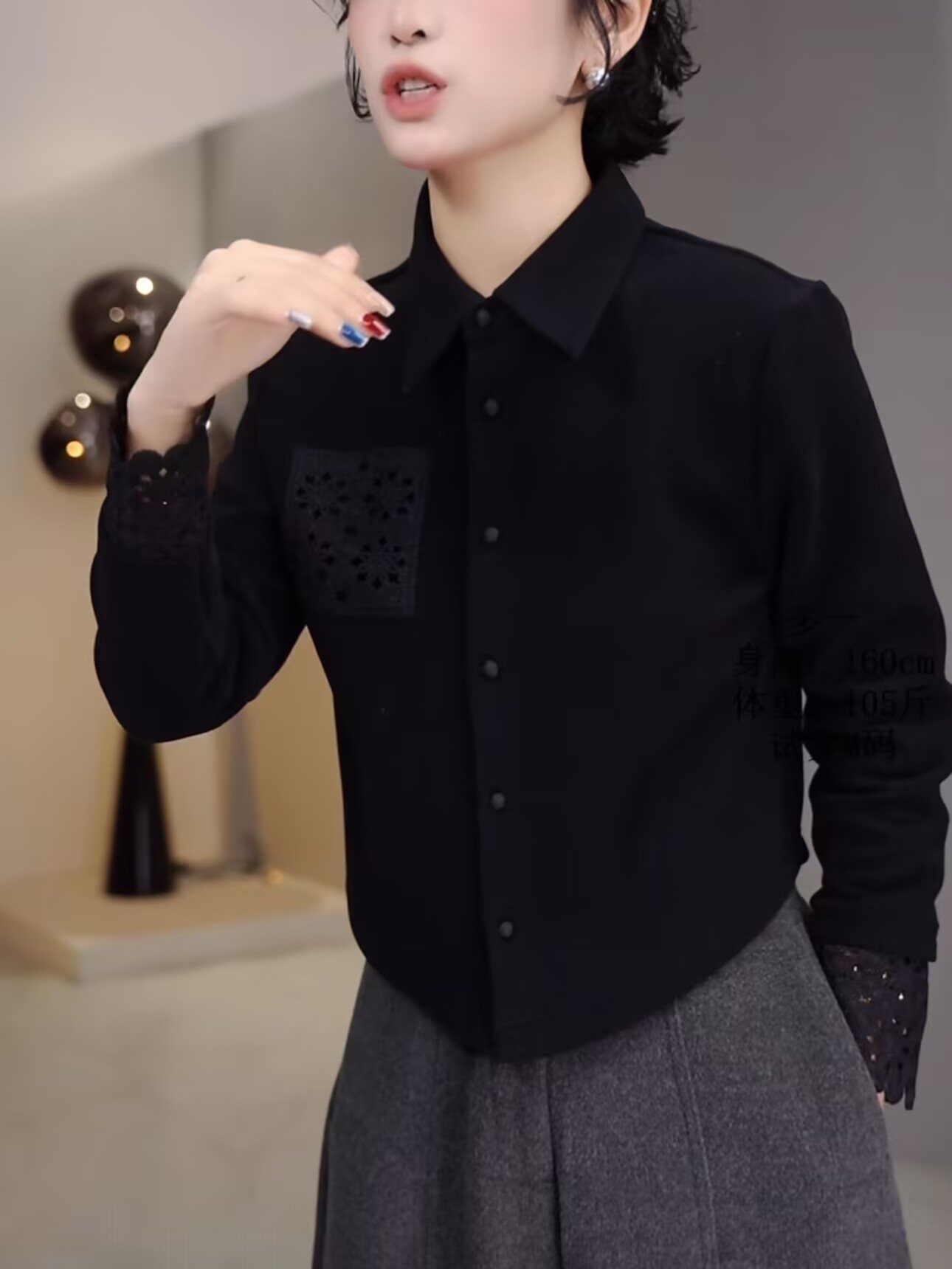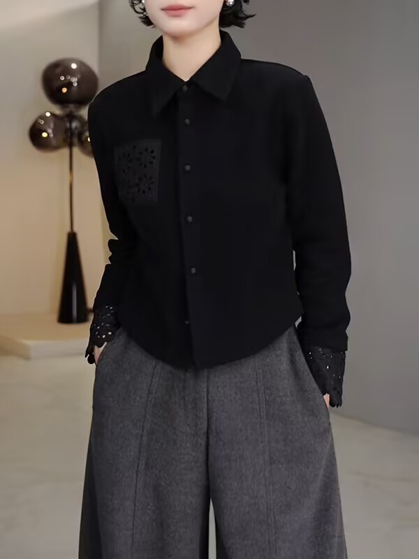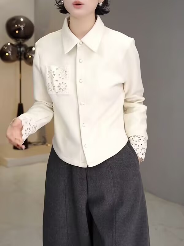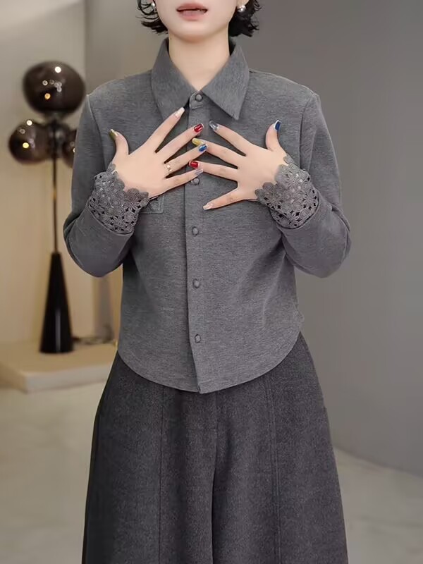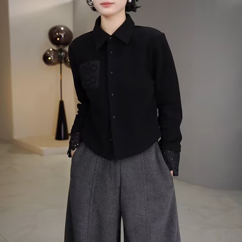 丁摩 高端复古蕾丝拼接翻领长袖衬衫女春秋高级感磨毛内搭打底上衣6ZF-0048