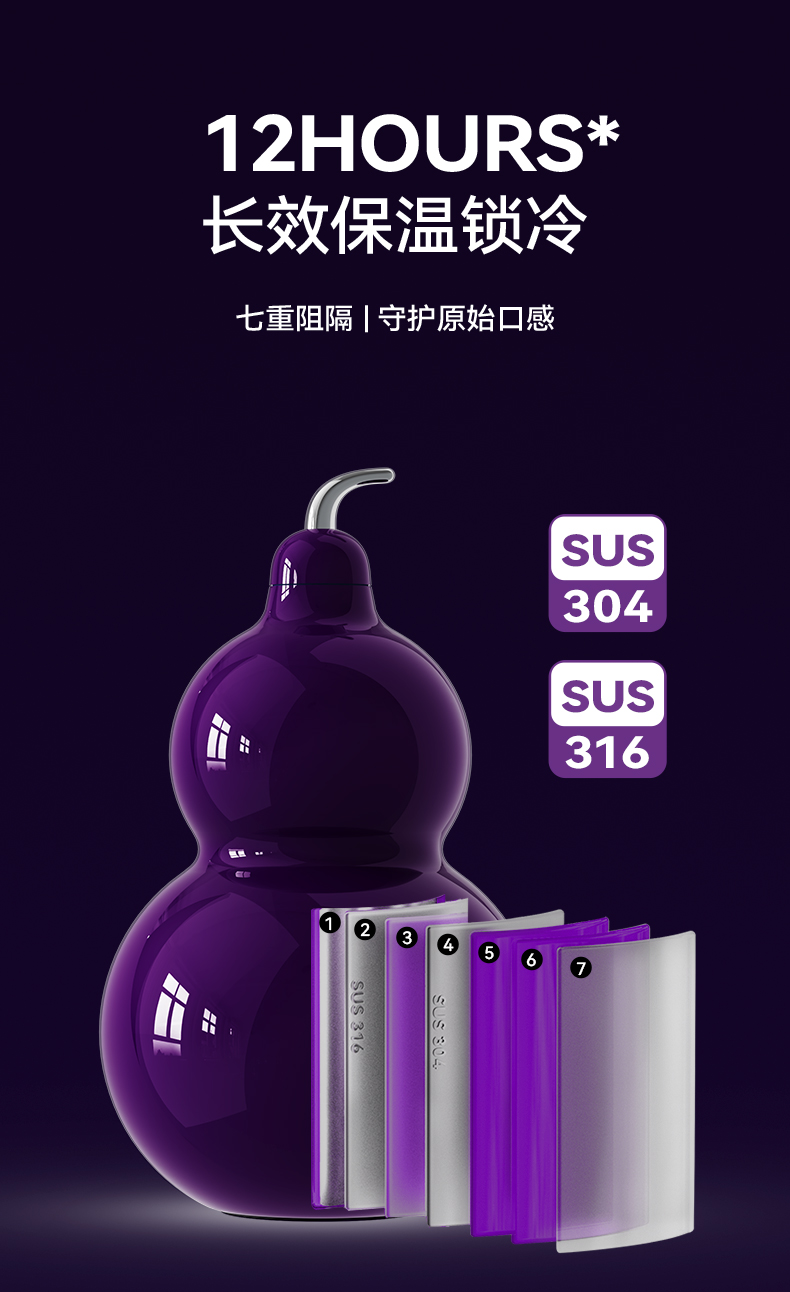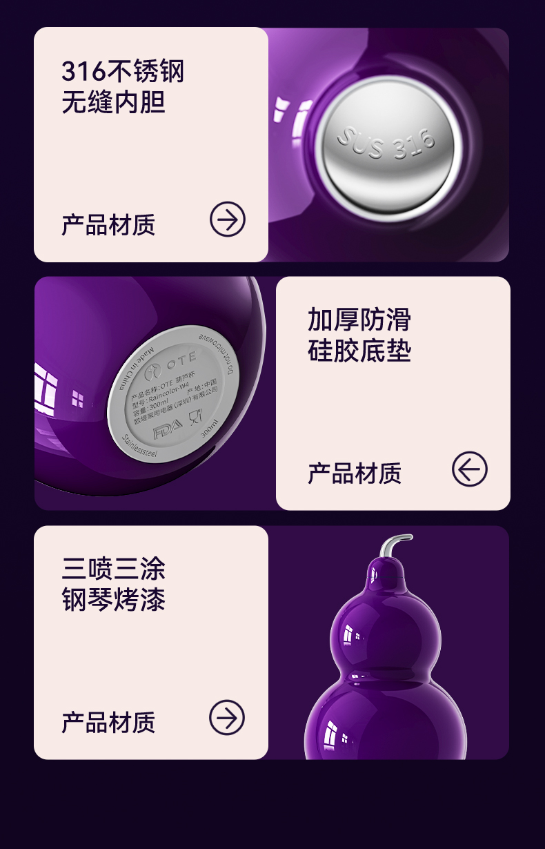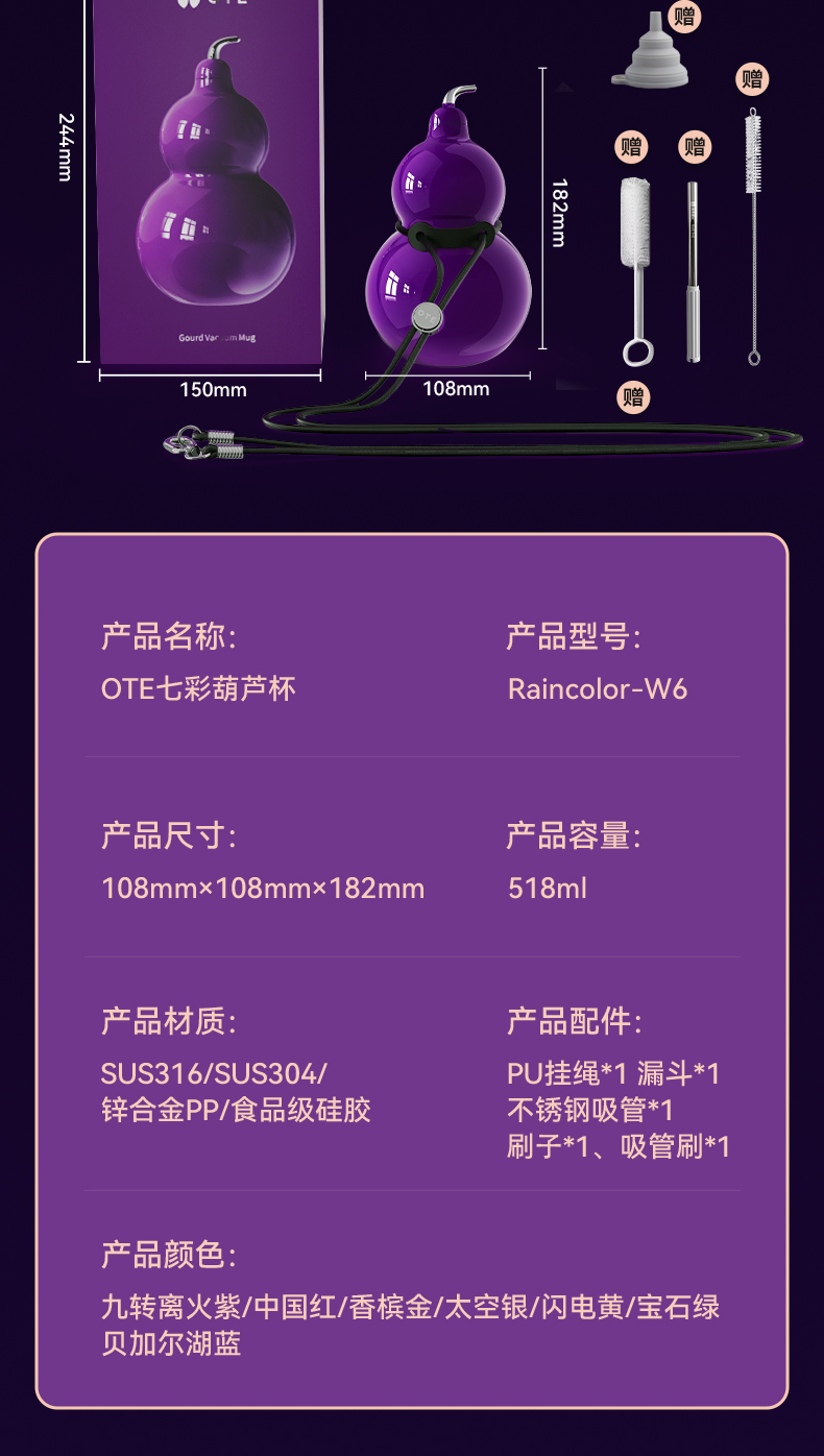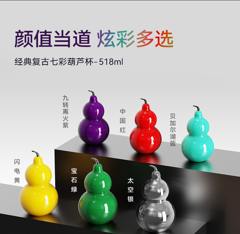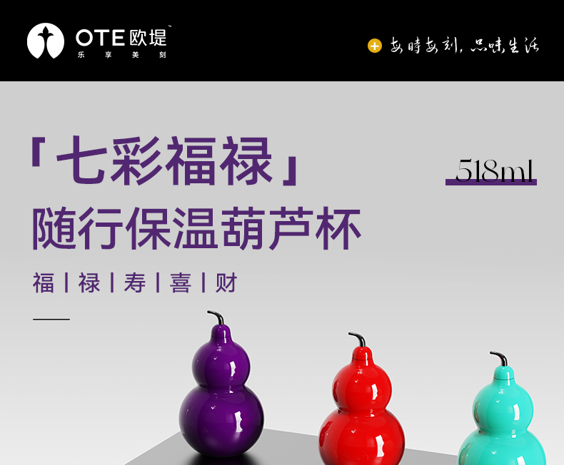 OTE | 七彩福禄保温杯,九转离火紫518ml五行葫芦杯,316不锈钢水壶,7种颜色供你选择