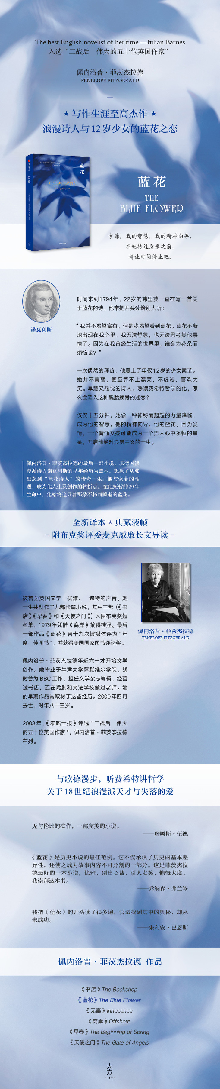 佩内洛普·菲茨杰拉德(PenelopeFitzgerald,19162000),被誉为英国文学优雅、独特的声音。她共创作了九部长篇小说,其中三部(《书店》《早春》和《天使之门》)入围布克奖短名单,1979年凭借《离岸》摘得桂冠。后一部作品《蓝花》曾十九次被媒体评为“年度佳图书”,并获得美国国家图书评论奖。