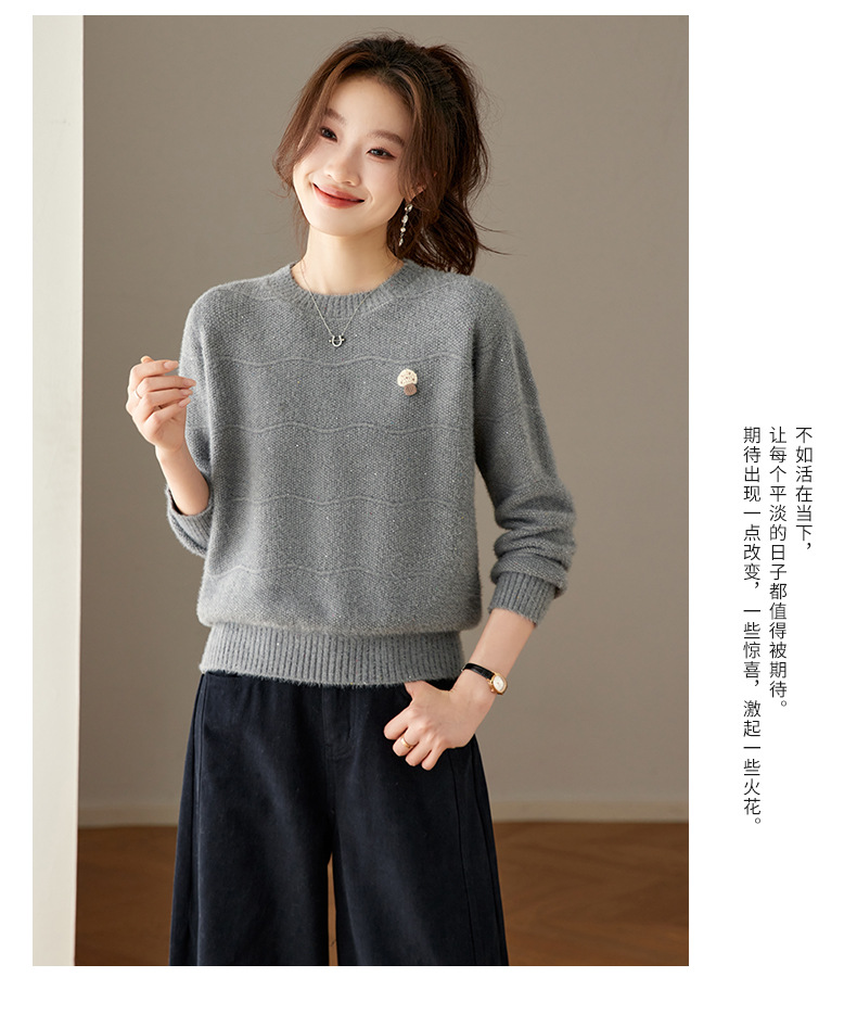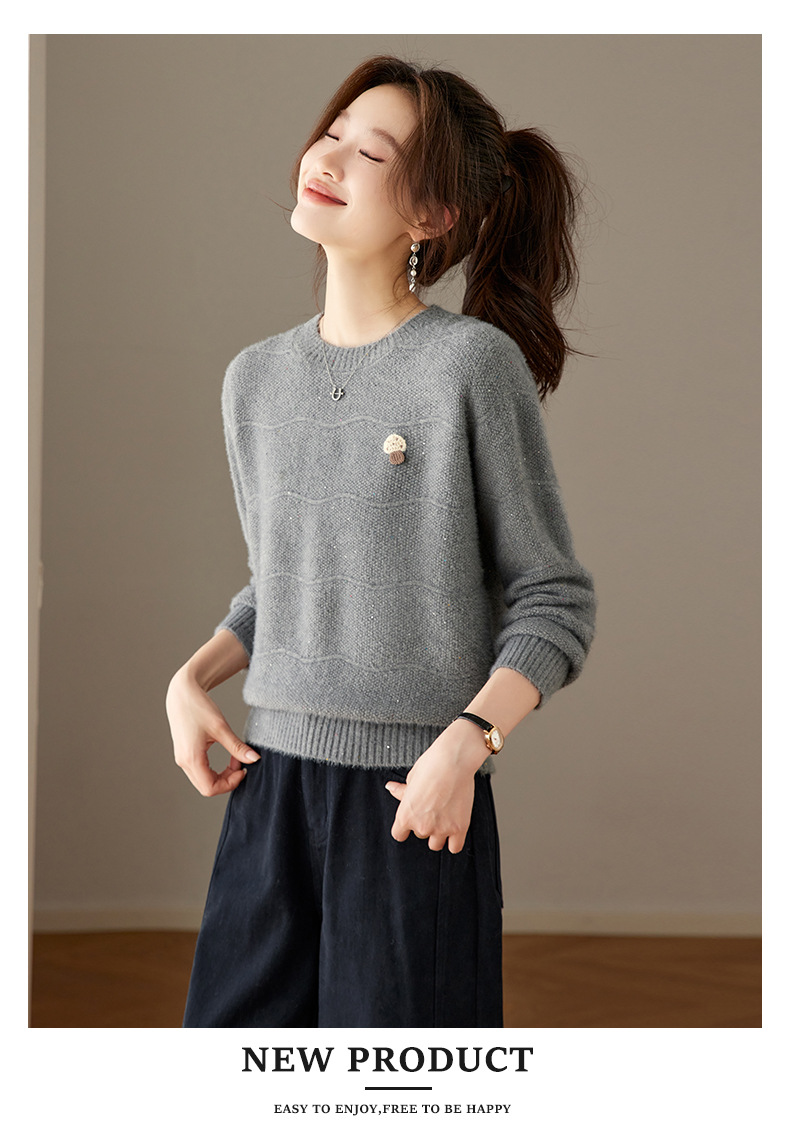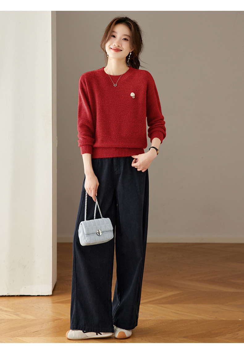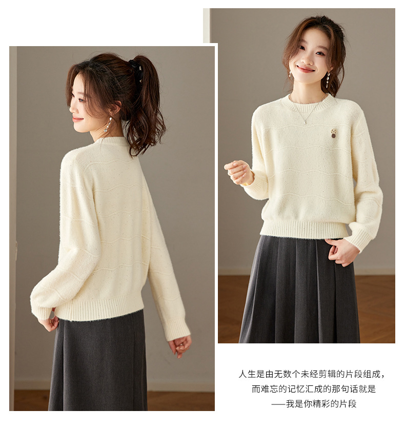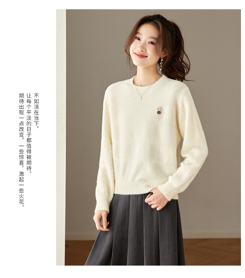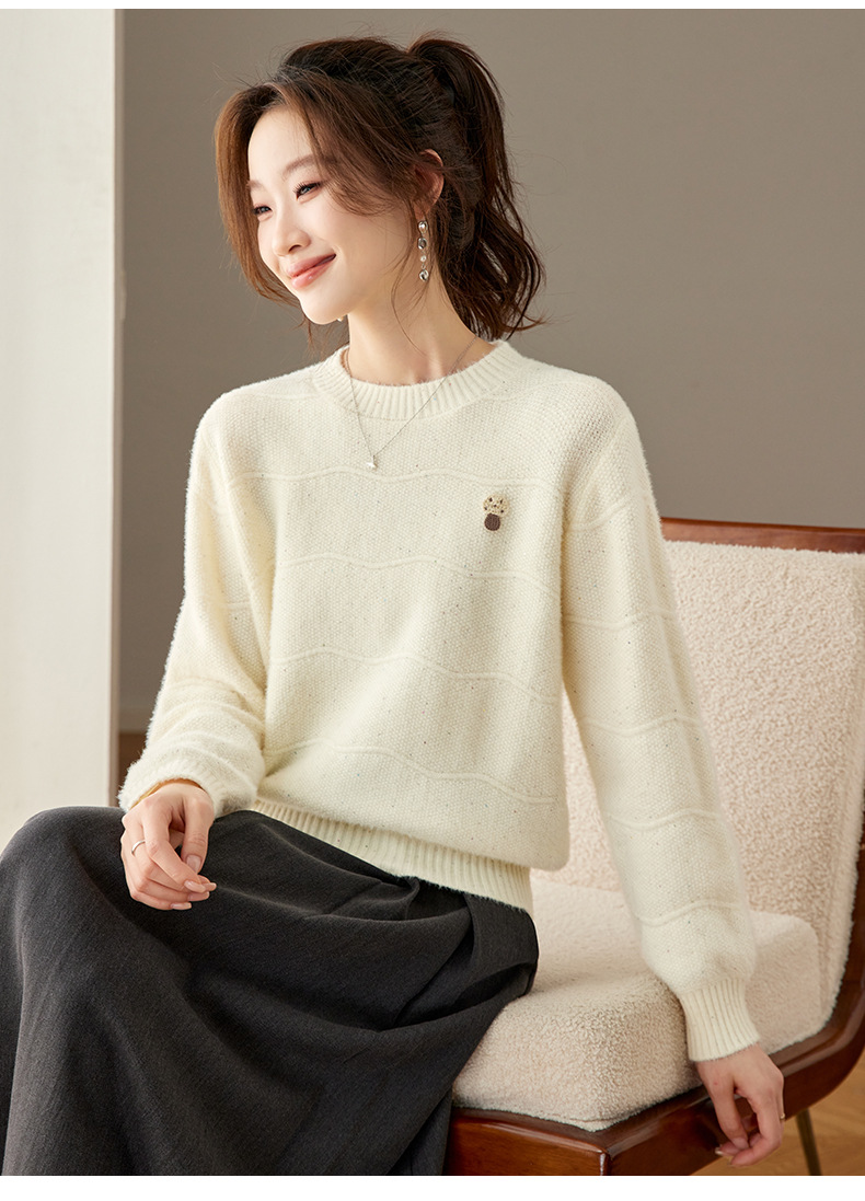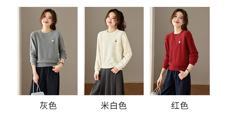 CC韩系刺绣圆领毛衣女秋冬宽松慵懒风针织衫内搭高级感保暖打底上衣