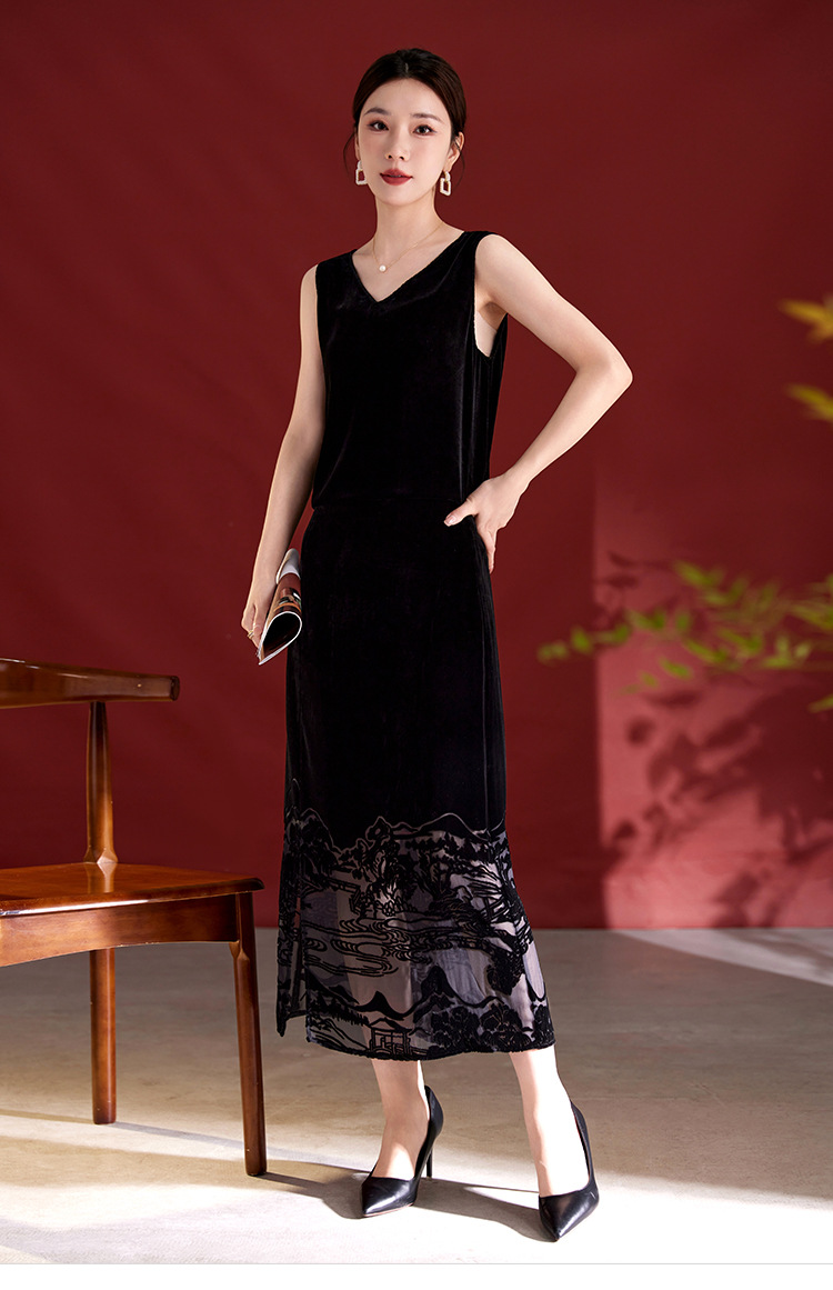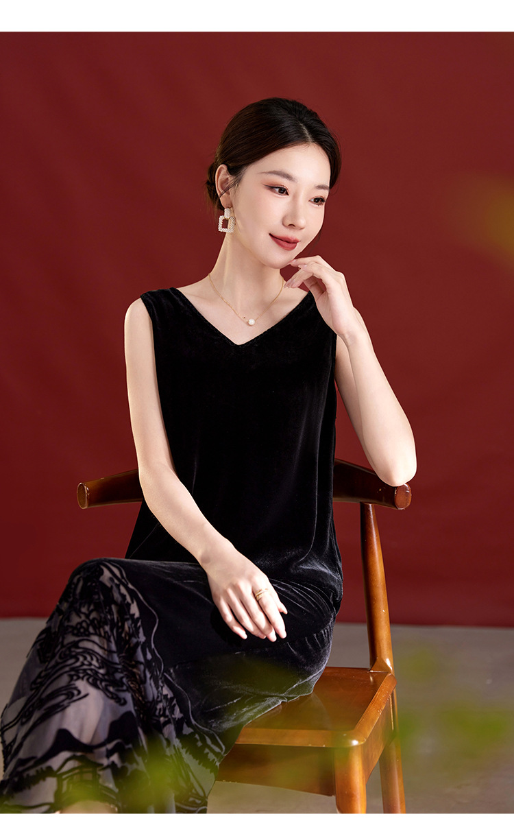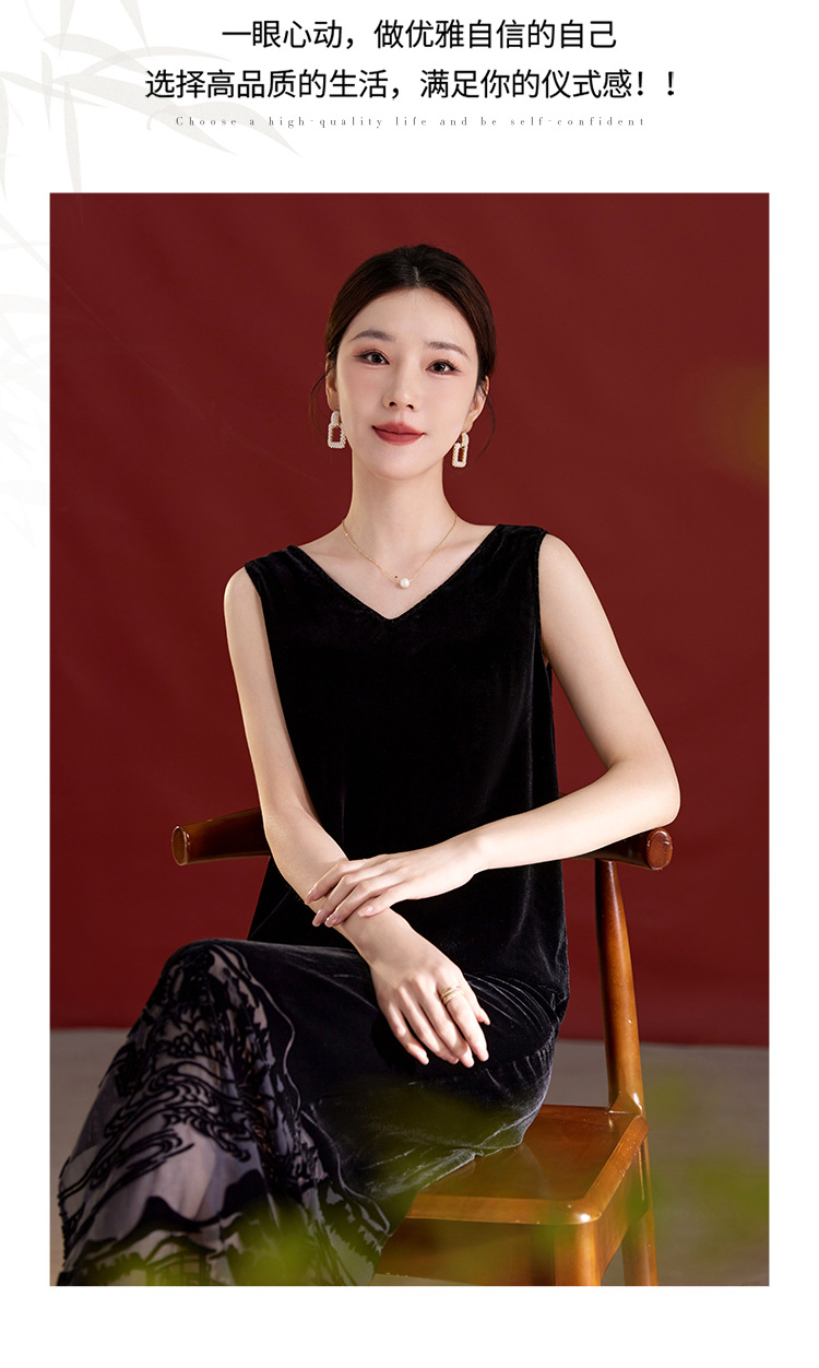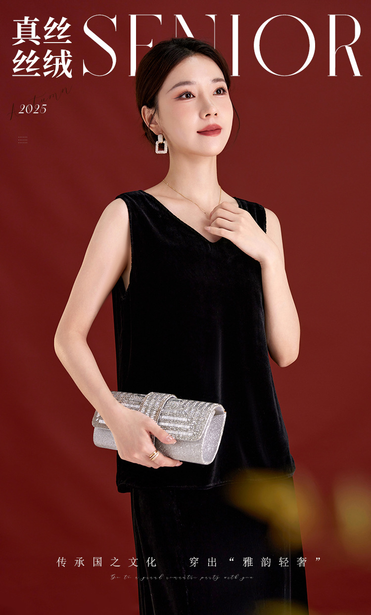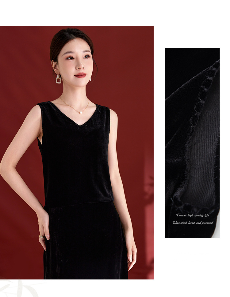 QS黑色丝绒吊带背心女内搭露肩100%桑蚕丝纯色无袖舒适透气百搭1793