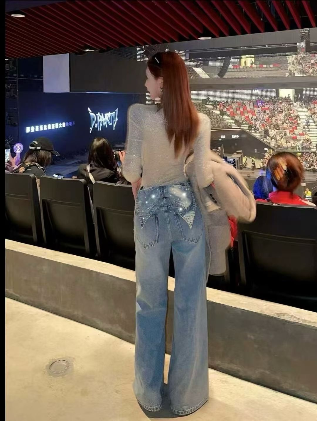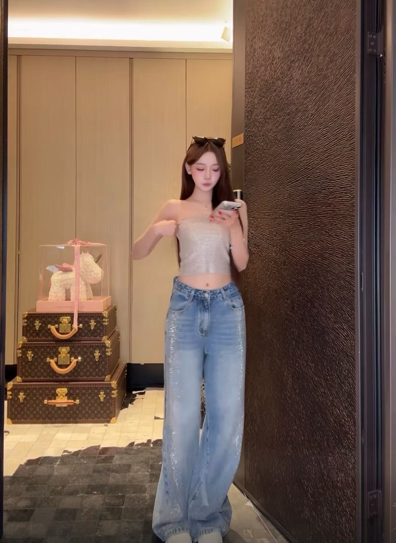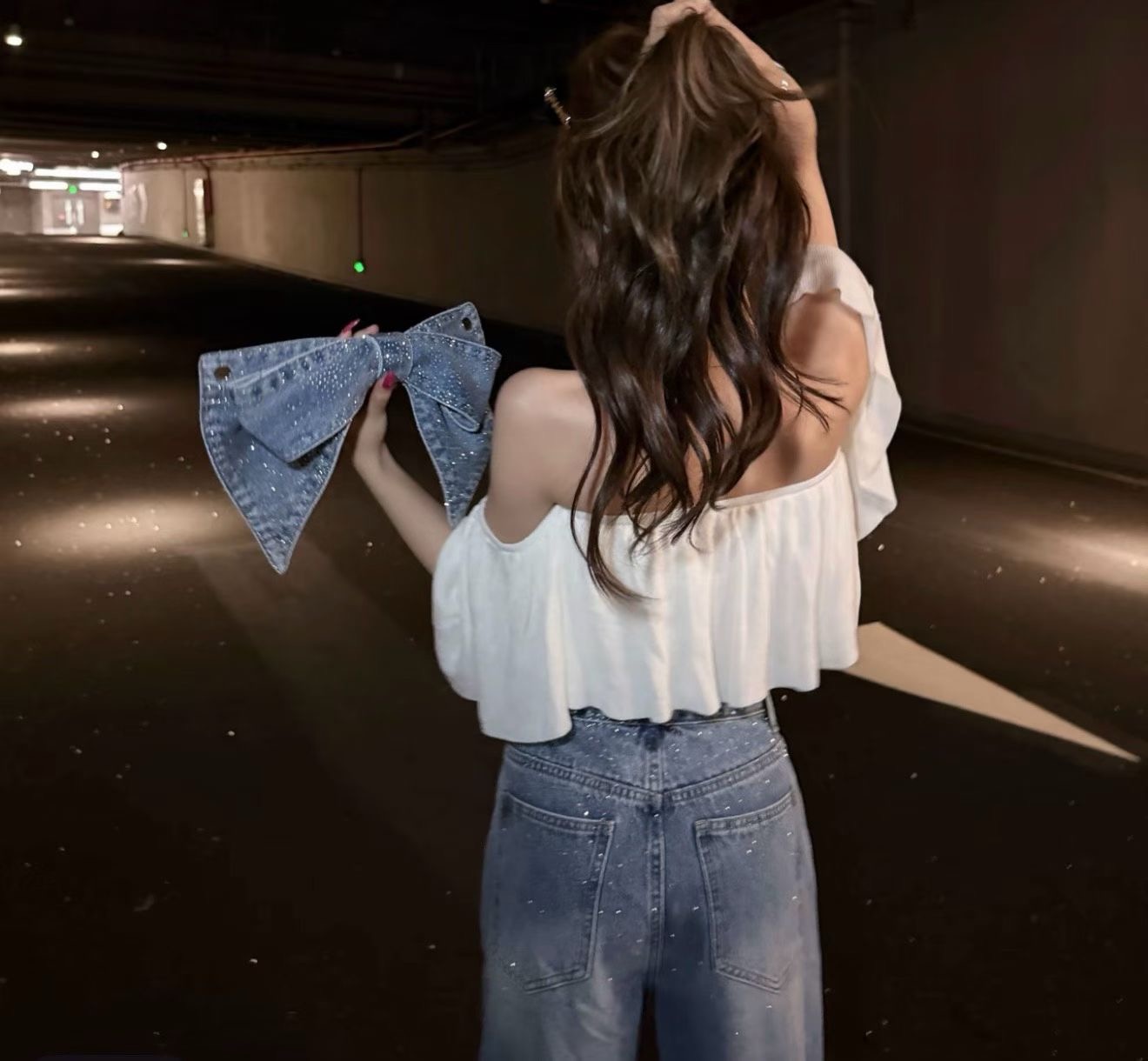重工烫钻+立体可拆卸蝴蝶结后腰,高腰阔腿版型,藏肉显瘦一把好手。灯光下blingbling,出片率100%。钻点随动作轻闪不刺眼耐,上身有型,满足不同造型需求,视觉上让腿型更舒展灵动又好看,把日常的松弛感拉满。