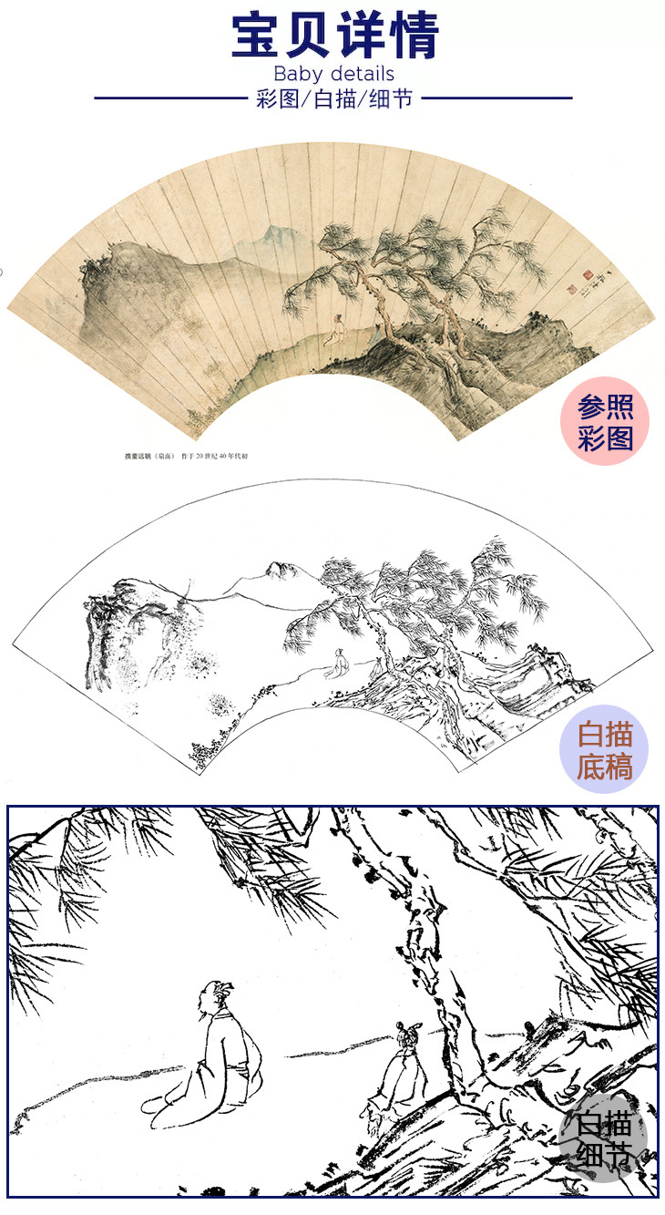 白描底稿-工笔扇面小品山水人物陈少梅-《携童远眺》-多种白描尺寸可选-TS14