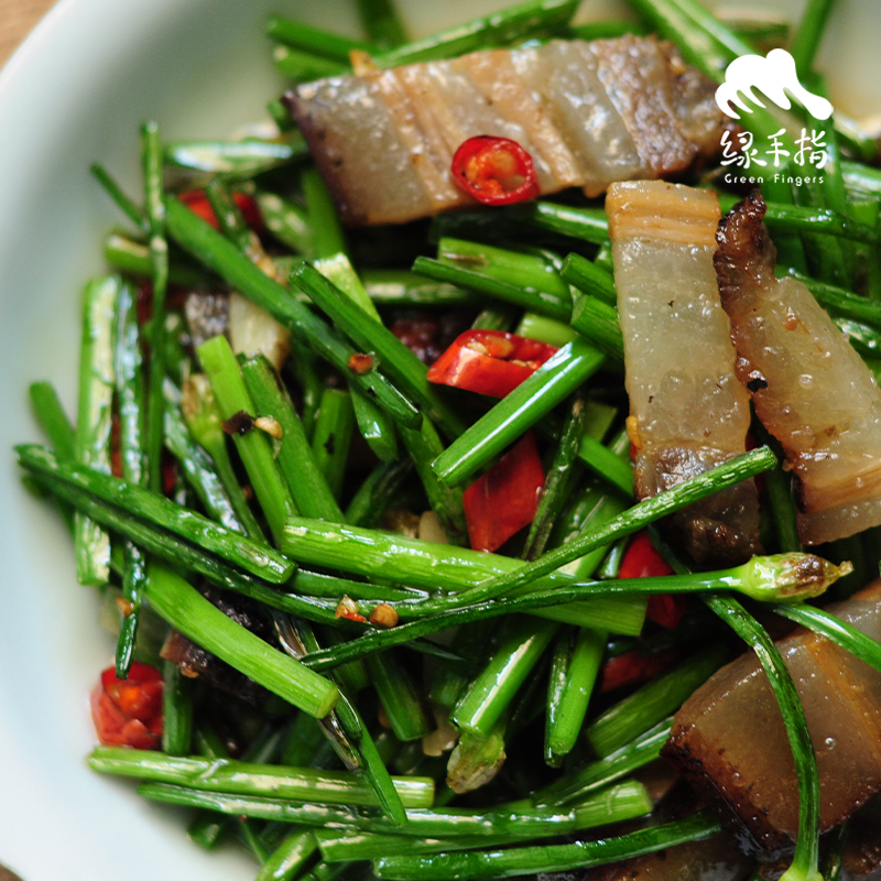 韭菜苔口感脆爽、营养丰富,可搭配肉丝、鸡蛋、腊肉、鸡胗、豆干等.