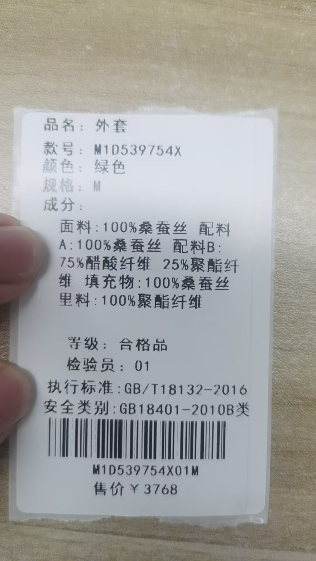 面料:100%桑蚕丝 配料A:100%桑蚕丝 配料B:75%醋酸纤维 25%聚酯纤维 填充物:100%桑蚕丝 里料:100%聚酯纤维