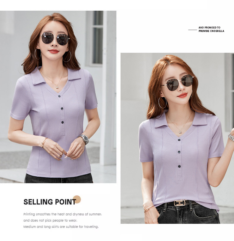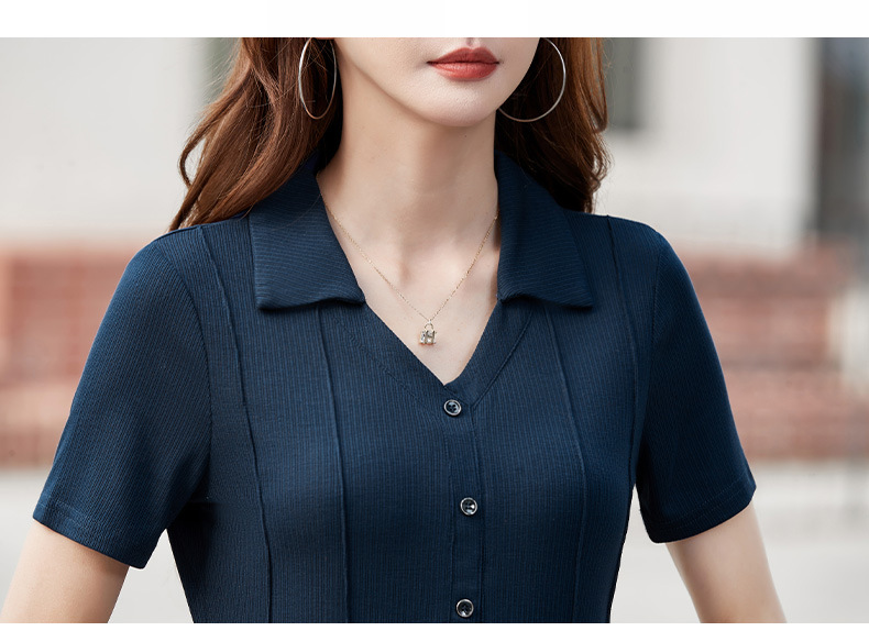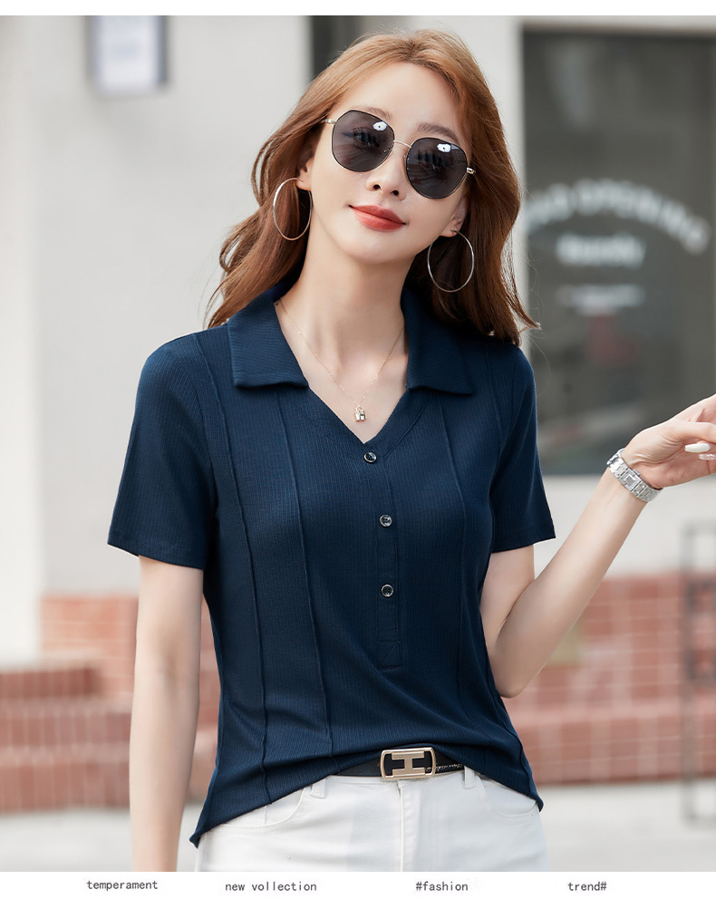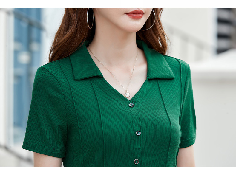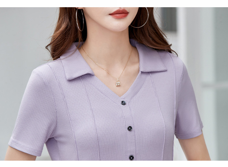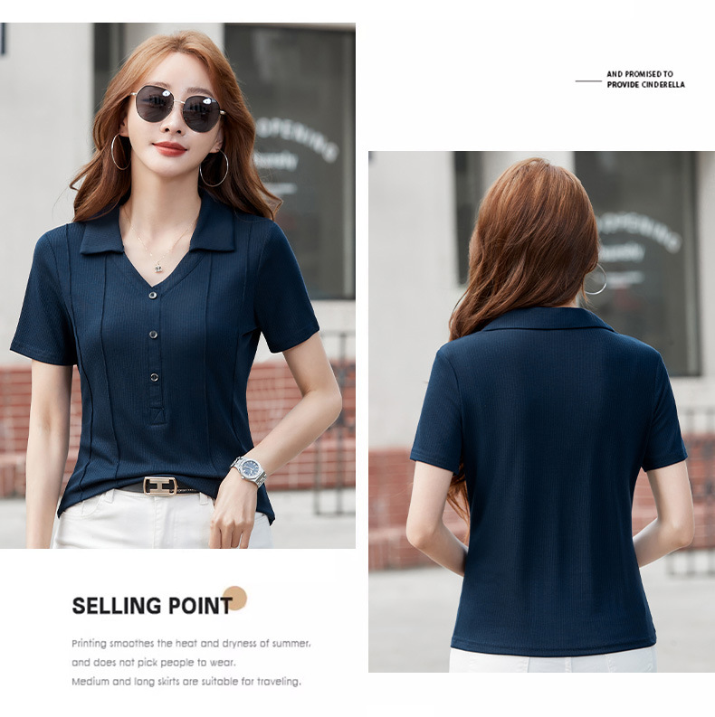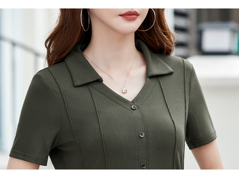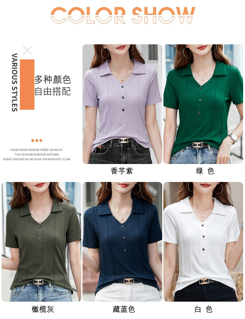 雀说翻领短袖中老年装洋气修身纯色大码薄衬衫上衣女士t恤AL489