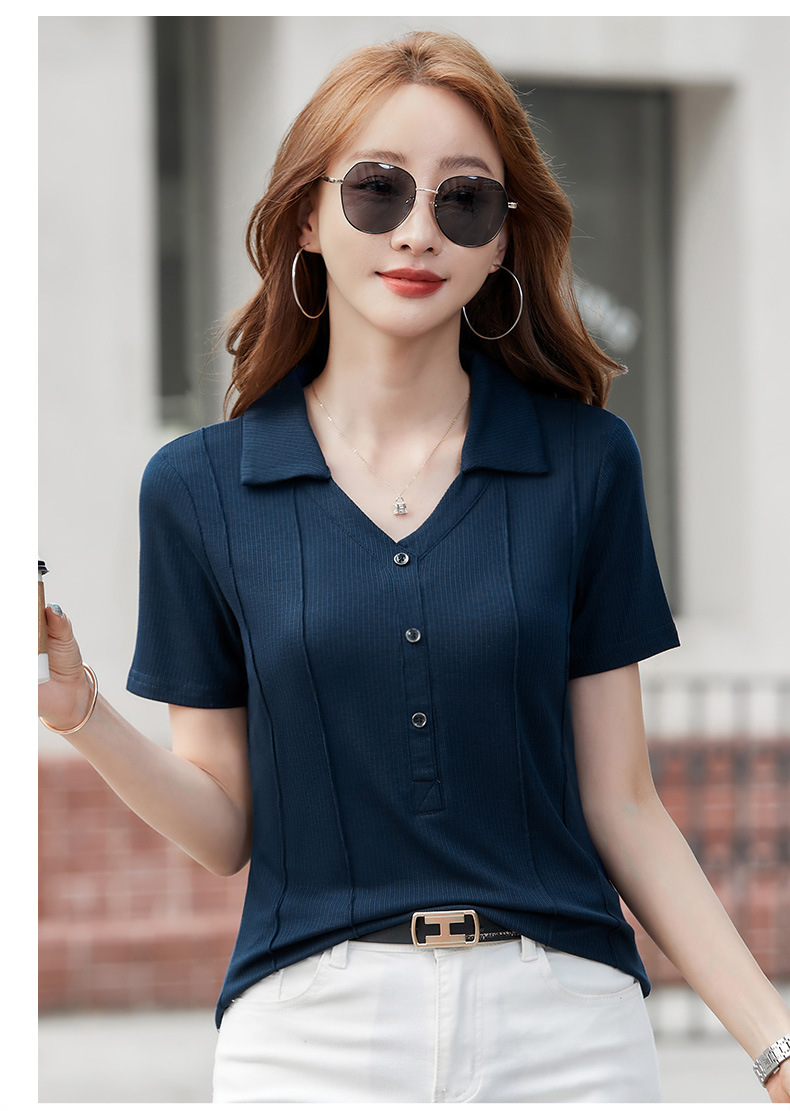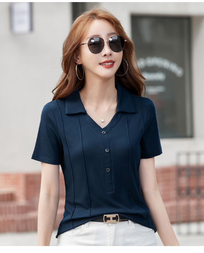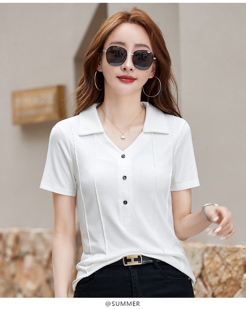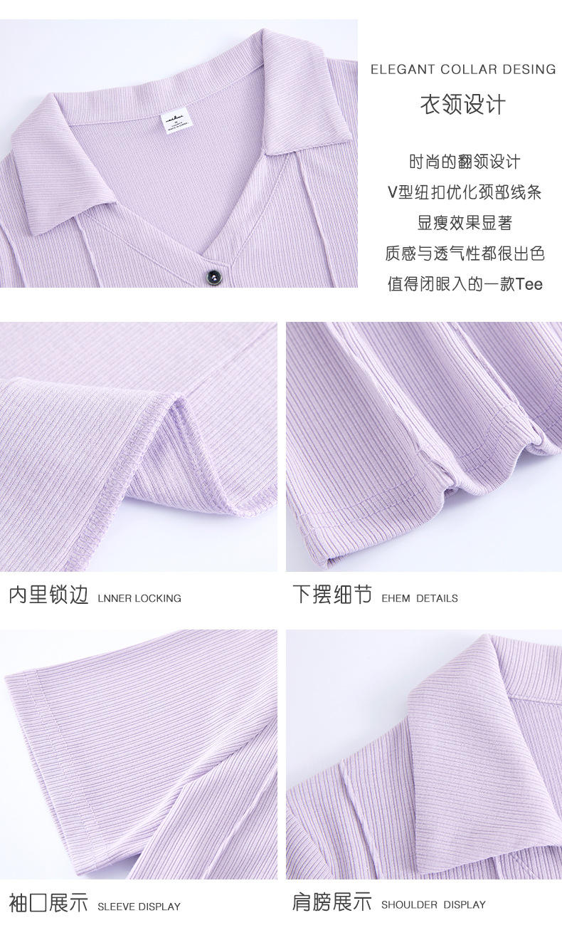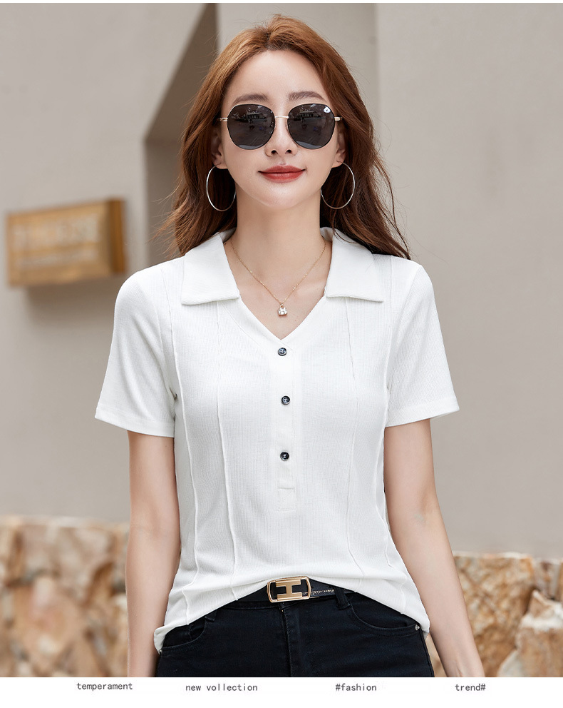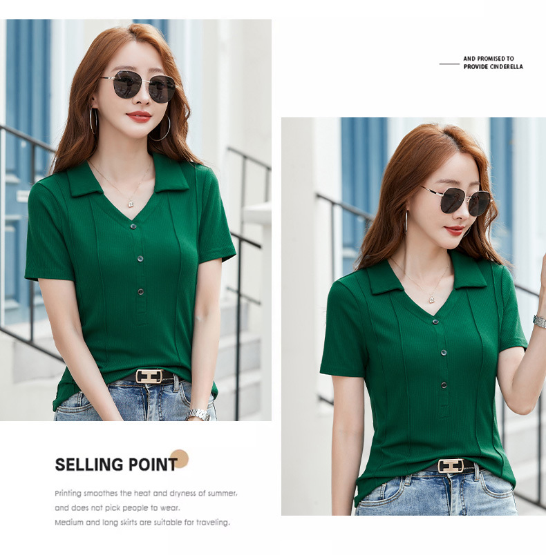 雀说翻领短袖中老年装洋气修身纯色大码薄衬衫上衣女士t恤AL489