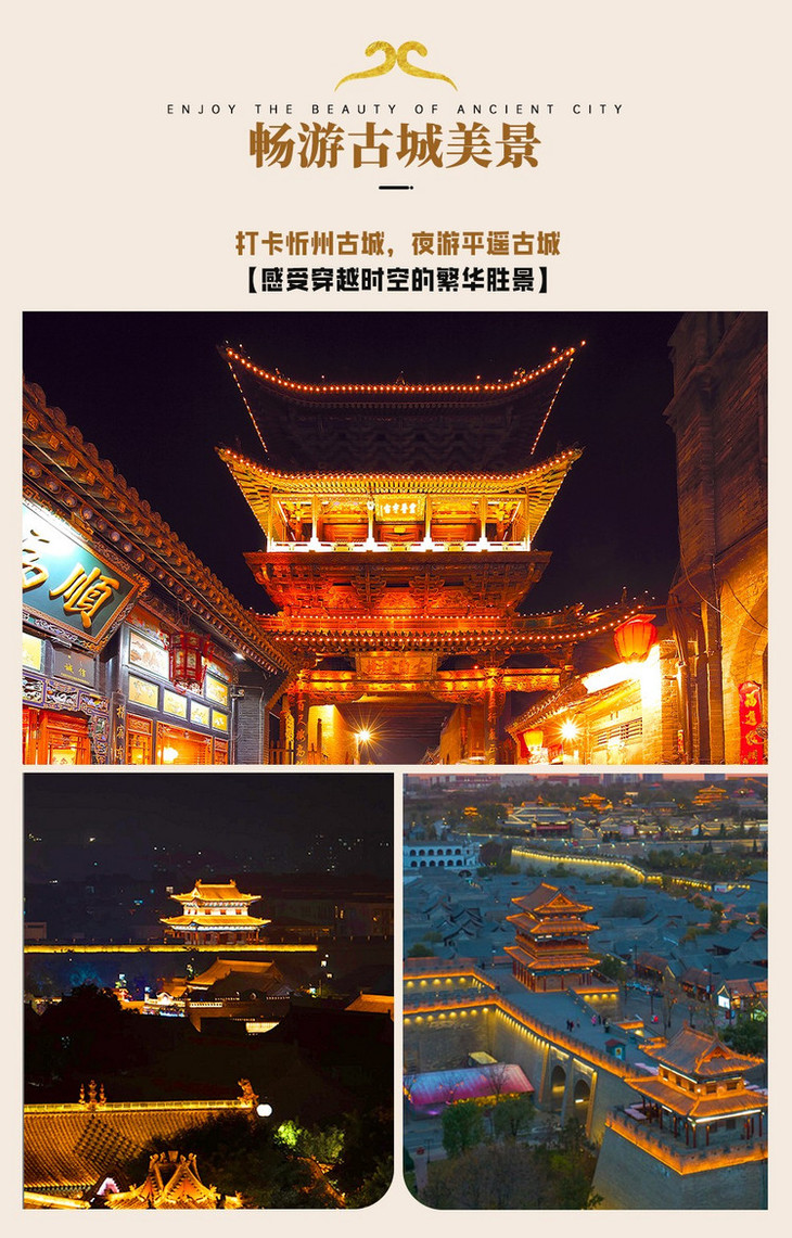 晚上大家可以前往忻州古城内自由闲逛,品尝当地特色美食,欣赏古城绚丽夜景。