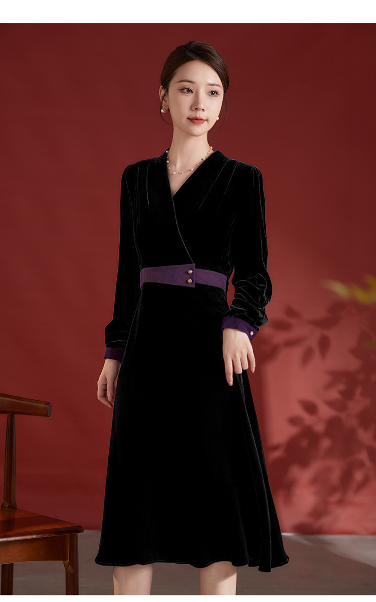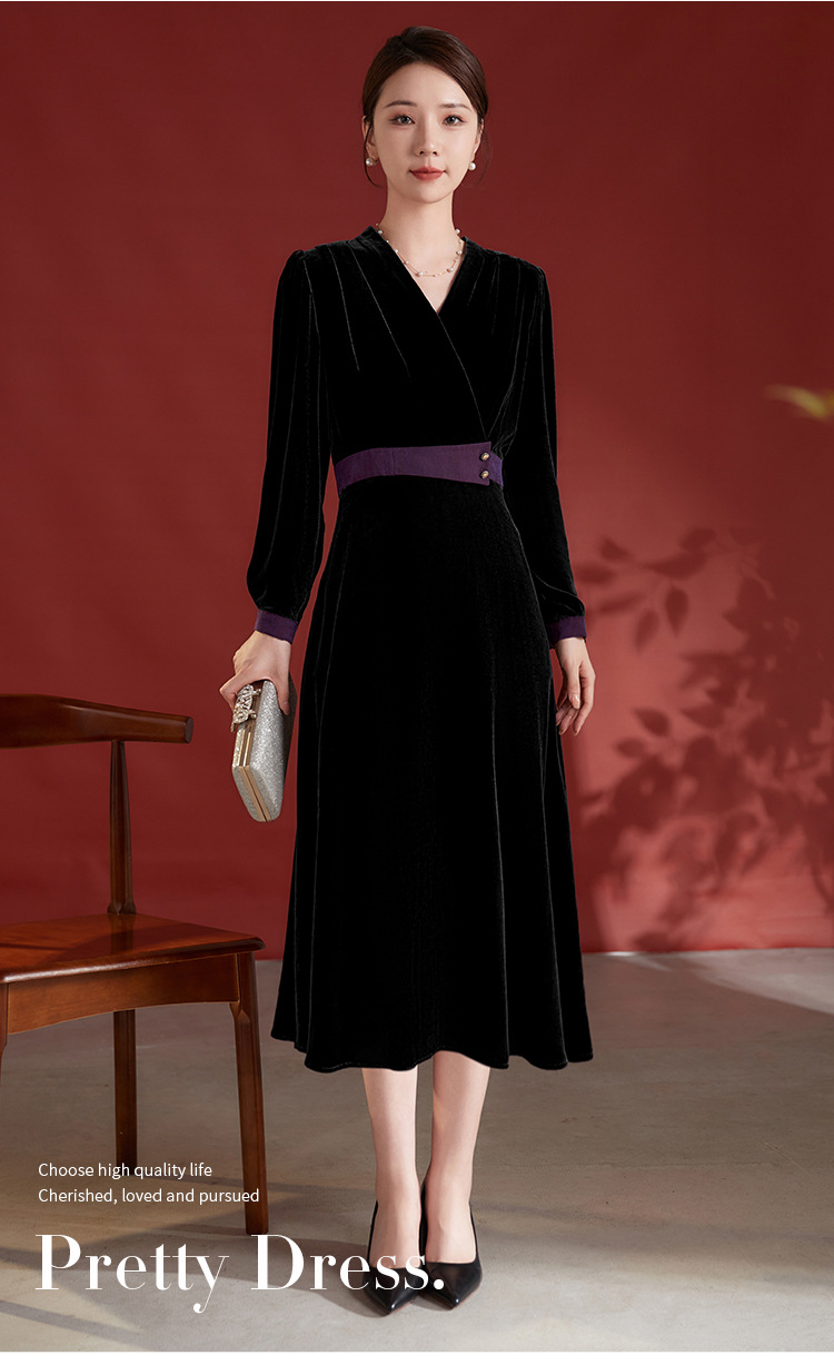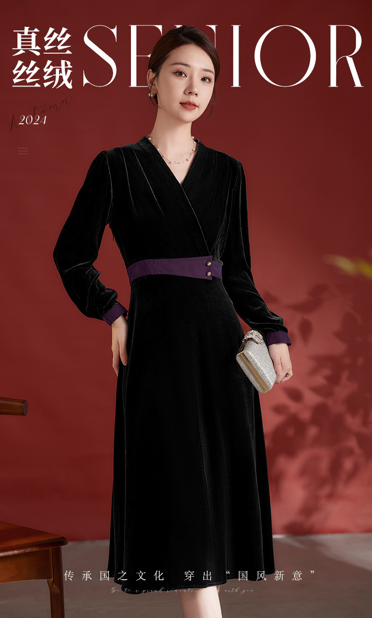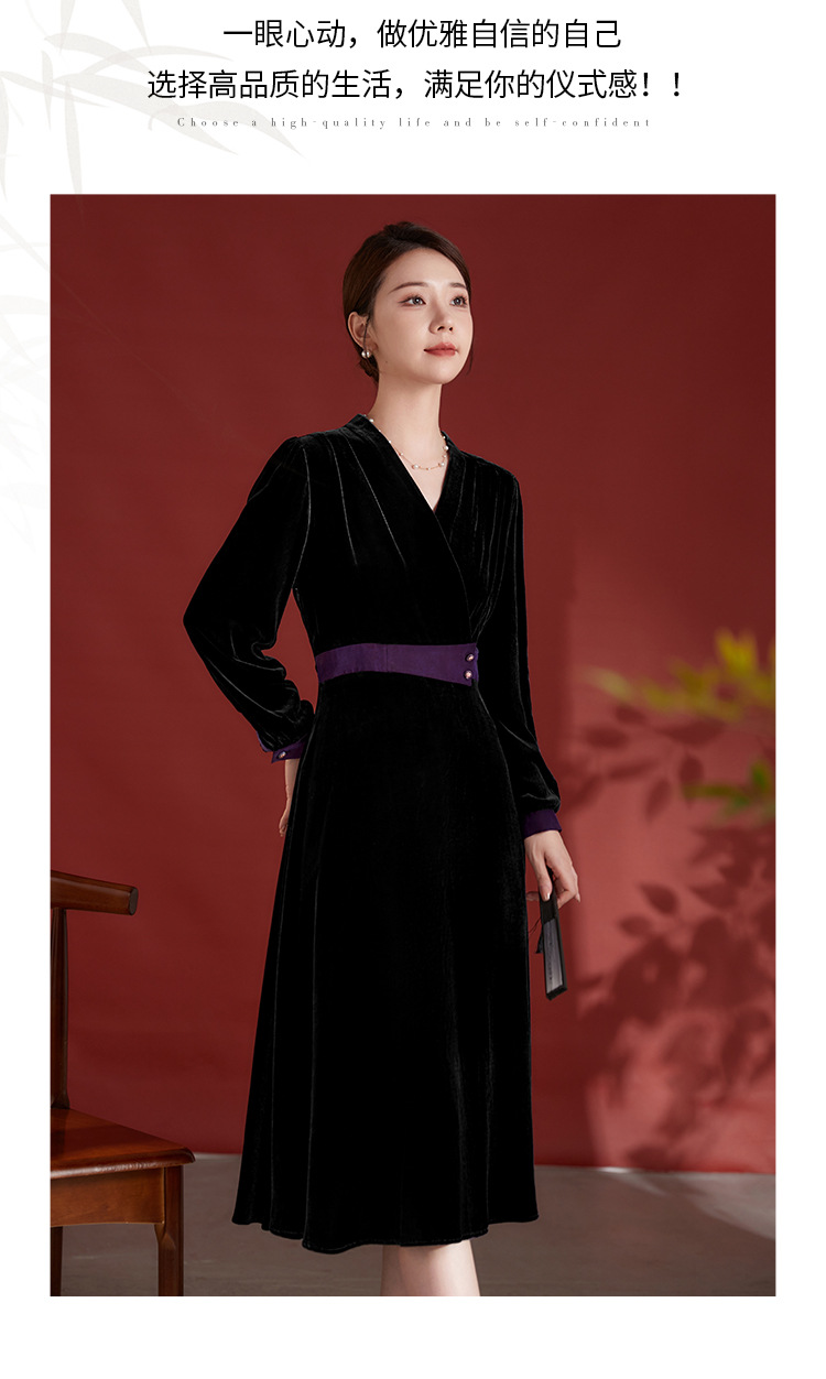 优雅气质真丝丝绒,V领收腰撞色连衣裙SM-82498512