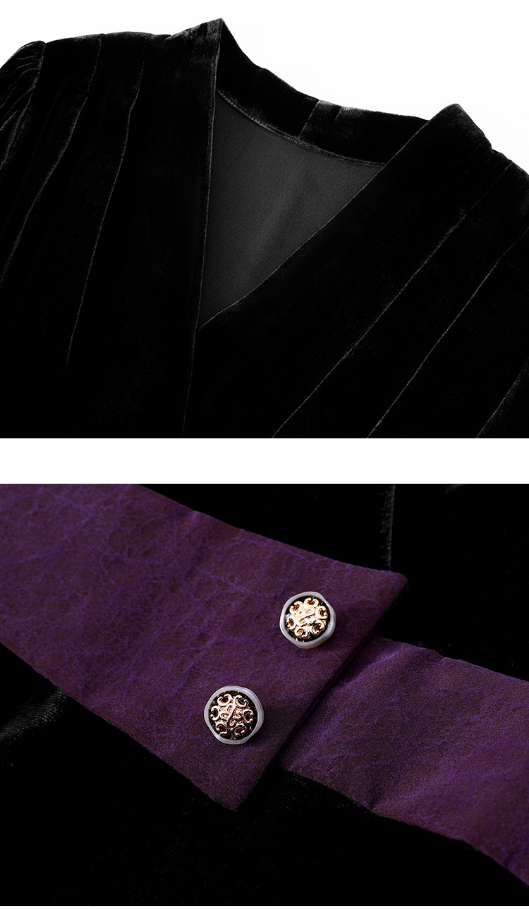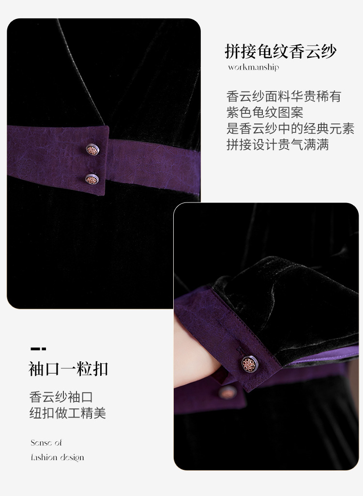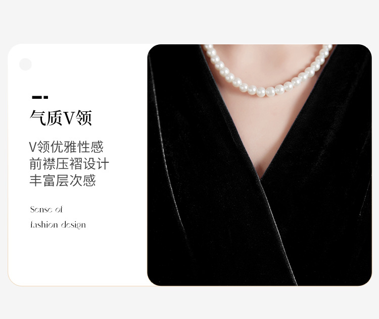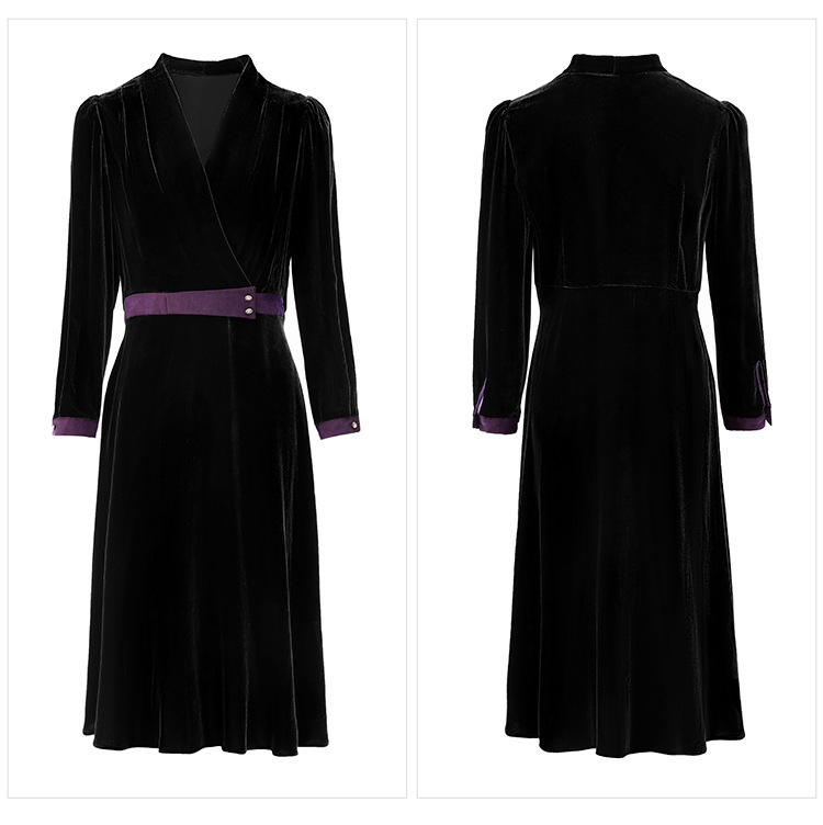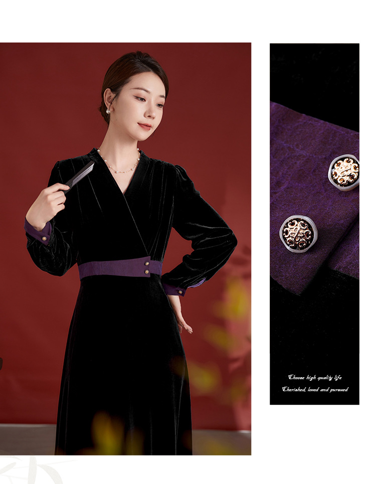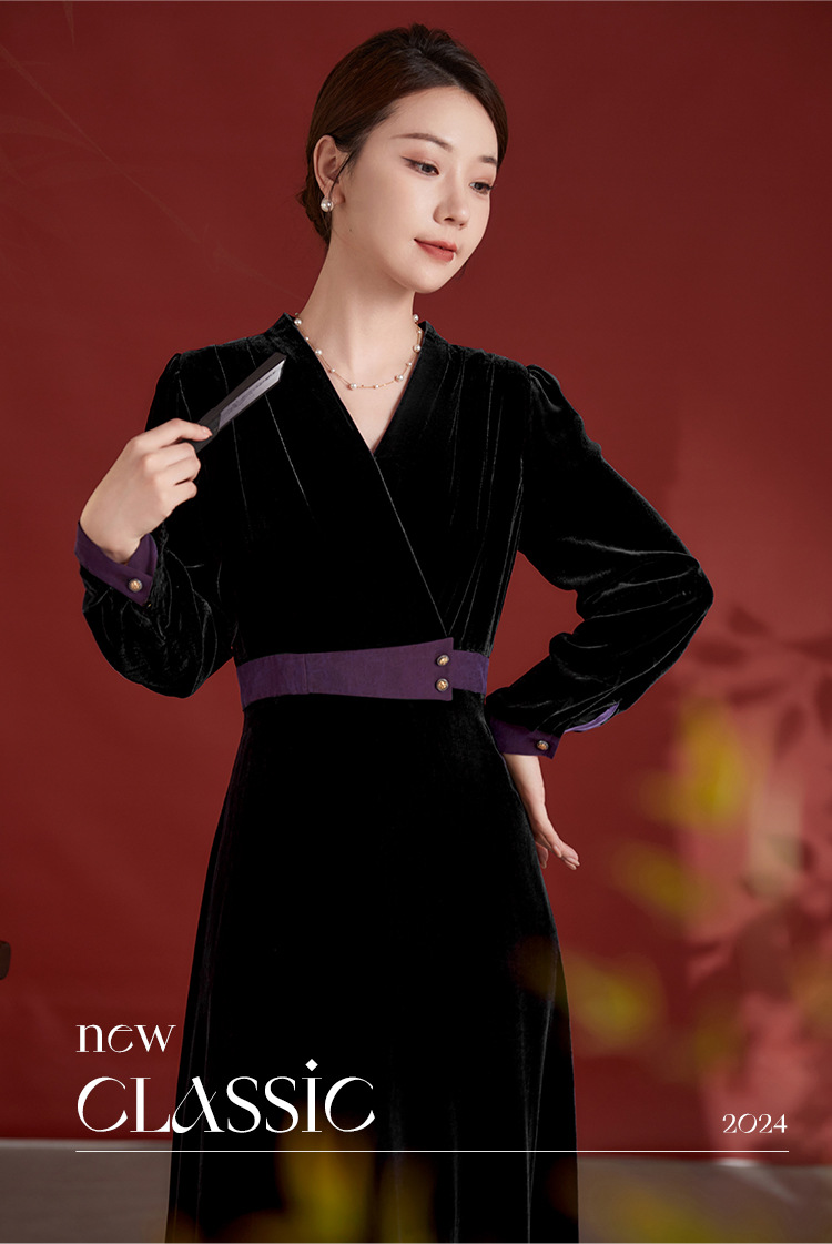 优雅气质真丝丝绒,V领收腰撞色连衣裙SM-82498512