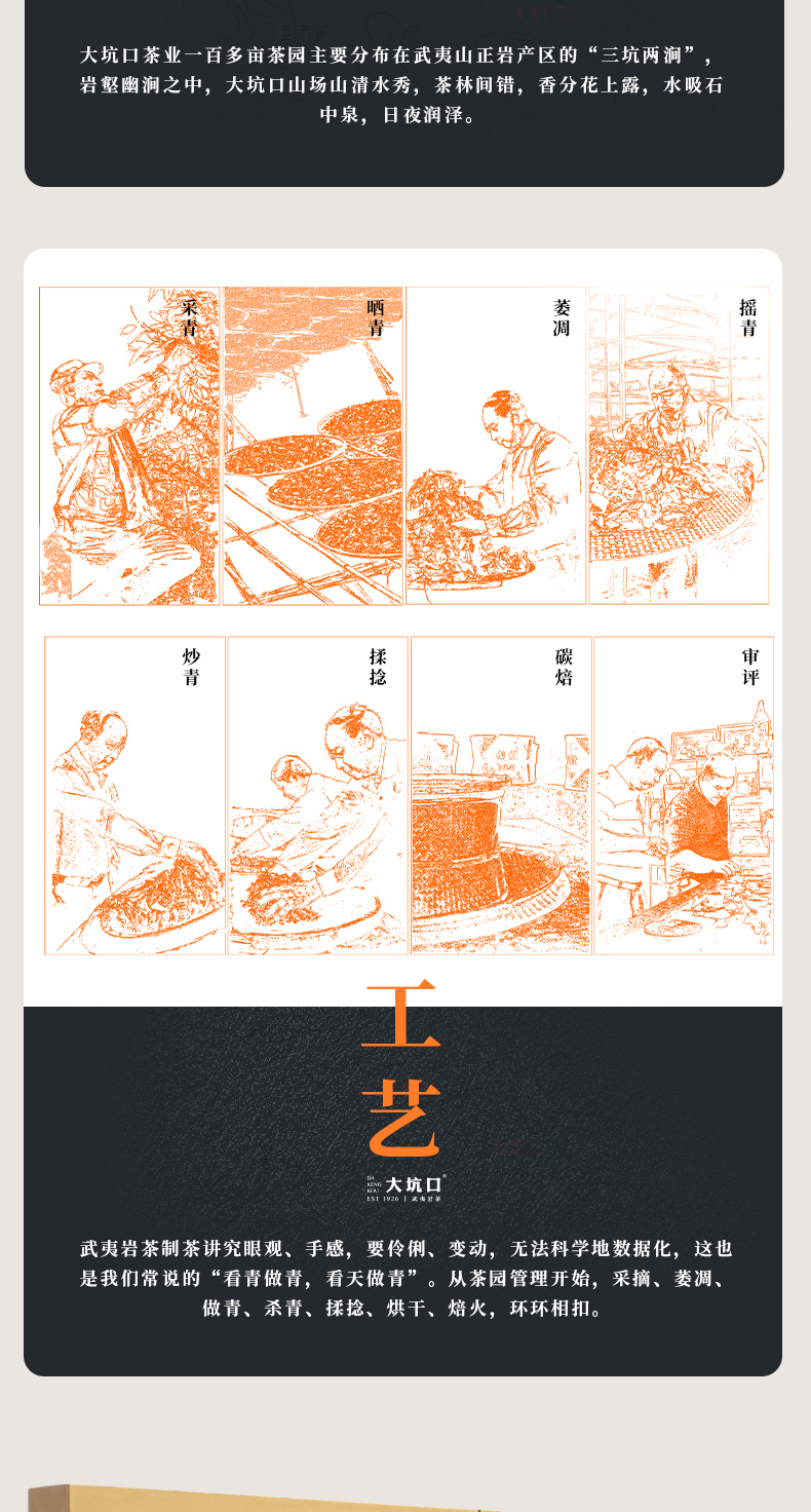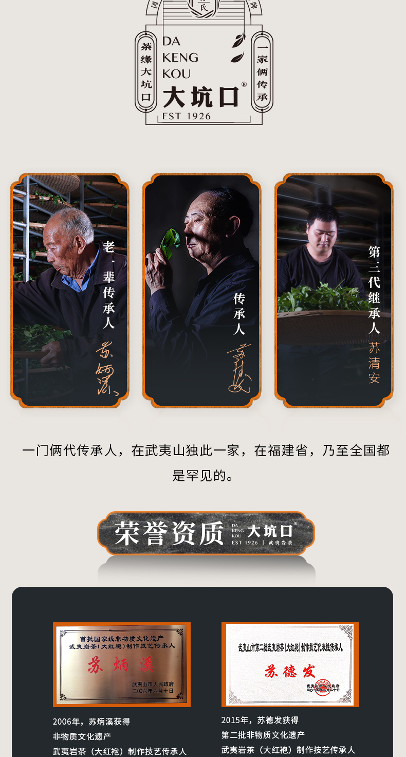 大坑口岩茶有限公司,位于武夷山市-天心村,茶山分布于正岩产区的“三坑、两涧”,由首批非物质文化遗产武夷岩茶制作技艺传承人:苏炳溪和第二批传承人:苏德发先生的精心手工制作,造就了大坑口岩茶的独特品质