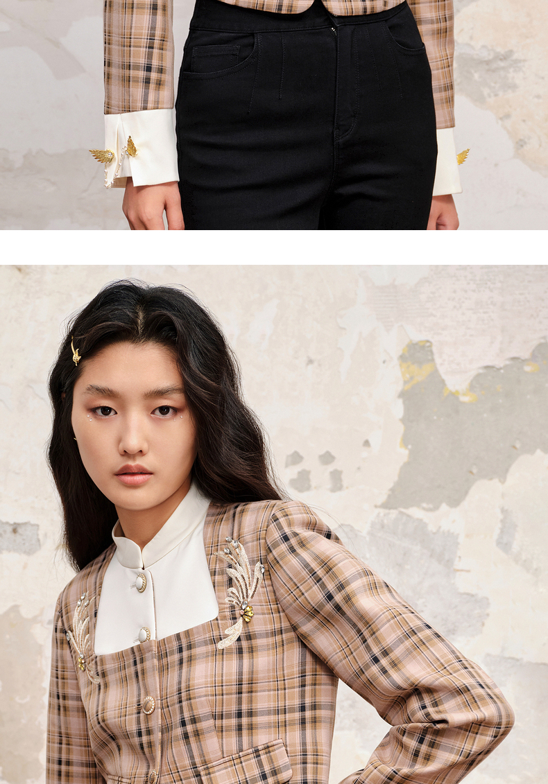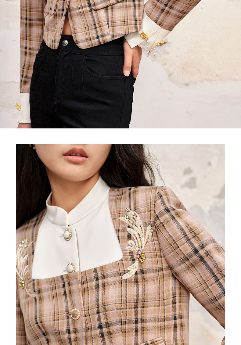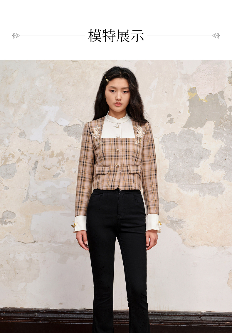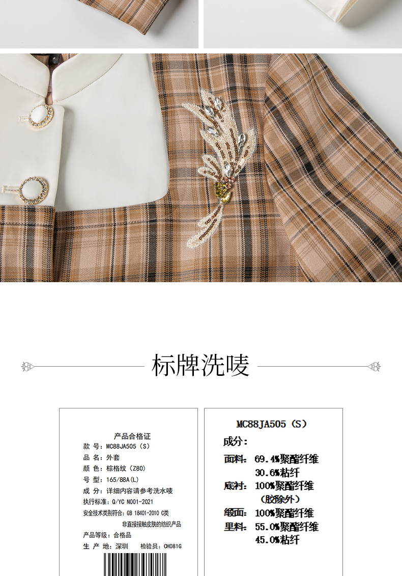 MAXRIENY复古格纹缎面解构外套美拉德穿搭(货号:MC88JA505)