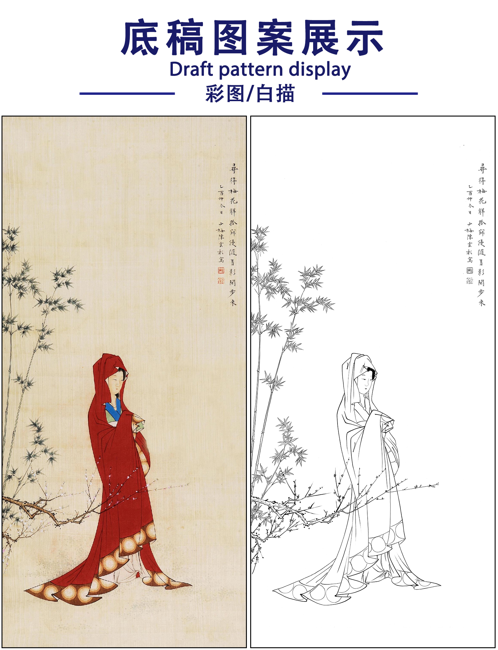 陈少梅人物仕女工笔画白描底稿《踏雪寻梅》临摹勾线高清打印稿SM62