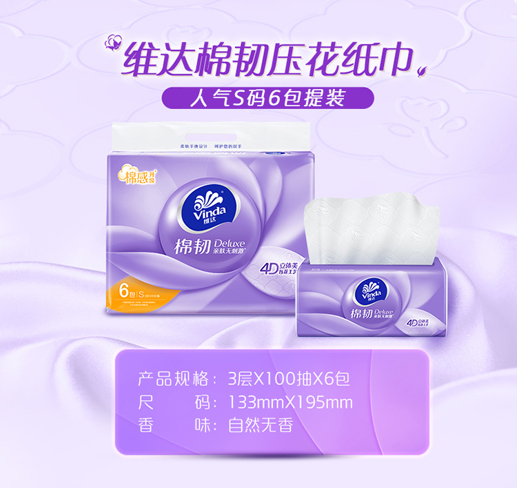 【官方包邮】维达棉韧抽取面巾3层S码100抽×6包
