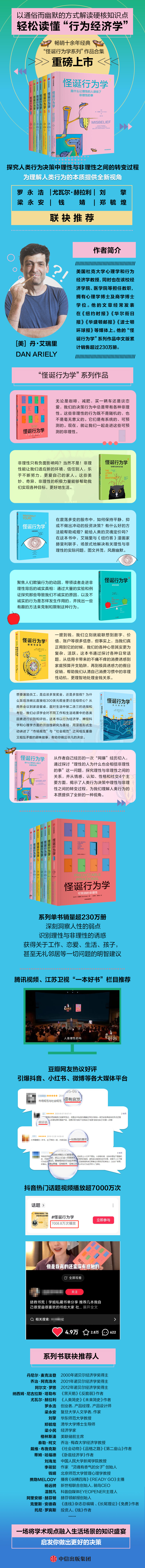 在本书中,丹•艾瑞里带我们进入了行为经济学领域,通过一系列实验研究颠覆了人们曾经普遍认同的我们的行为是完全理性的假设。无论是咖啡、减肥,买一辆车还是谈恋爱,我们的决策行为中总是带有各种非理性。