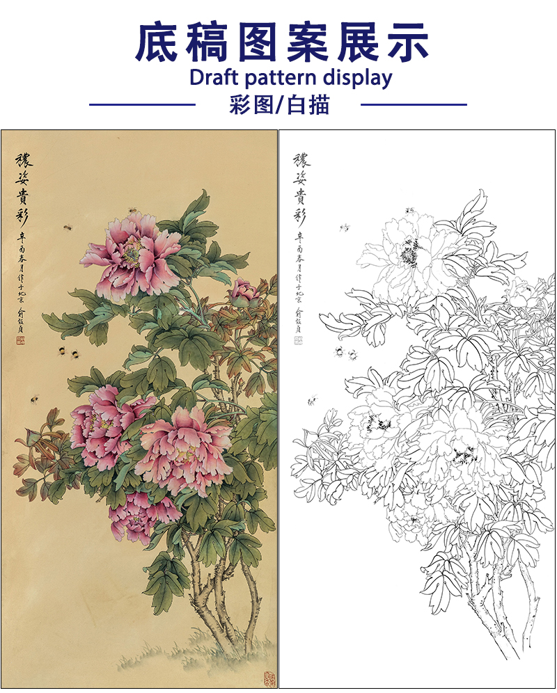俞致贞花鸟工笔画白描底稿《秾姿贵彩》牡丹临摹勾线高清打印稿ZZ79