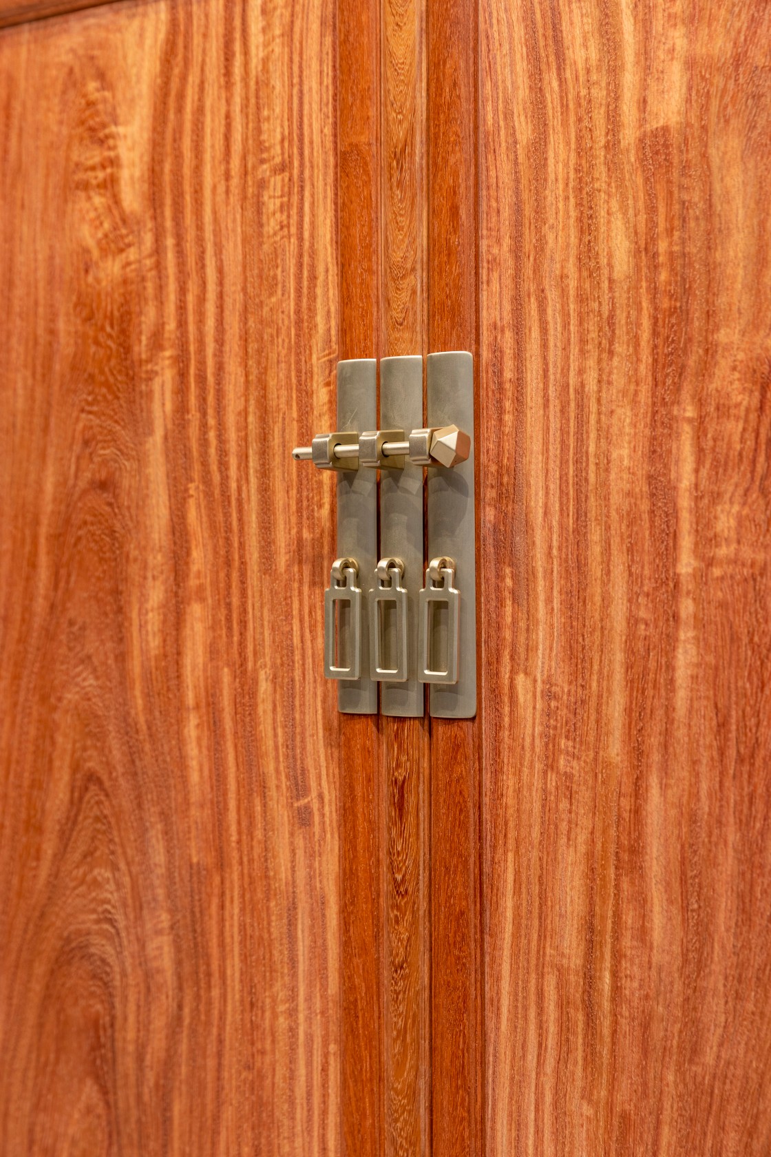 此柜整器全身光素,柜帽顶部平镶装板,可摆放器物,柜帽及柜门边抹混面,上下压边线,素牙头。柜门采用木门轴结构,可实现柜门自动闭合。柜门一木对开,纹理对称,有闩杆,中部搭配铜拉手。两扇木轴门,皆攒框打槽镶独板面心,边沿起阳线,细节考究精致,门板内面有穿带加固。柜内上部设抽屉两具,下设有屉板,分隔空间。此柜侧脚显著,腿足外圆内方,柜腿间四面安光素刀牙板。此柜为木轴门柜的最基本式,整体造型简约明朗,意呈材质自然天趣。