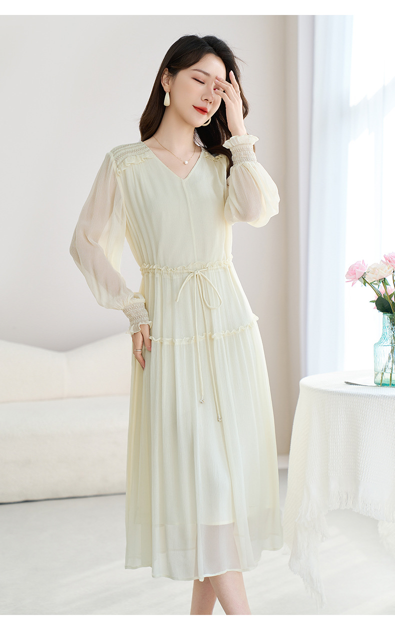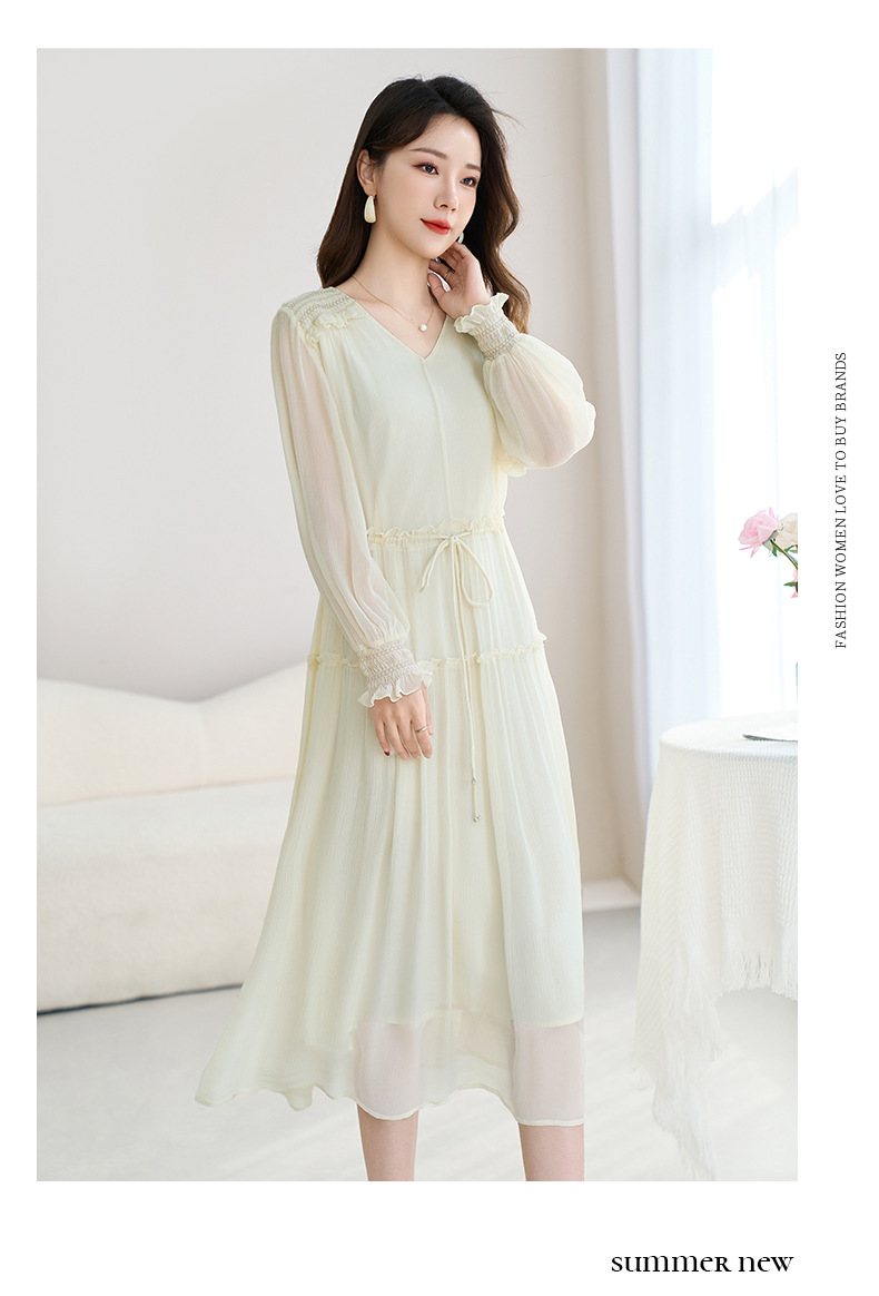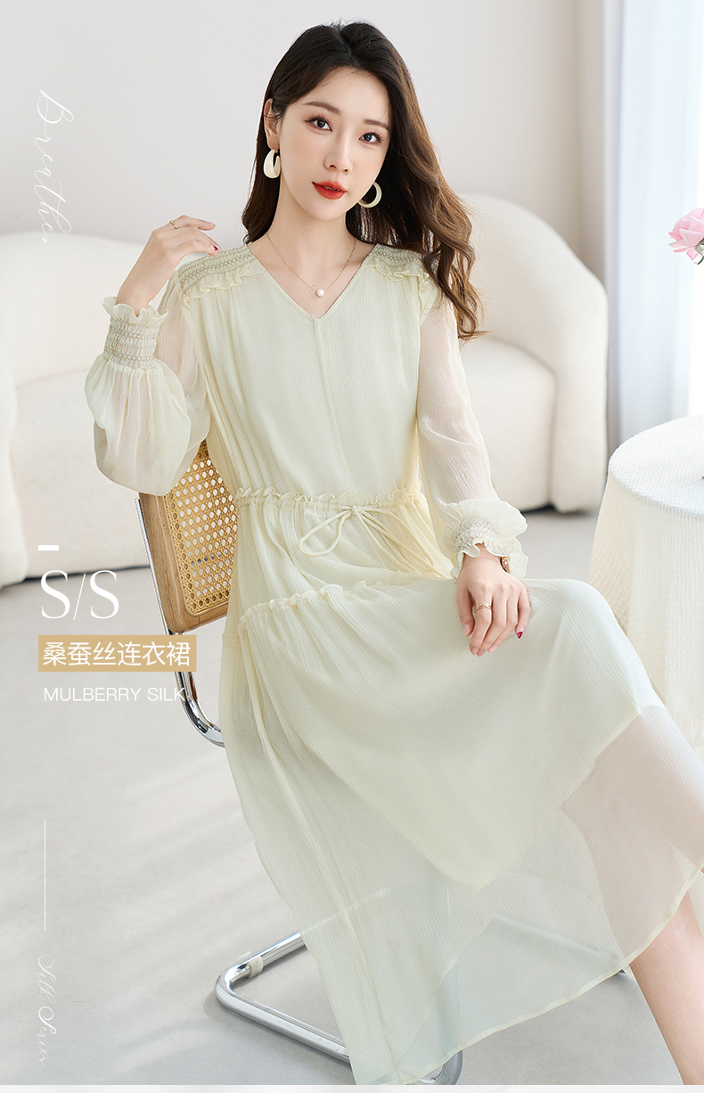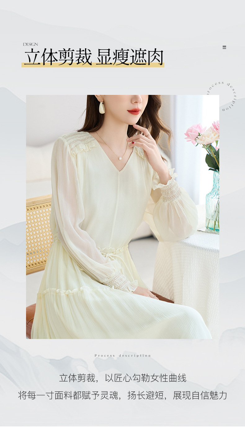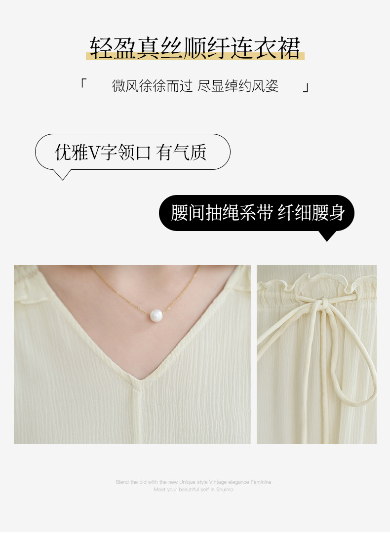 QS-82599788【减龄显瘦】100%桑蚕丝中长裙文艺气质修身V领真丝连衣裙9788