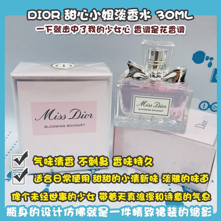 DIOR 迪奧甜心小姐淡香水 30ML👍瓶身的设计仿佛就是一件精致裙装的缩影,带着精致蝴蝶结的瓶口🎀,一下就击中了我的少女心。香调是花香调🌸,前调:橘子🍊;中调:玫瑰、牡丹;后调:白麝香,广藿香🌾。气味清香,不刺鼻,香味持久,萦绕在身旁,适合日常使用🍃。甜甜的小清新味,淡雅的味道,甜而不腻,像个未经世事的少女,🌱带着天真浪漫和诗意的气息,走进大人的世界🌌。