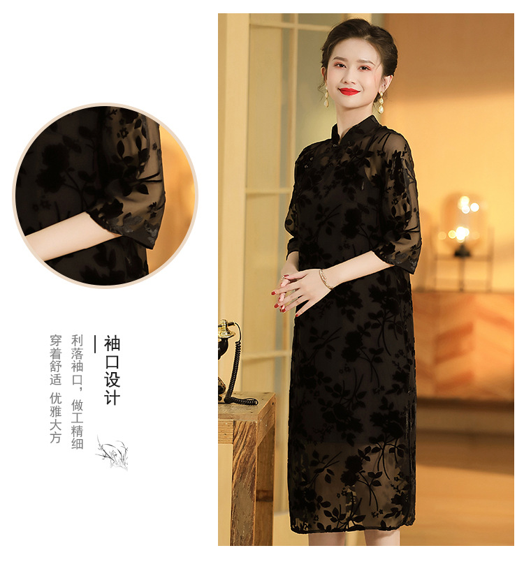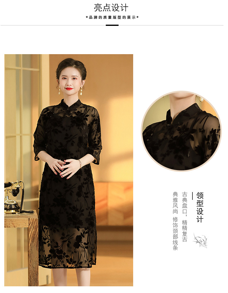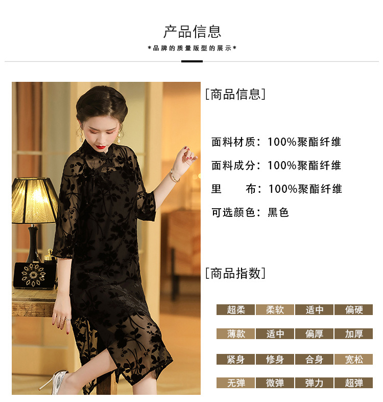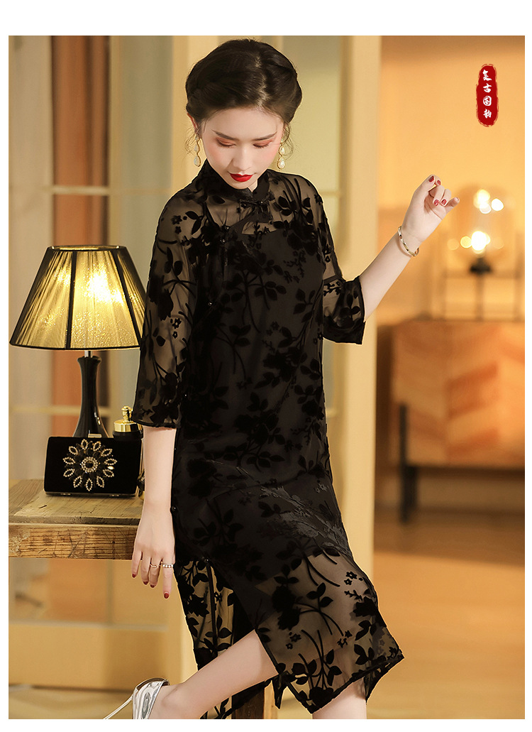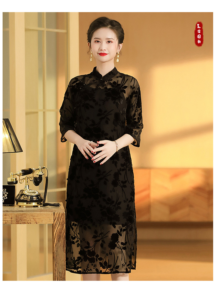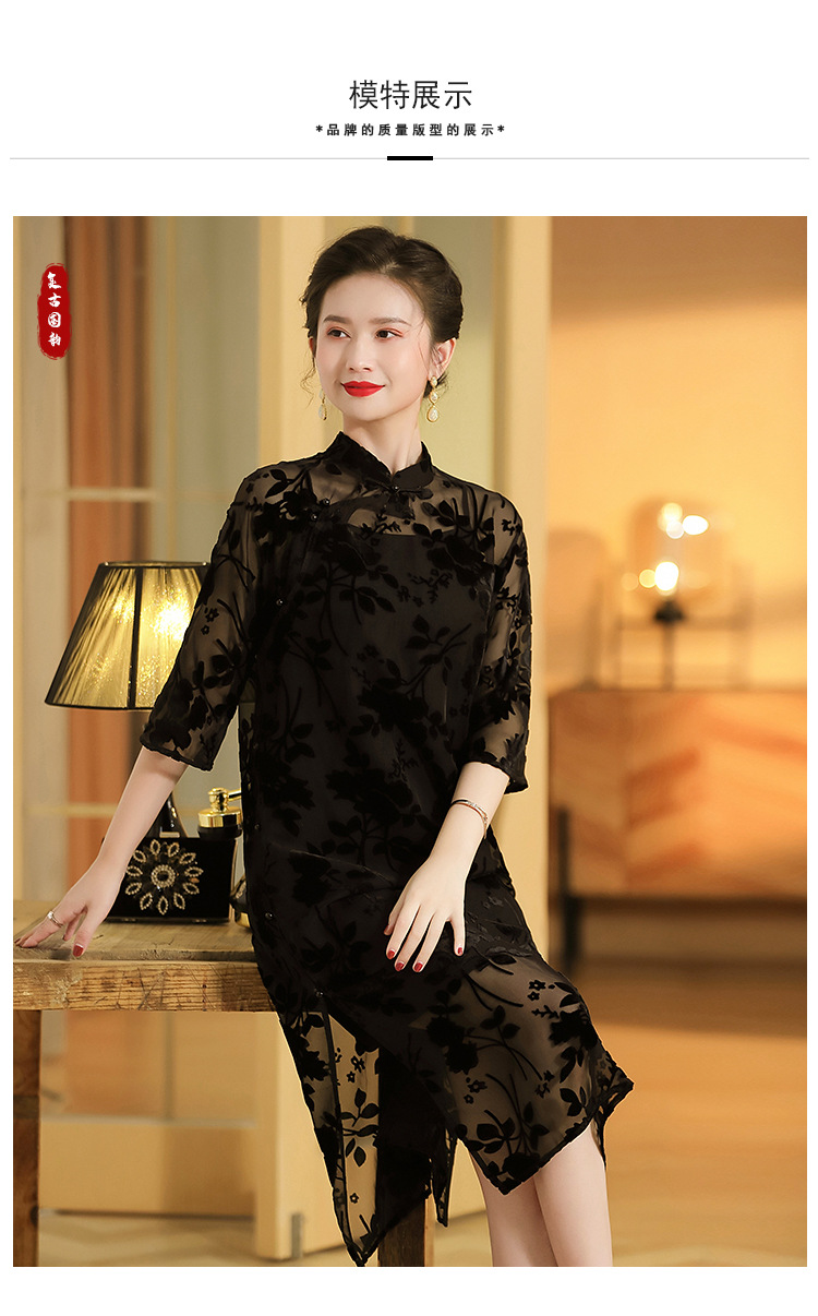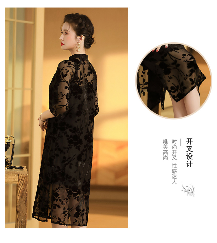 上海旗袍厂AYK-QF-200723-7烧花改良立领旗旗袍裙修身七分袖中长款a字裙旗袍