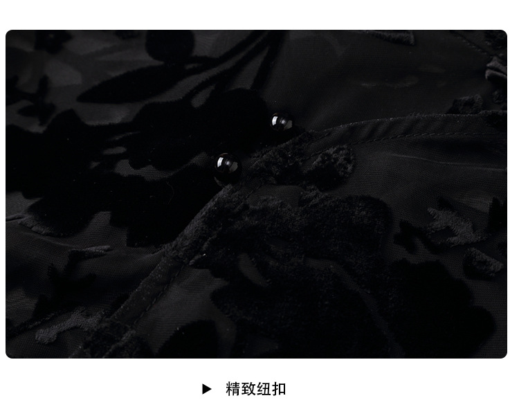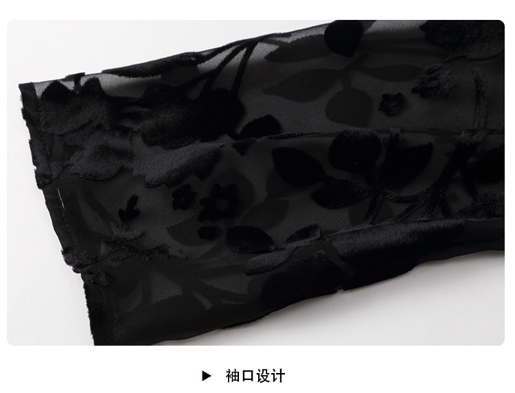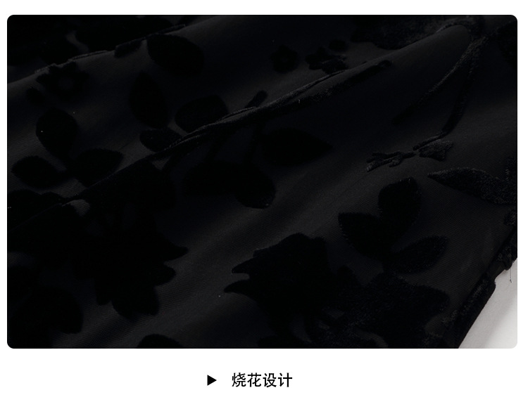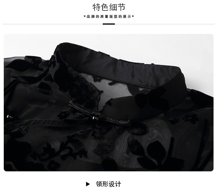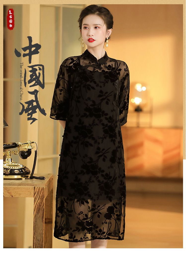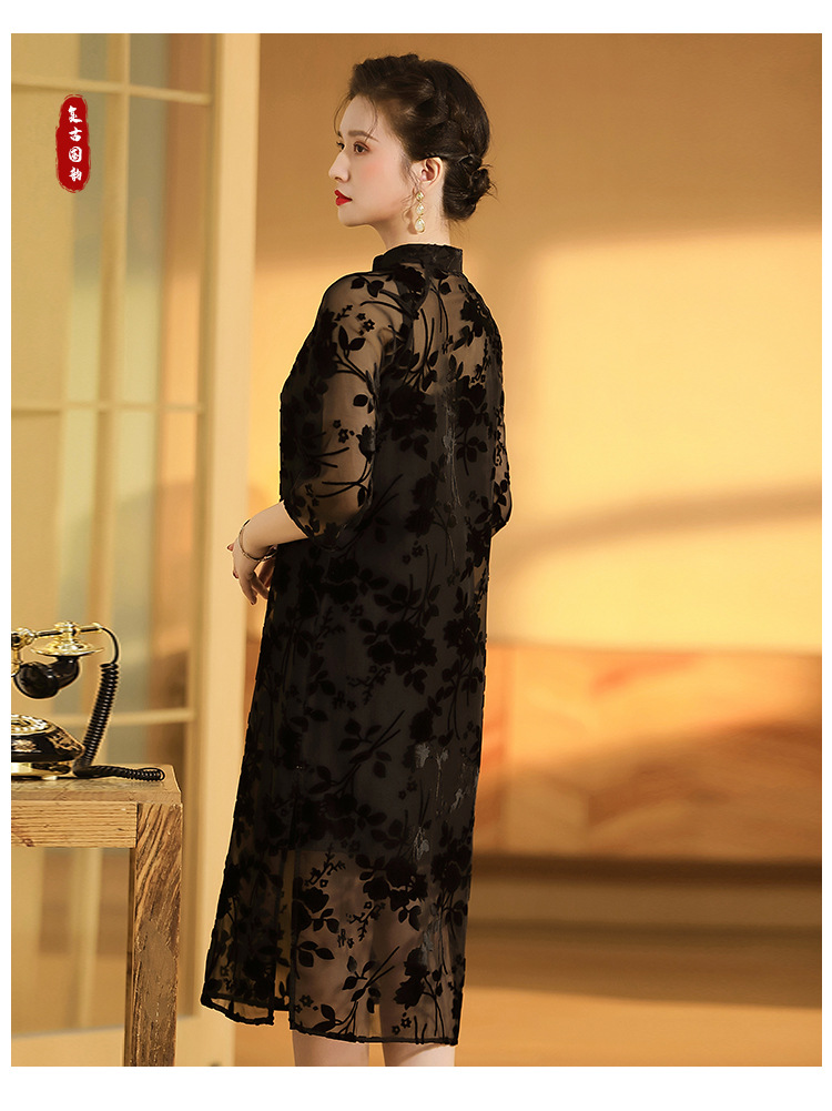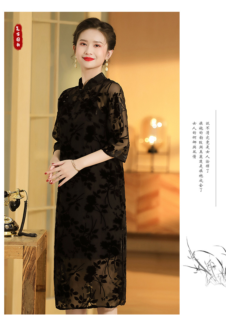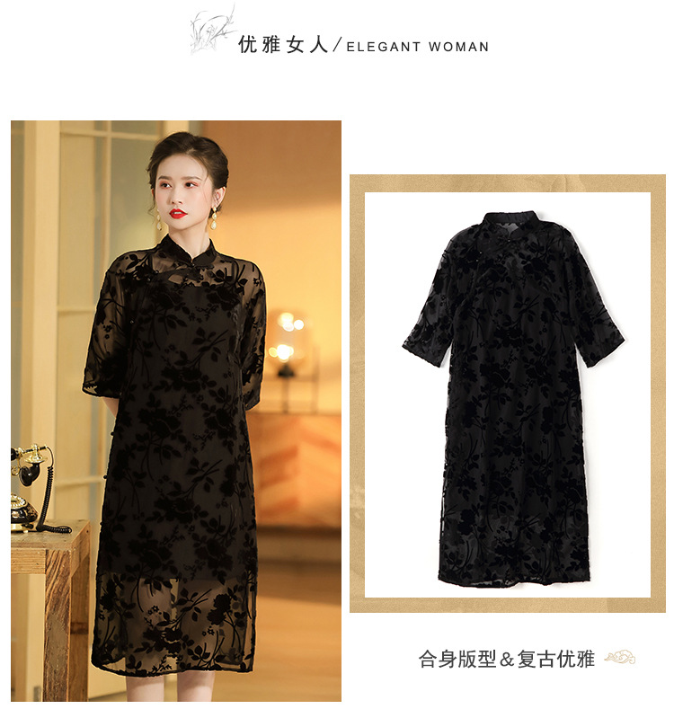 上海旗袍厂AYK-QF-200723-7烧花改良立领旗旗袍裙修身七分袖中长款a字裙旗袍