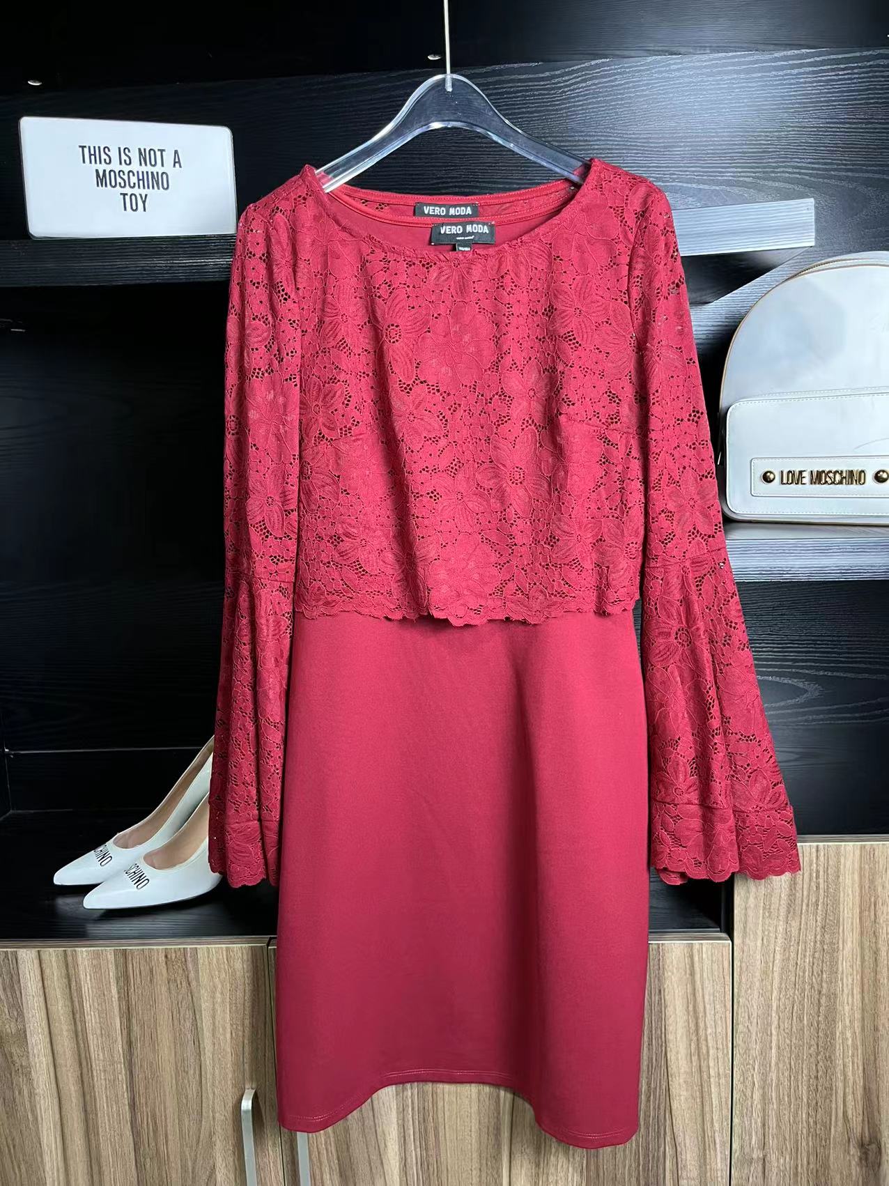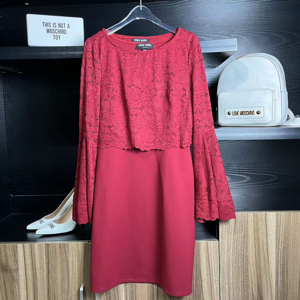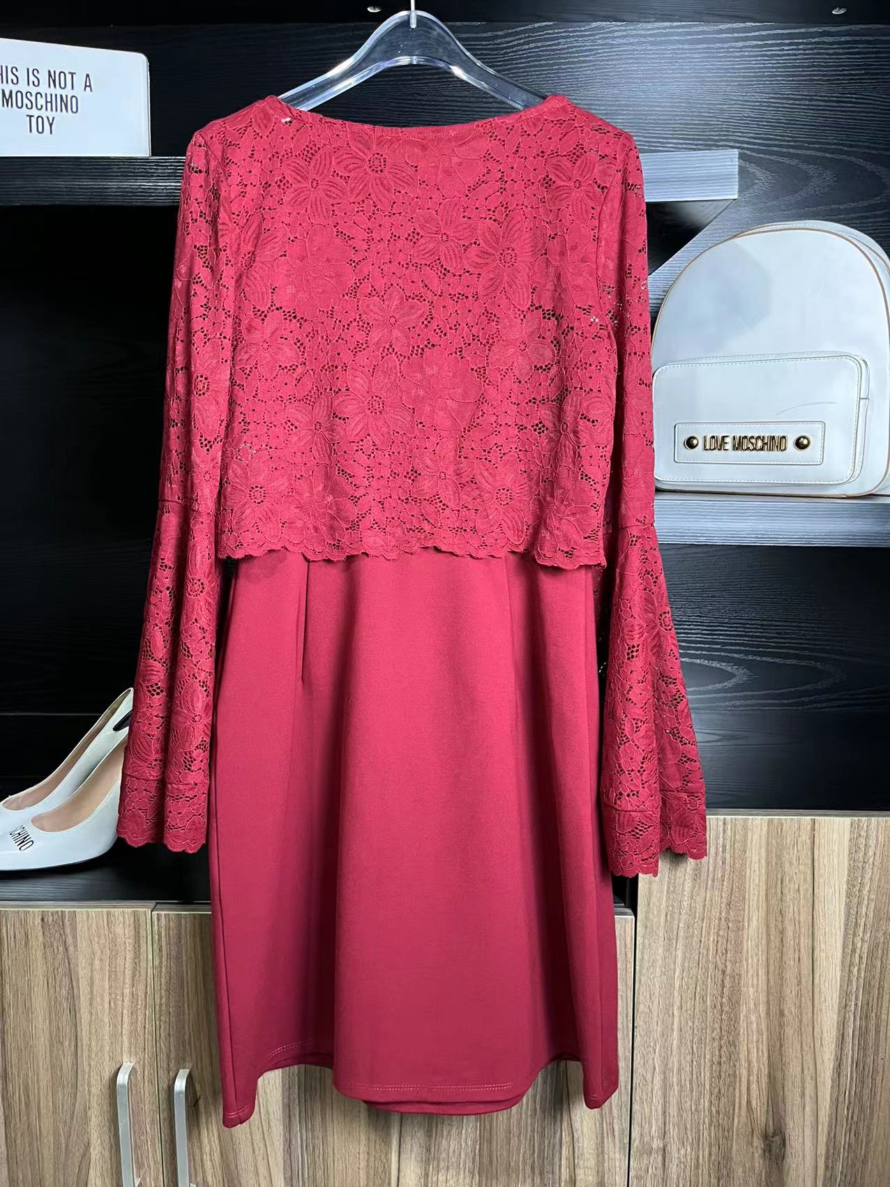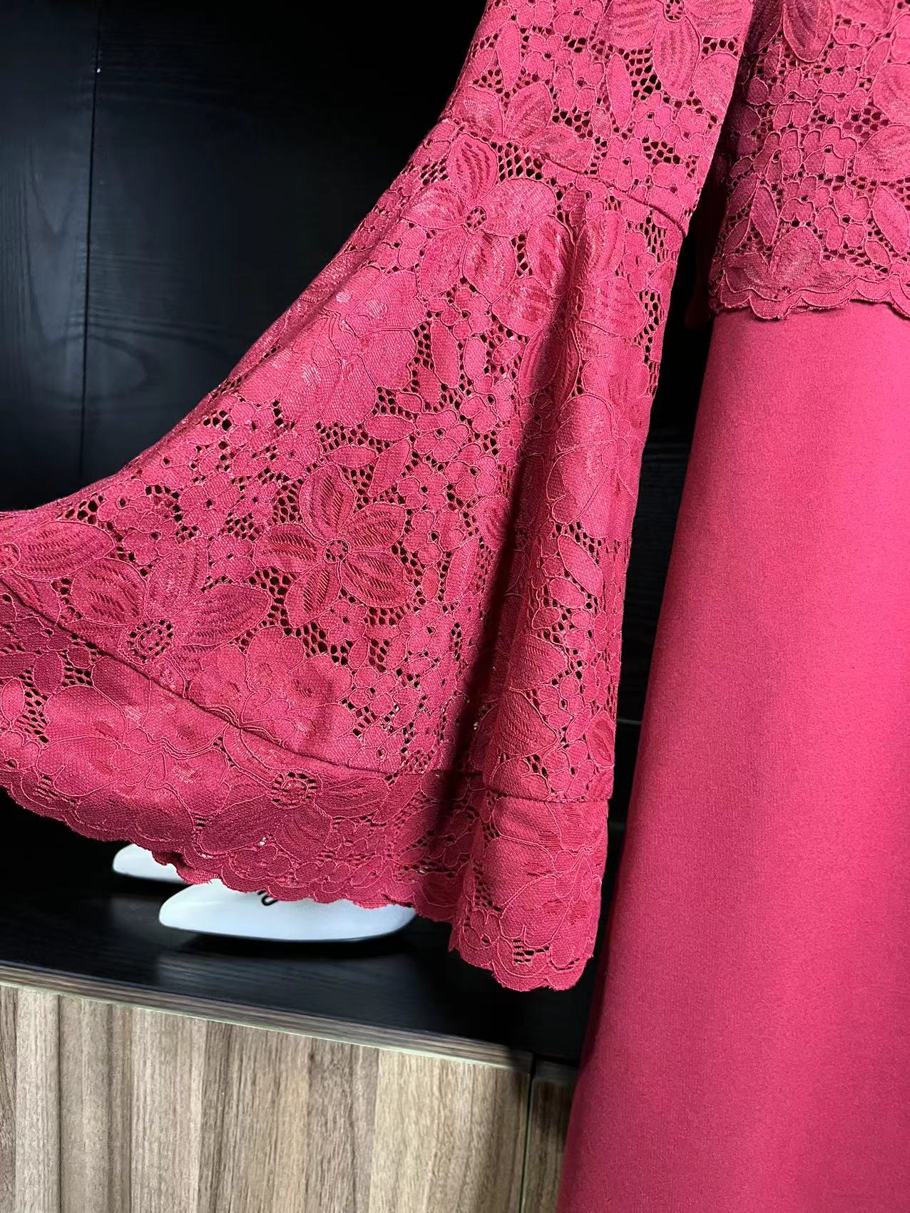 复古红色,袖子是 喇叭袖 ,下摆是弹力罗马布,这款S码 建议 90-110斤之间穿 ,外面的蕾丝外罩是可以单独脱下来穿的,很好看,里面搭配一个裹胸或者吊带,穿上超级显洋气!单穿外罩,125斤以内随便穿