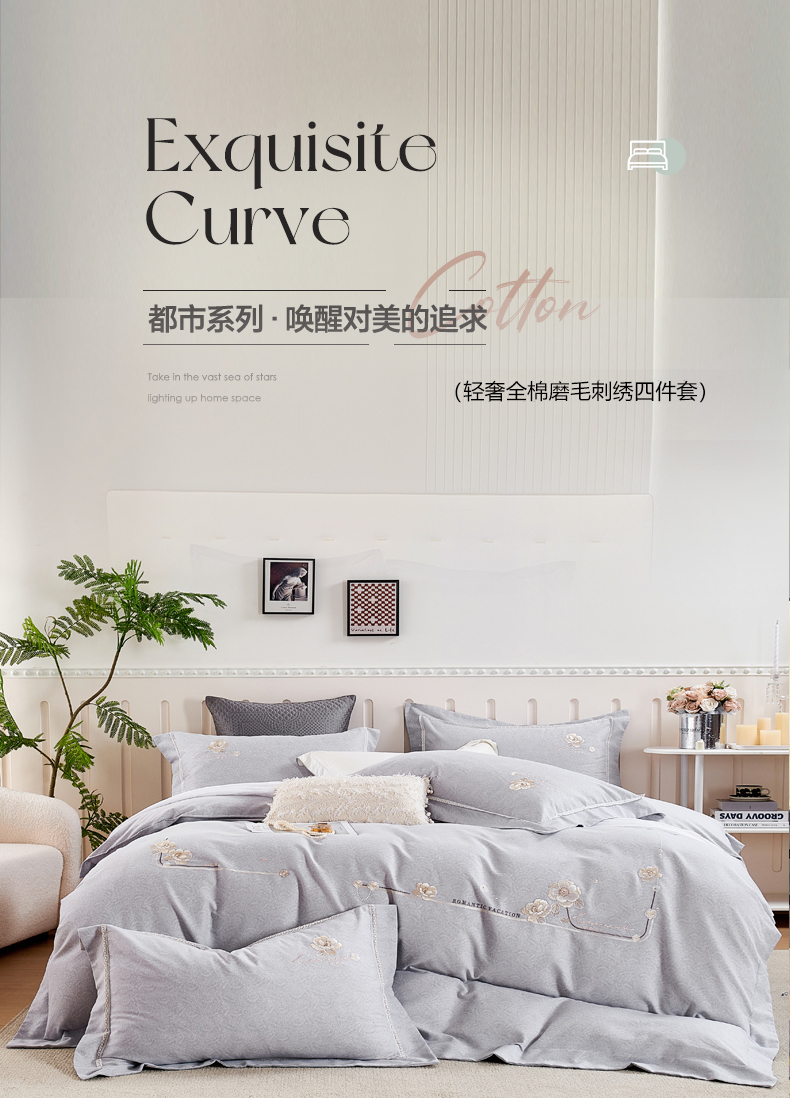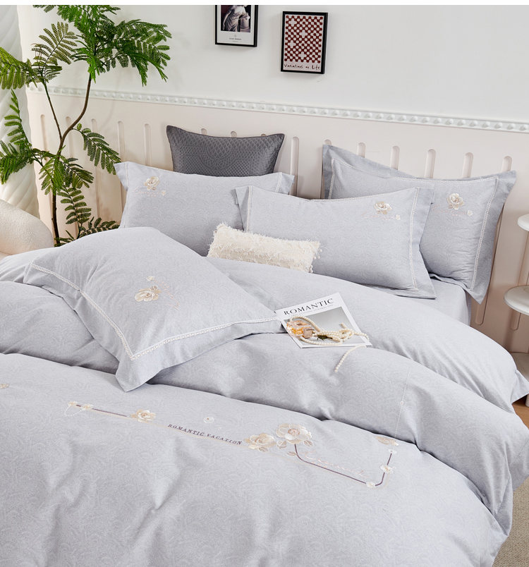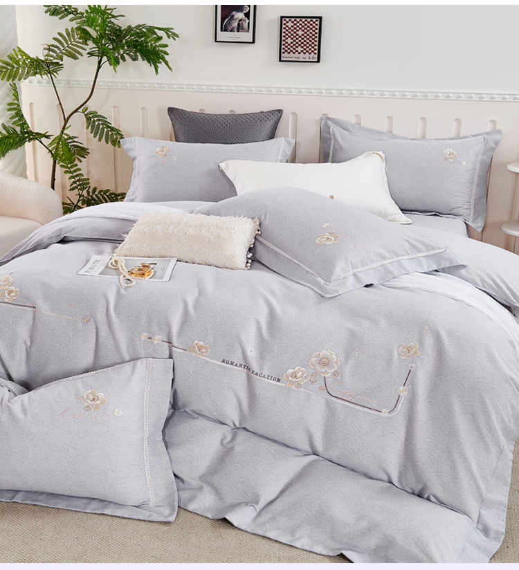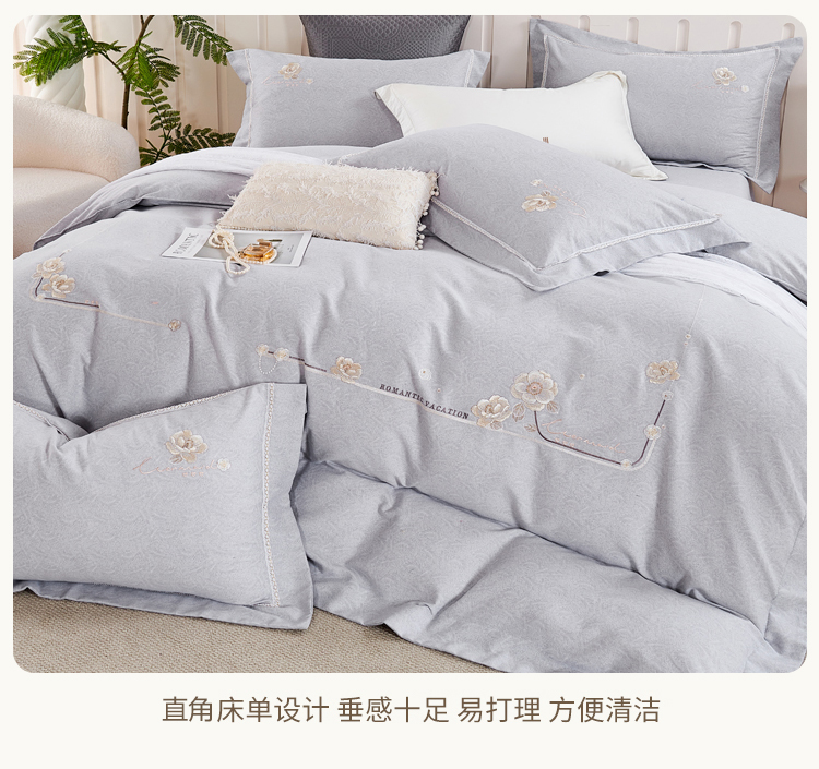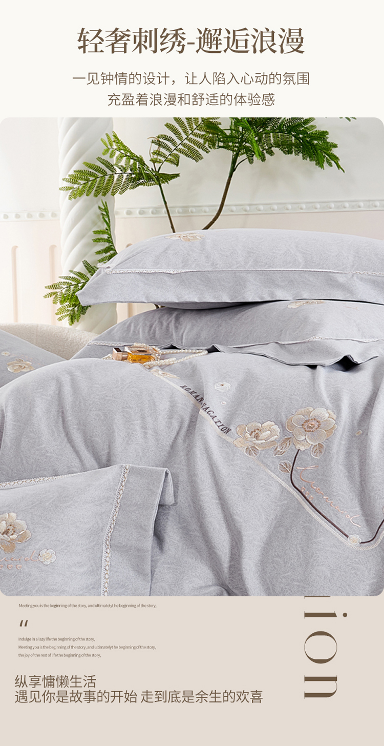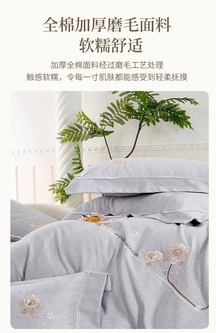 轻奢全棉磨毛刺绣四件套【悠梦嘉居轻奢全棉磨毛刺绣四件套YJ1569 全棉磨毛面料,刺绣工艺,轻奢风大版纯色,时尚高档,适合1.5/1.8床使用,典雅灰】