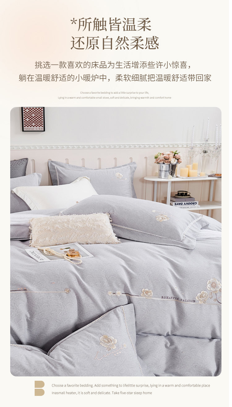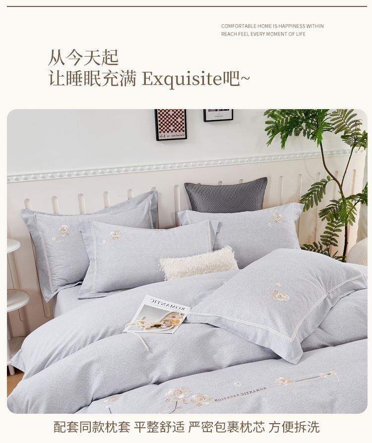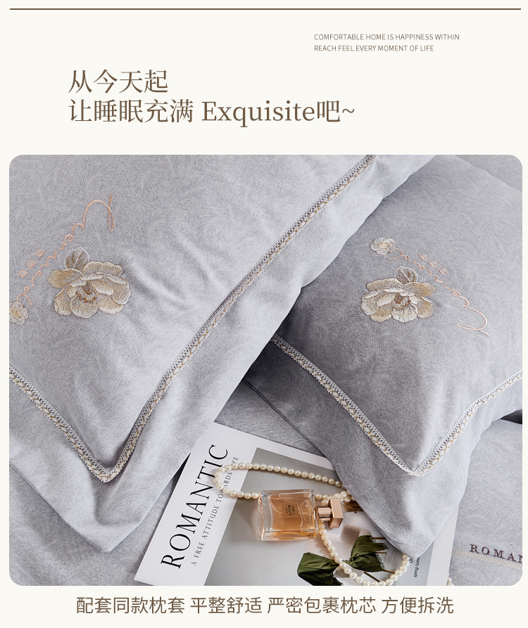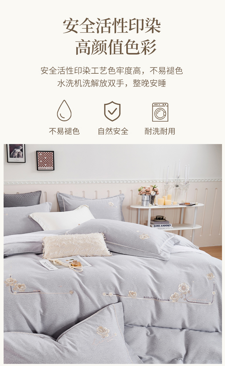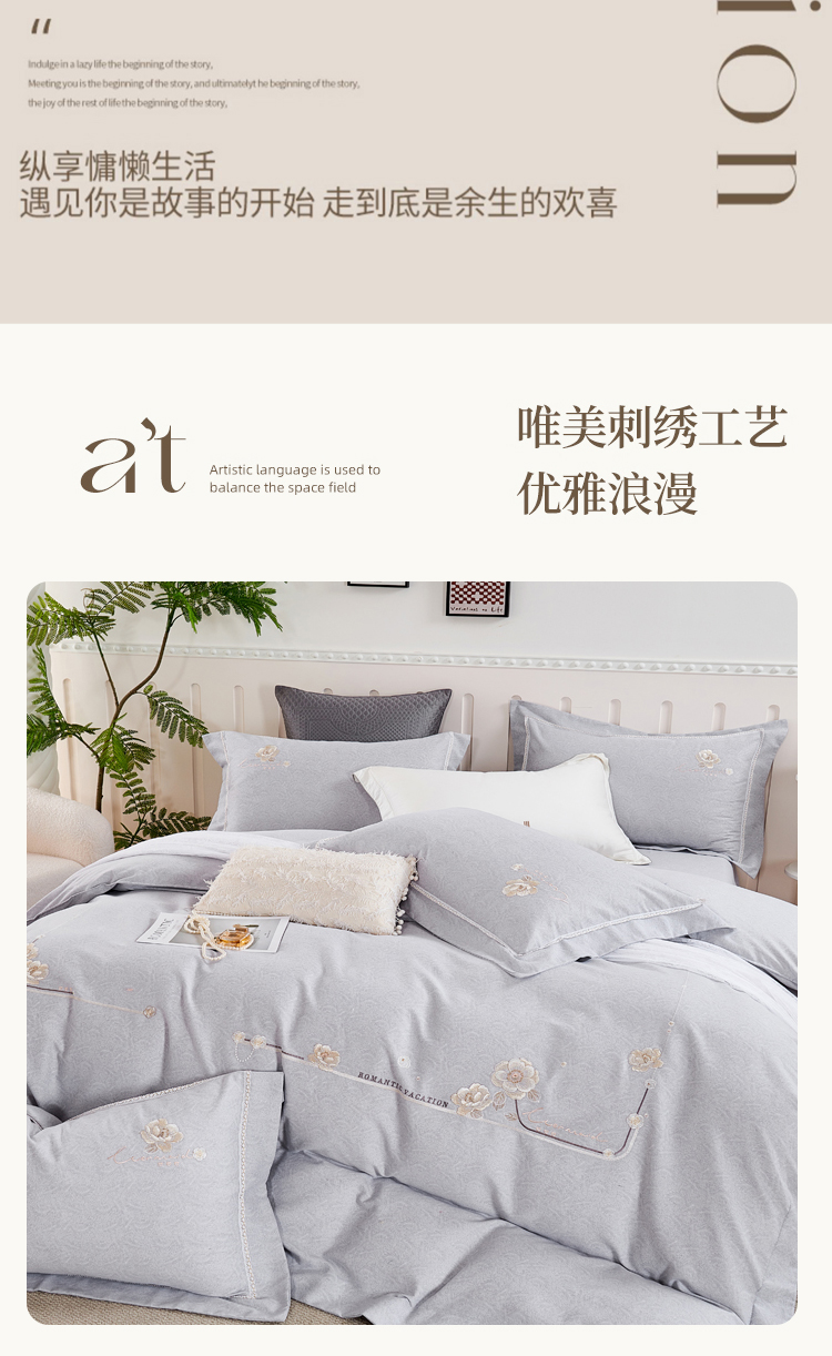 轻奢全棉磨毛刺绣四件套【悠梦嘉居轻奢全棉磨毛刺绣四件套YJ1569 全棉磨毛面料,刺绣工艺,轻奢风大版纯色,时尚高档,适合1.5/1.8床使用,典雅灰】