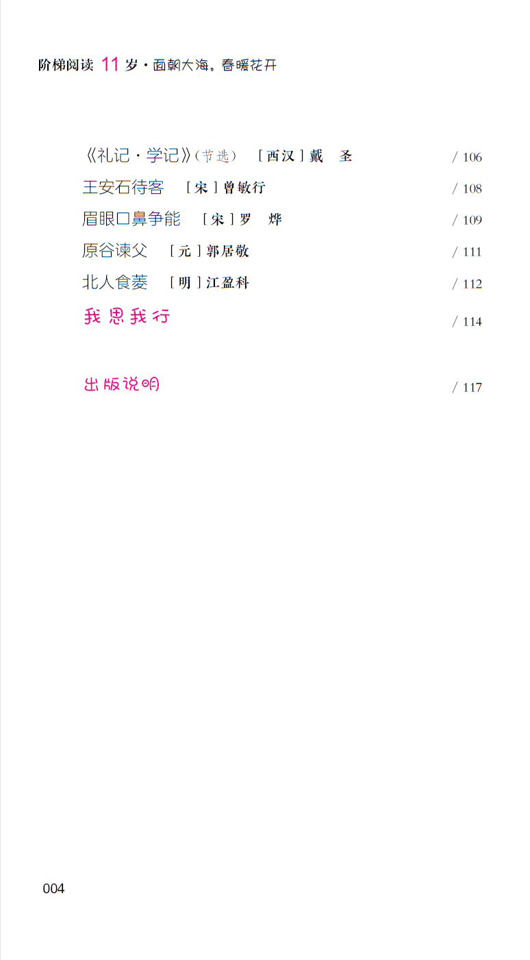 “全民阅读,阶梯文库”丛书借鉴国外分级阅读理念,根据0-18岁不同年龄段读者的心智特点与认知水平编写,标识明确的年龄段,由易到难,循序渐进。按照体裁或内容划分单元,涵盖诗词曲赋、文史哲经、科普科幻等方向。
