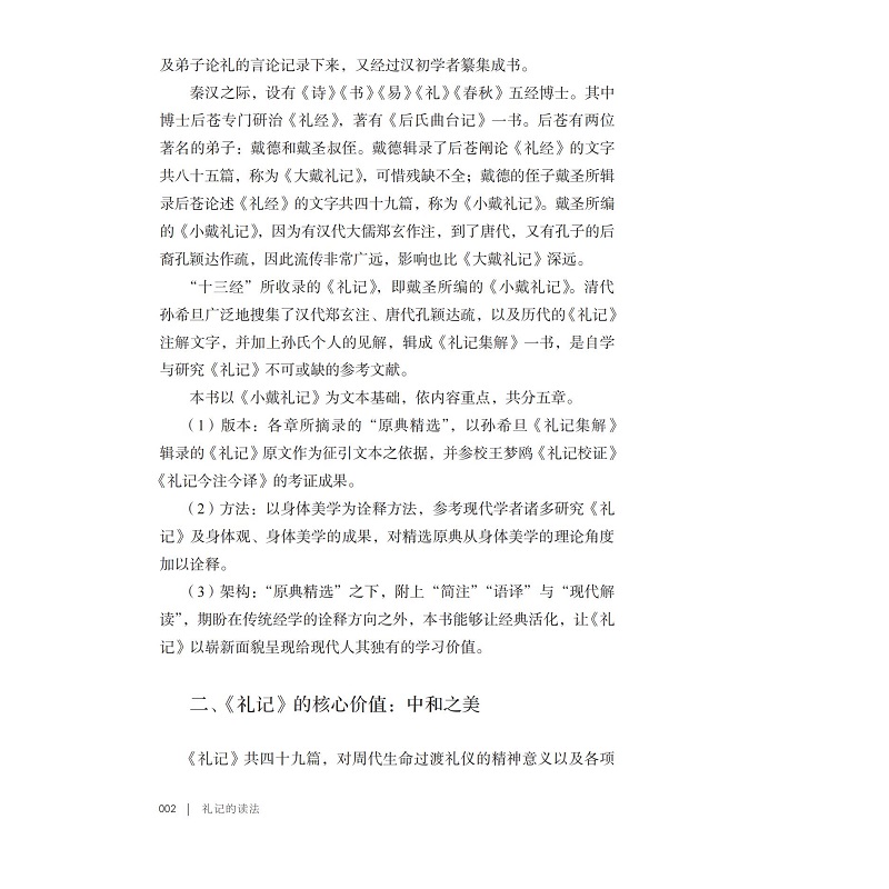 本书以《小戴礼记》为文本基础,依内容重点,分五章进行解读,即说礼:礼学概论、生活游艺的威仪化身体、即身涵德的艺术化身体、以体践礼的社会化身体、身体美学的终极理想。本书以 “身体美学” 为诠释方法,参考现代学者诸多研究《礼记》及 “身体观”“身体美学” 的成果,对精选之原典从 “简注”“语译”“现代解读” 三个版块进行详细讲解,并加以 “身体美学” 的理论诠释,期盼在传统经学的诠释路向之外,让经典活化,为现代人指出了另一条认识《礼记》所具有的价值之崭新面貌。