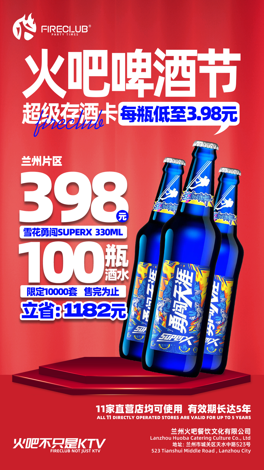 【兰州通用】118火吧啤酒节—超值存酒卡—398元100瓶雪花superX330ml