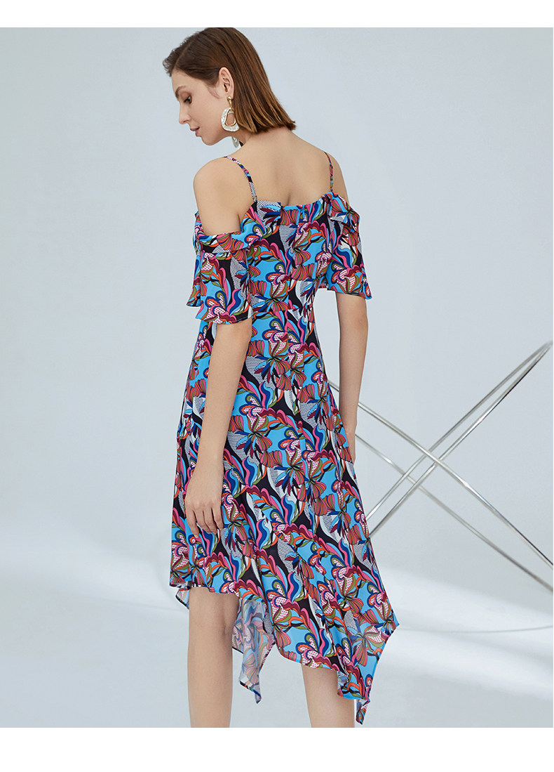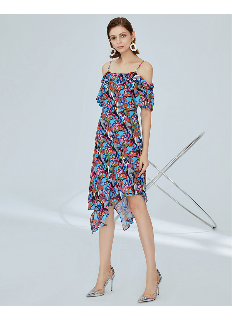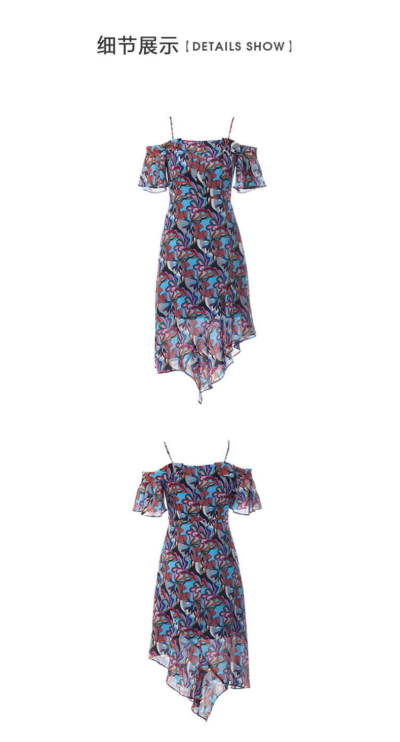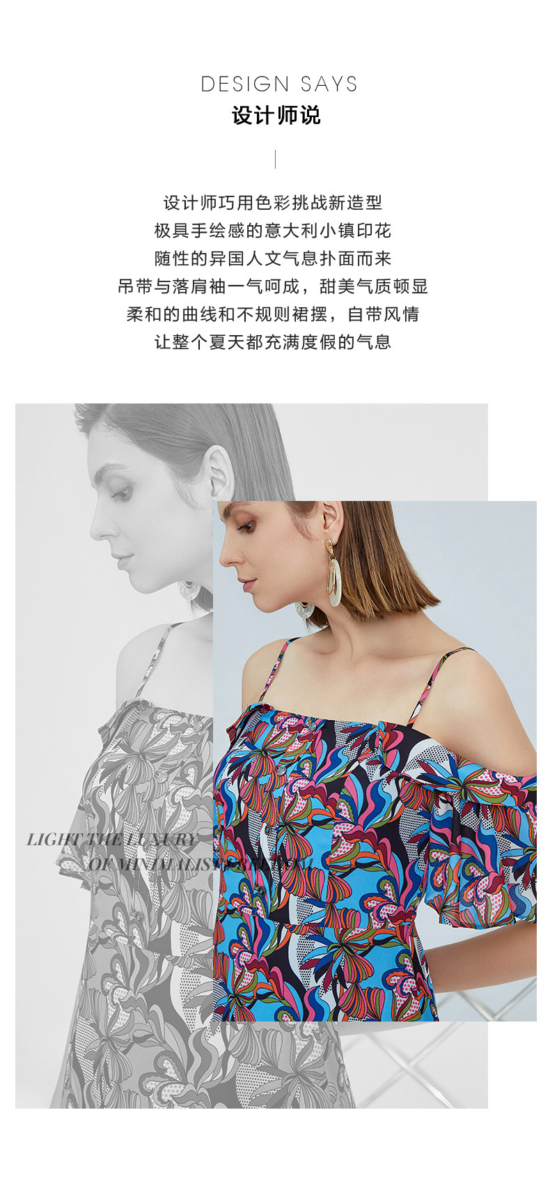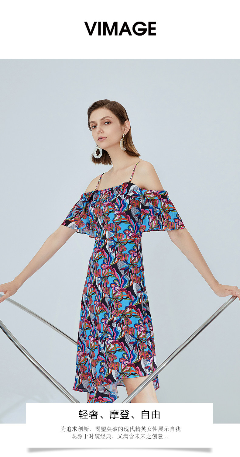 VIMAGE纬漫纪女装夏季度假风不规则裙摆雪纺吊带印花裙薄V1107765