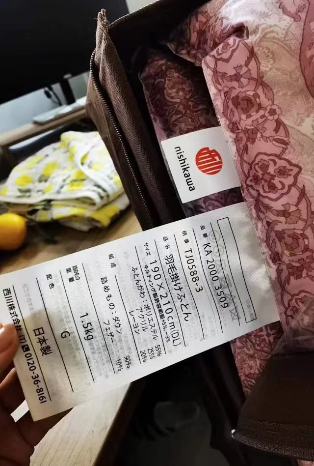 这条西川鹅绒被,被子外壳采用40支200X160的西川经典纯棉印花面料,做过预缩柔软处理,充绒是 90%日标的白鹅绒10%羽毛,清洁度为1000(保证百分百安全的羽绒),蓬松度是396(大于日标90%白鹅绒标准380以上)。这些数据都来源我们的日本检测报告。