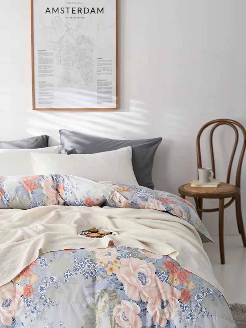 今年的花色有花舞和宫廷花。宫廷花是西川的经典花型,另一个花舞,花型浪漫。好的寝具不仅给我们带来更高的舒适感,也会给我们带来幸福感哦。