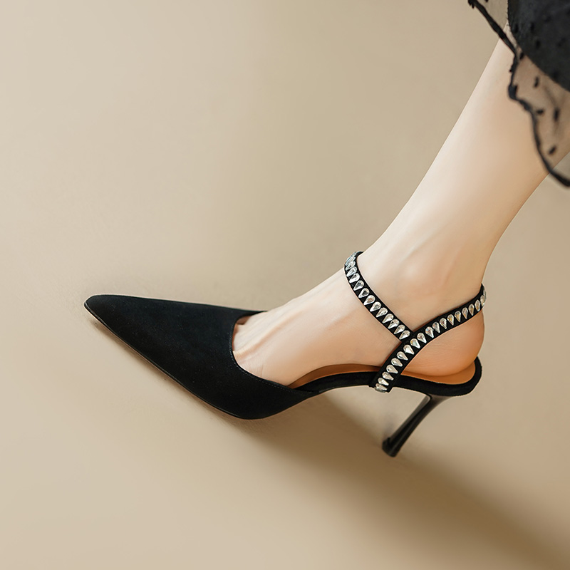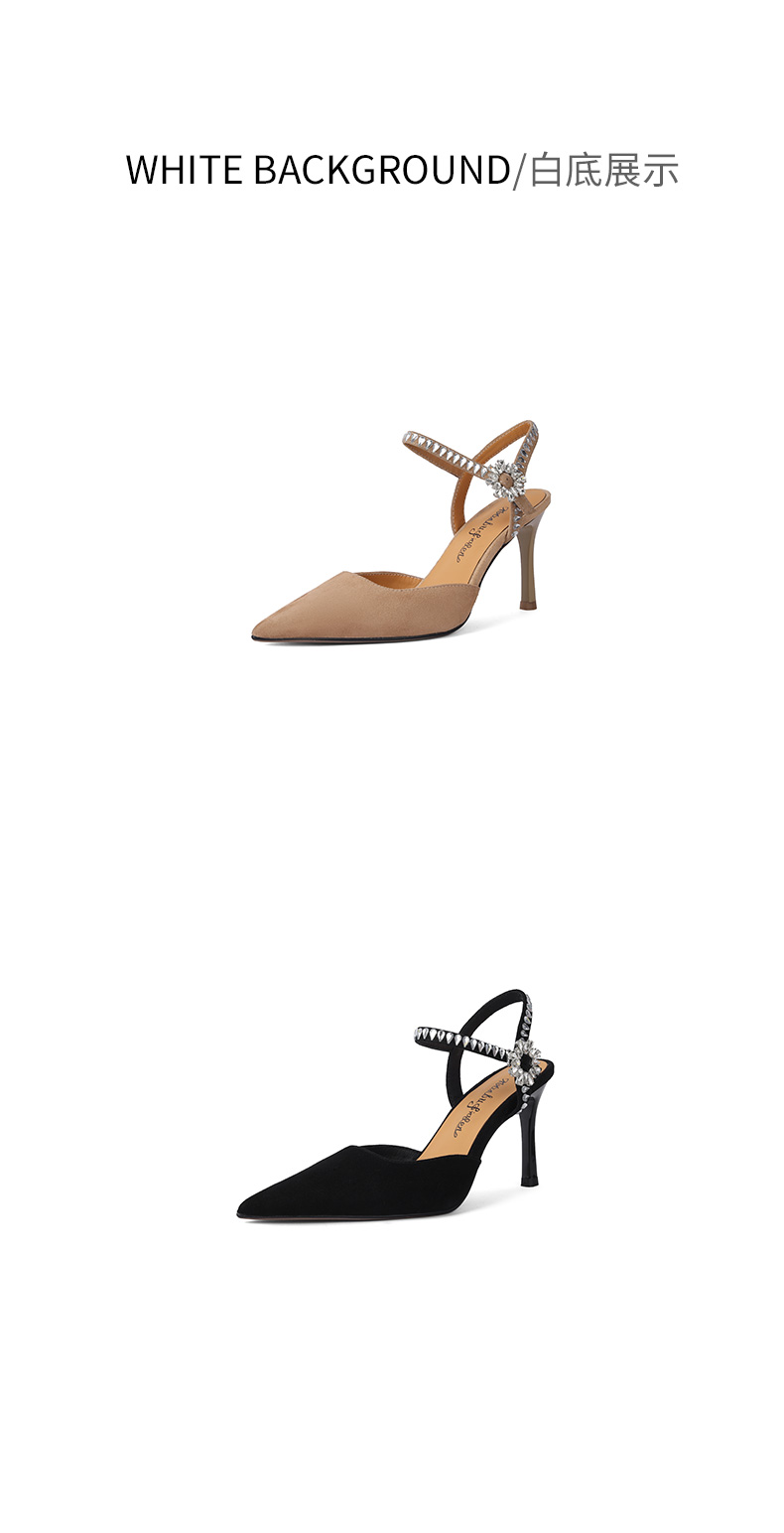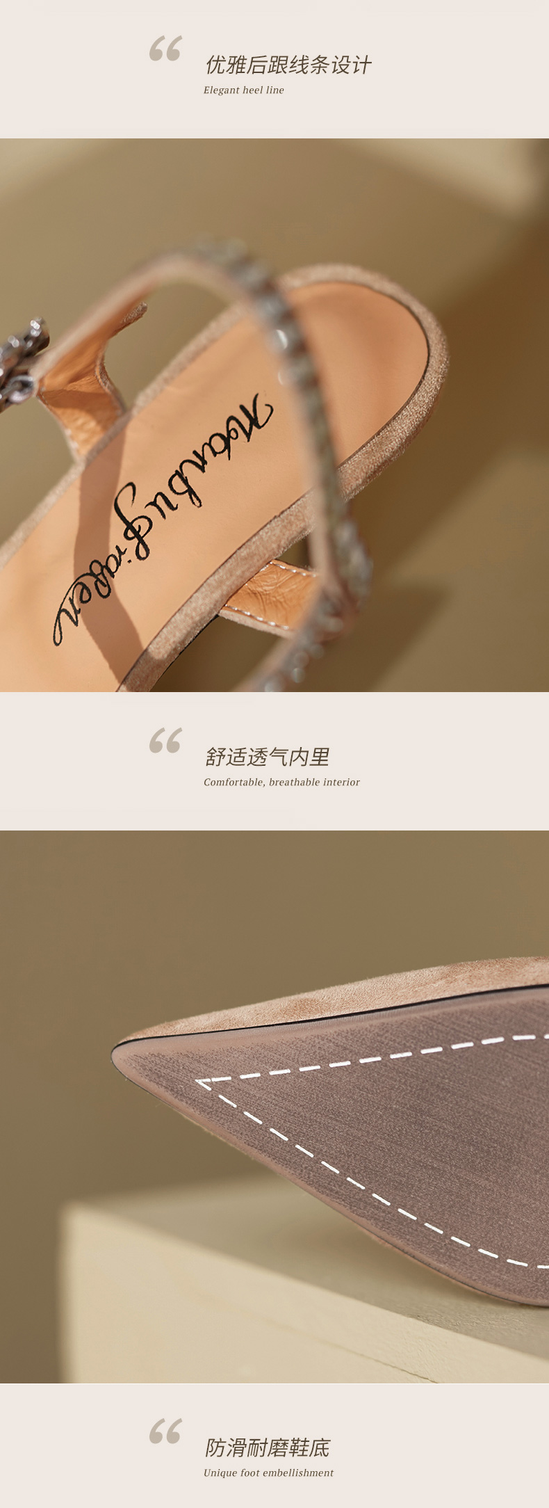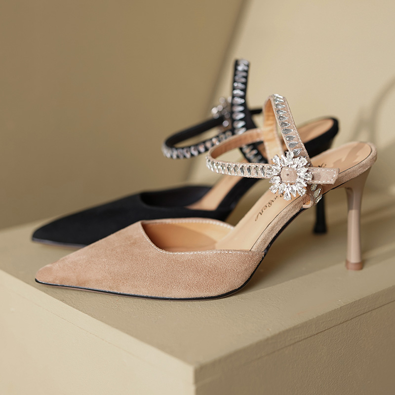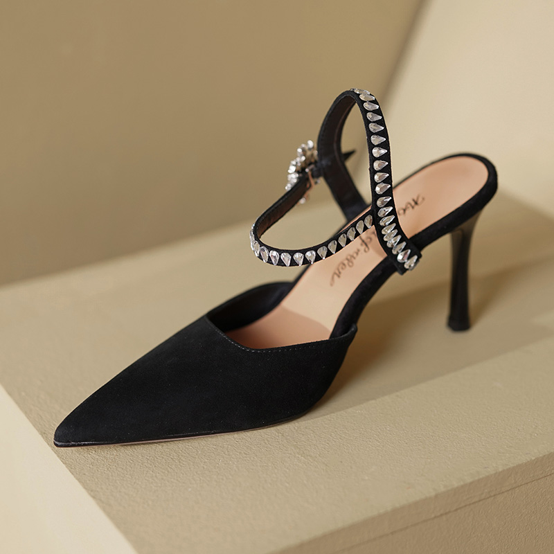 【预售5天】羊翻皮包头后空凉鞋女夏季新款女鞋欧美尖头水钻一字扣高跟鞋FDJ&YC--088
