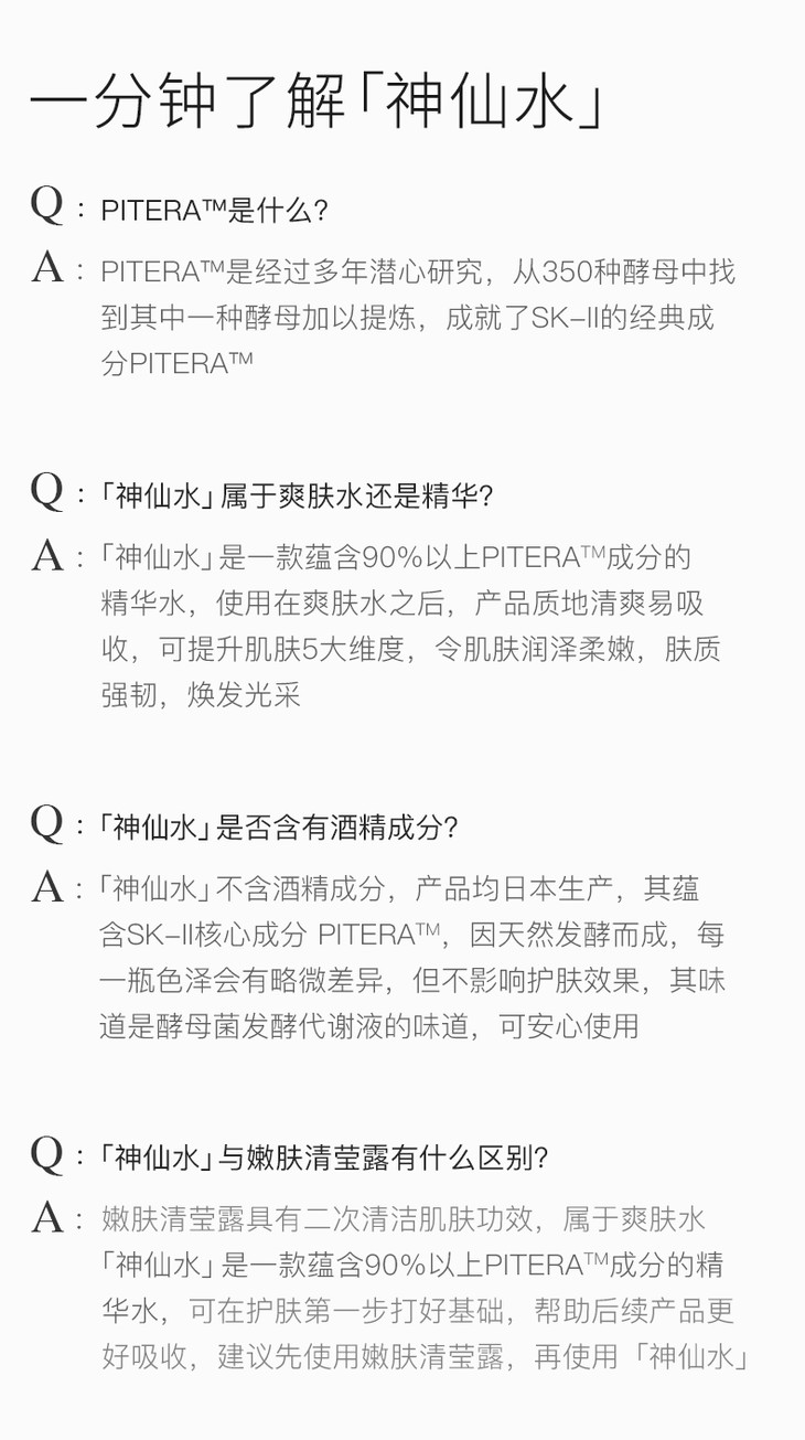 神仙水❤ 无人不知的SK2神仙明星们的最爱㊙ 号称油性/混合皮肤的亲妈,让你皮肤由内而外变好变亮,果然名不虚传。😍 每3秒就有一瓶神仙水被卖出,简直是化妆水界的TOP💯 含有高达90%以上的PITERA天然酵母,能快速渗入肌肤底层🉐 充足营养滋润肌肤,深层保湿,收缩毛孔、修复红血丝、能温和地清除老化角质细胞💓 祛除暗黄、美白淡斑、淡化黑色素、均匀肤色,减淡细纹及皱纹💯 肌肤变得更细滑、更紧致‼️(330ML有泵头,其余没有。)