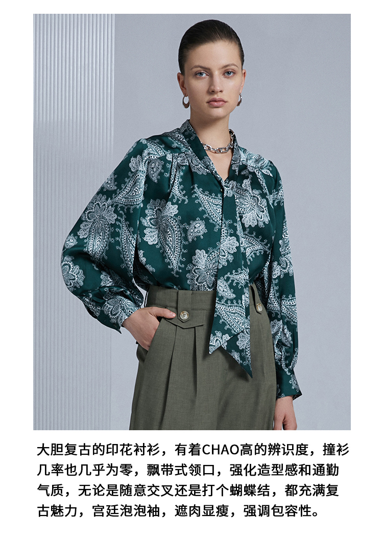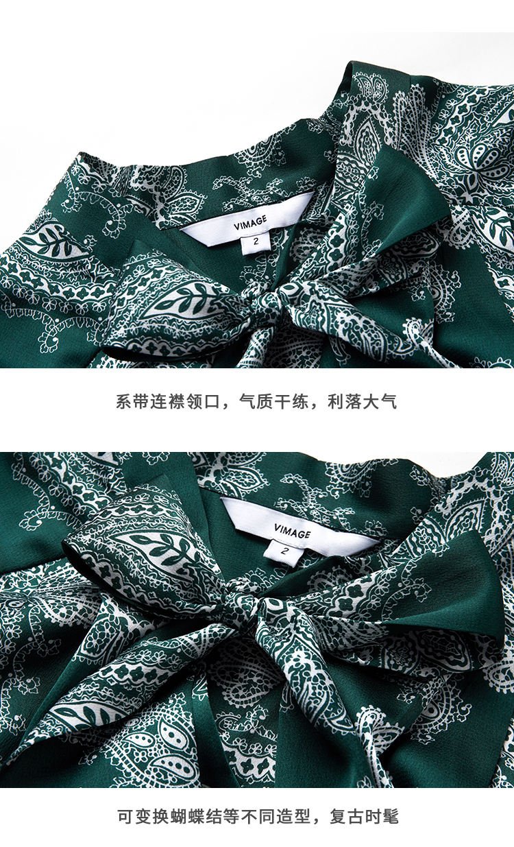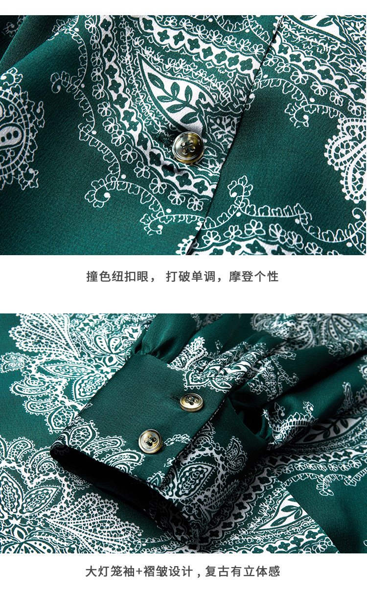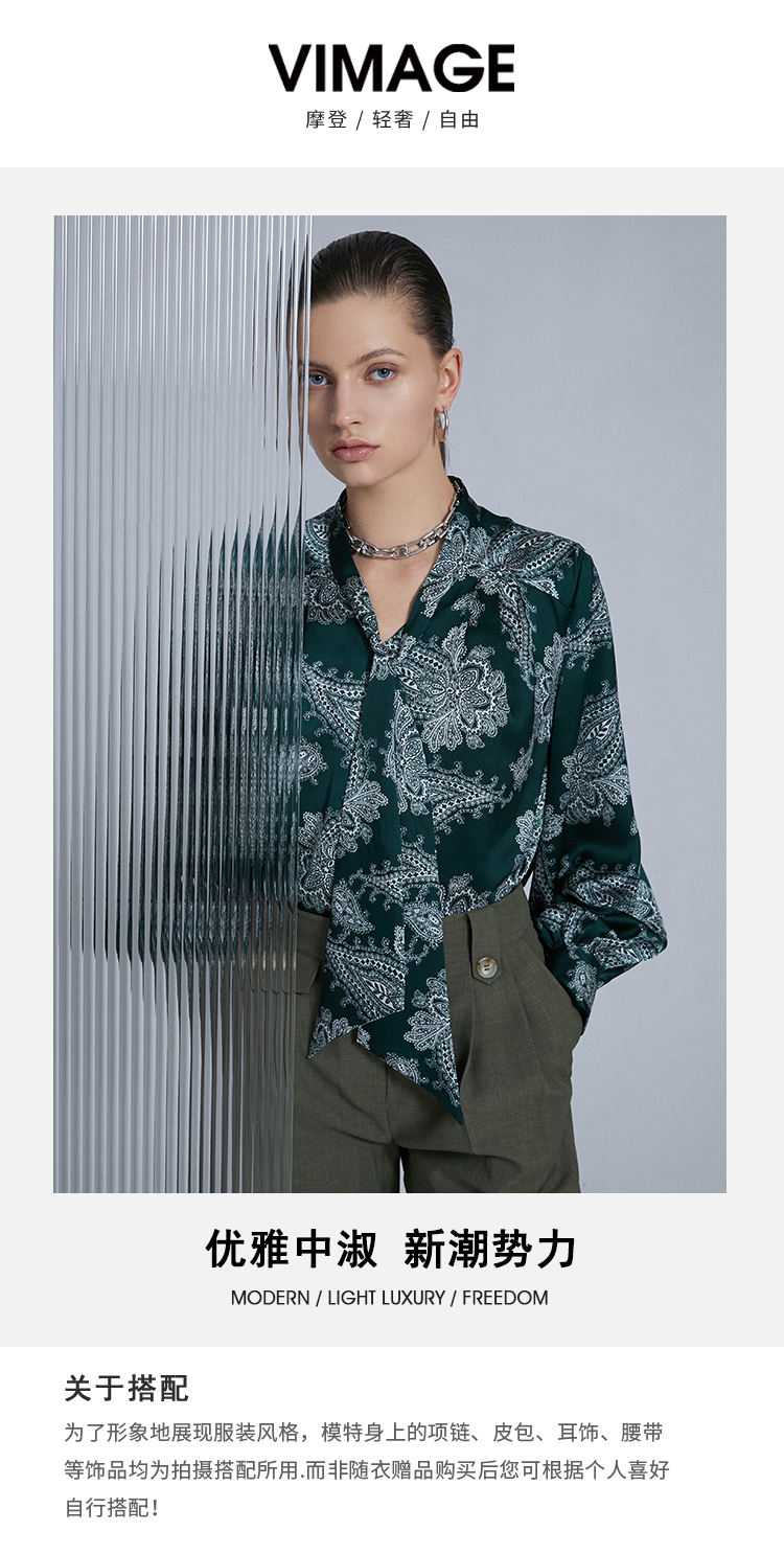 VIMAGE纬漫纪立领花色上衣印花宽松复古长袖衬衫衬衣V1509104