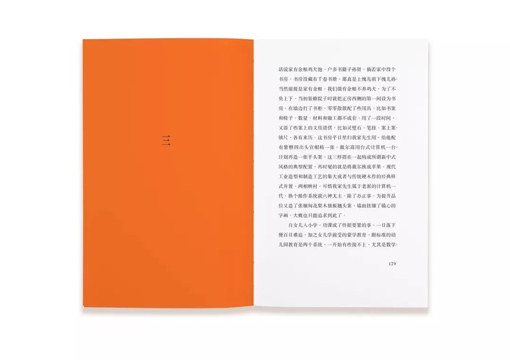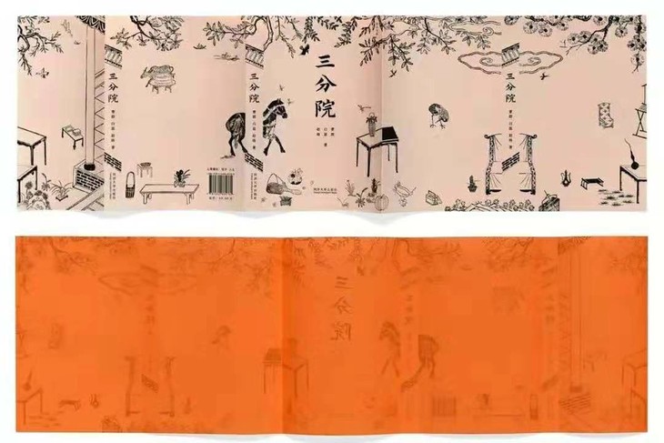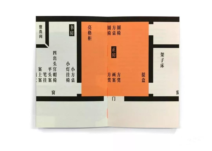 “我们将古籍版画中的图形提取出来,借由屏风的视觉转换方式重组,以书籍形态和翻阅方式形成或独立或关联的视觉画面。作为场景转换的提示,标注了院子植物与家具文字信息的平面图贯穿全书。在内页中交替使用的两种纸,精致与粗糙的质感是对院子生活的回应。明透的橘色,是我们第一次到访院子时的视觉印象——洒落的阳光与金红的柿子。”