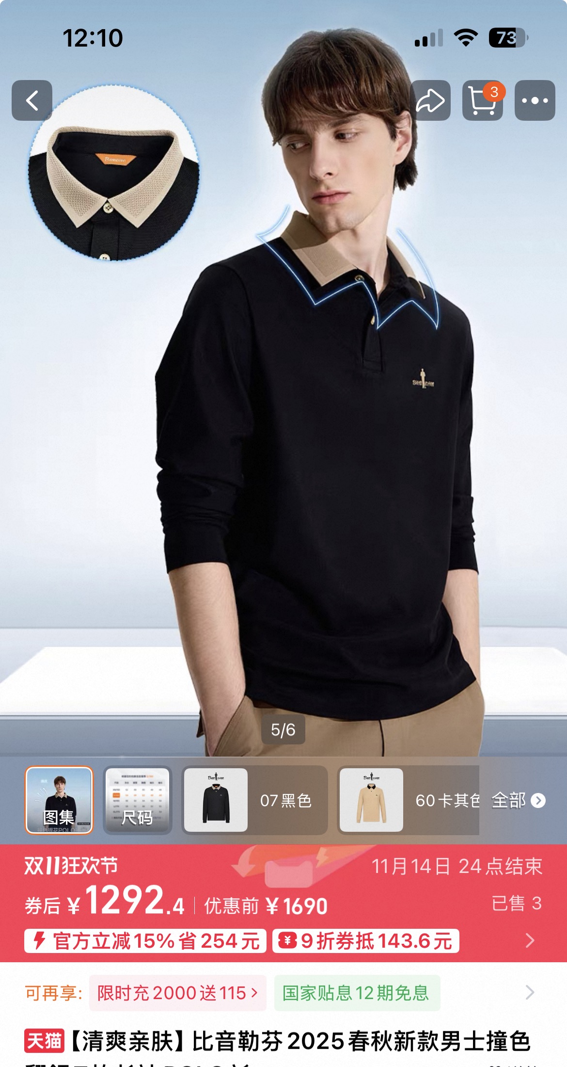 点此购买 比音勒芬秋冬季男士加绒螺纹领长袖POLO衫 ss 338206