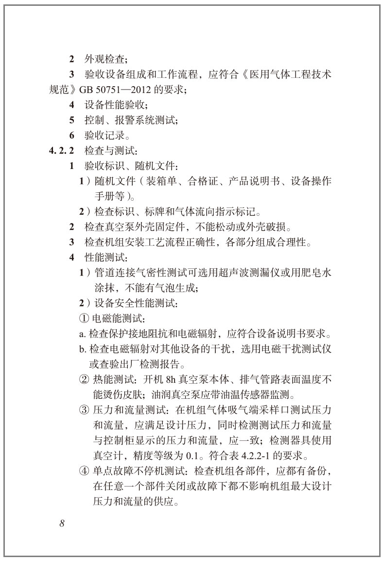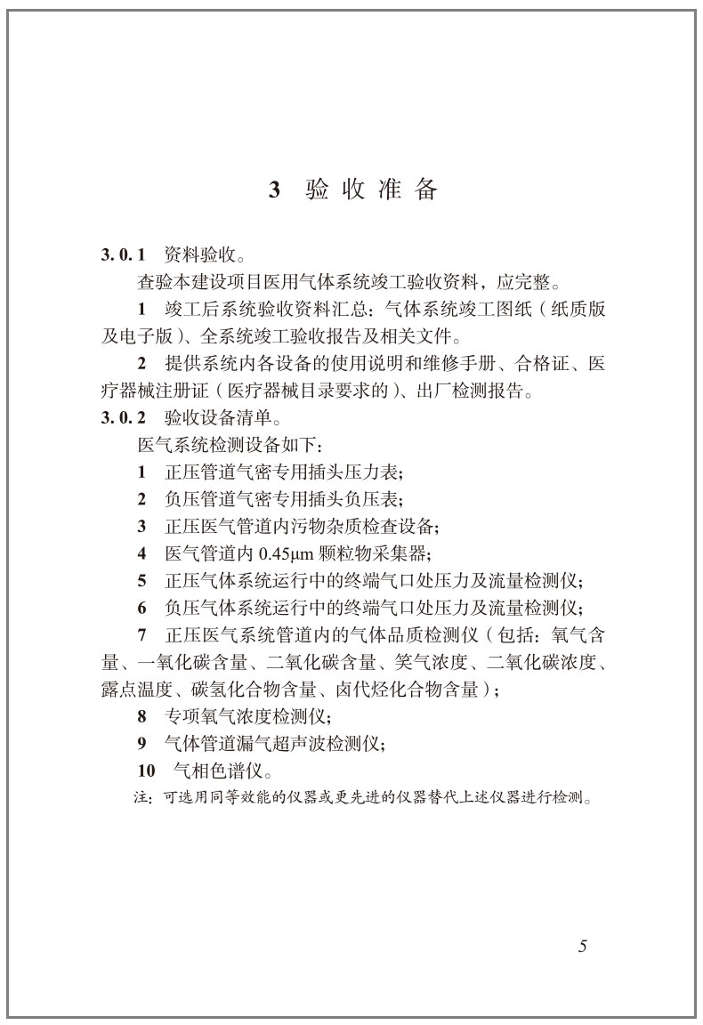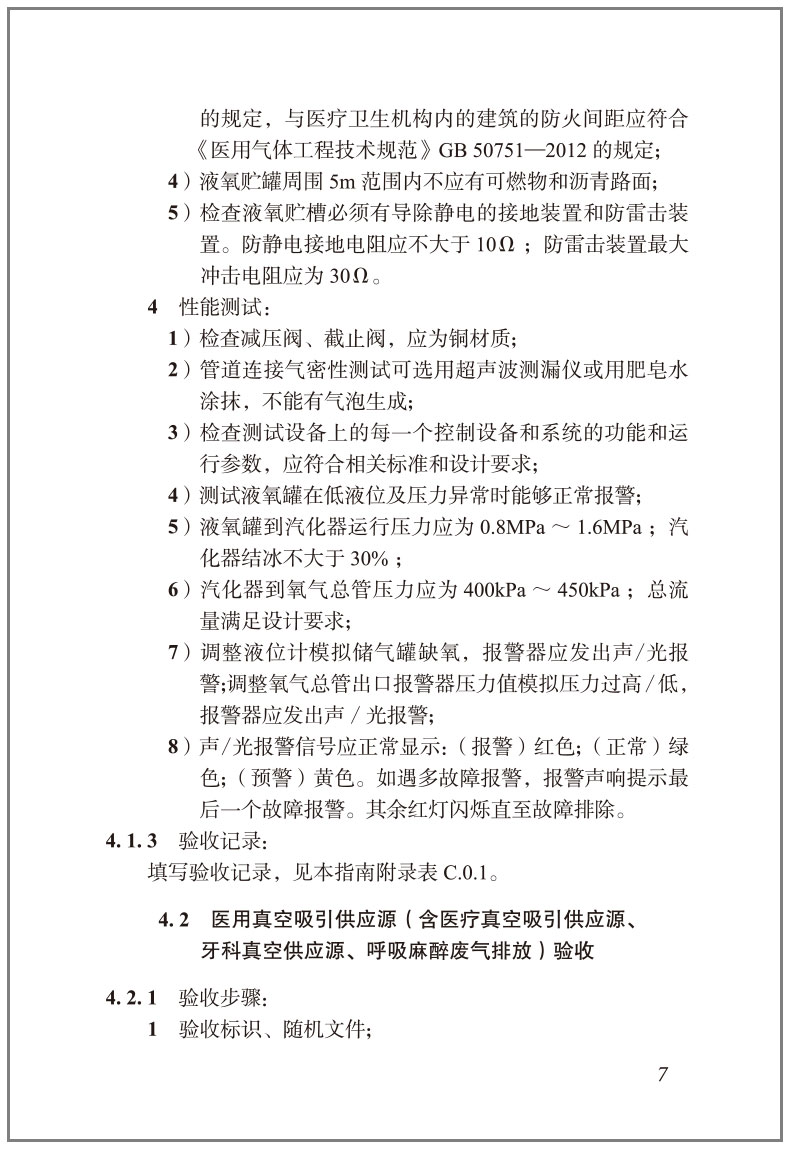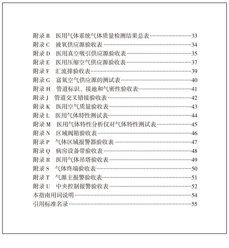 总 则\t1 术语和定义\t2 第一章 验收准备\t5 一、资料验收\t5 二、验收设备清单\t5 第二章 供气源验收\t6 一、液氧供应源验收\t6 二、医用真空吸引供应源(含医疗真空吸引供应源、牙科真空供应源、呼吸麻醉废气排放)验收\t7 三、医用压缩空气供应源(含医疗压缩空气机组、医疗器械用压缩空气机组、牙科压缩空气机组)验收\t9 四、汇流排验收\t11 五、富氧空气供应源验收\t13 第三章 管道系统验收\t15 一、标识验收\t15 二、管道性能验收\t16 三、气体质量验收\t18 四、区域阀箱\t19 第四章 病区医用气体系统验收\t20 一、气体区域报警器验收\t20 二、病房设备带验收\t21 三、医用气体吊塔验收\t22 第五章 报警联动验收\t26 一、气源主报警验收\t26 二、中央控制报警验收\t26 引用标准\t28