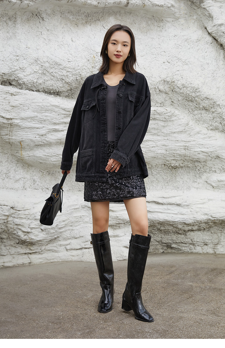 黑灰做旧牛仔半身裙女 高腰直筒中裙 复古显瘦遮胯 A 字裙